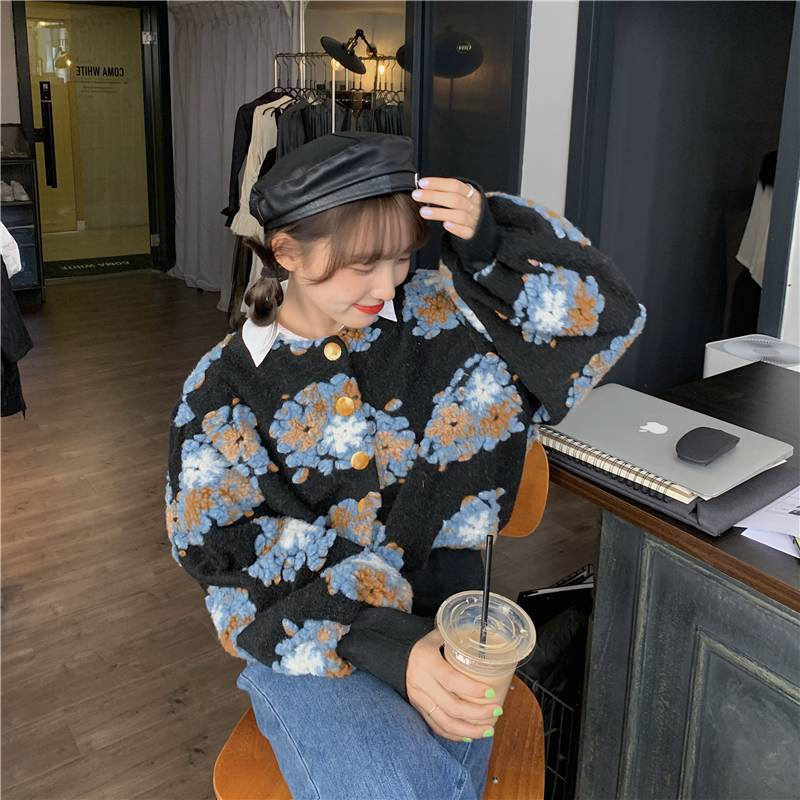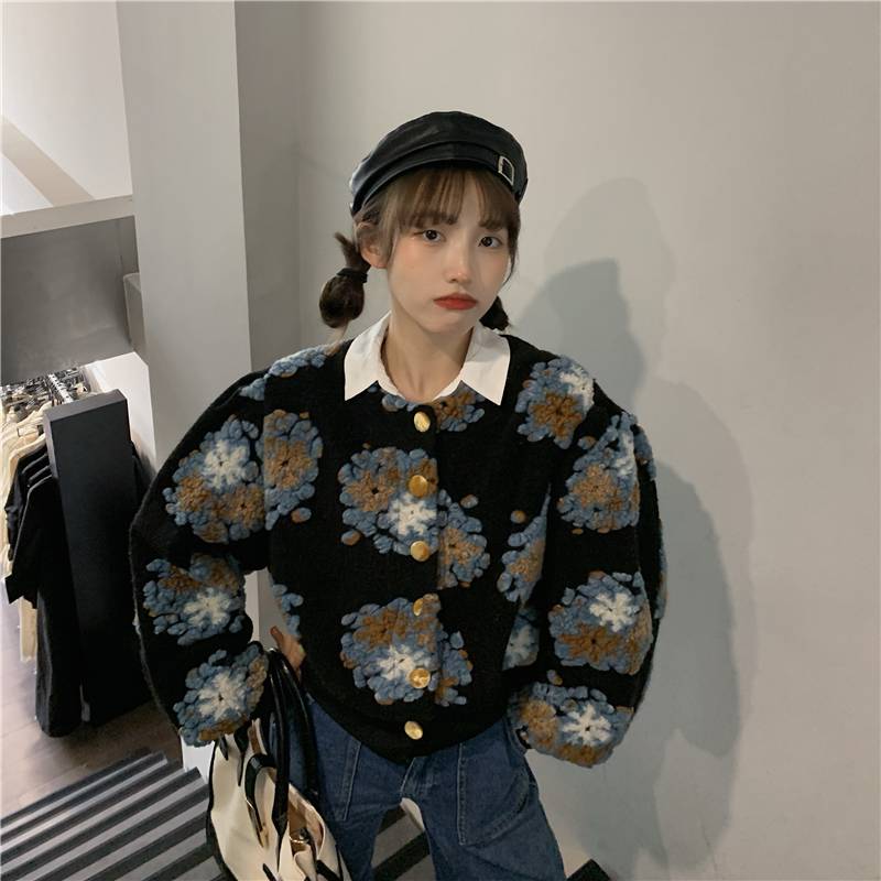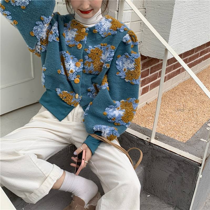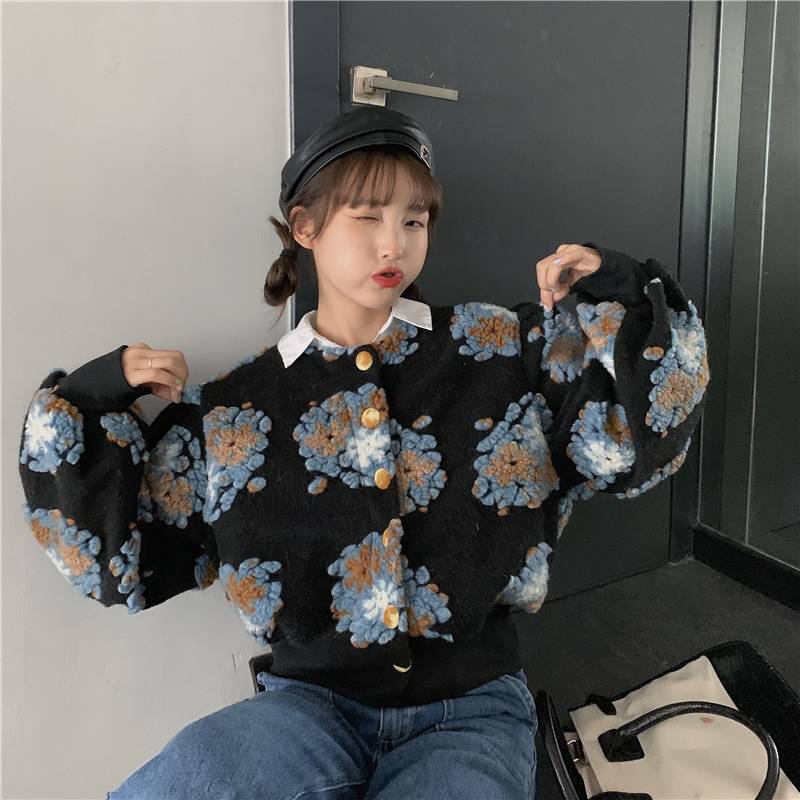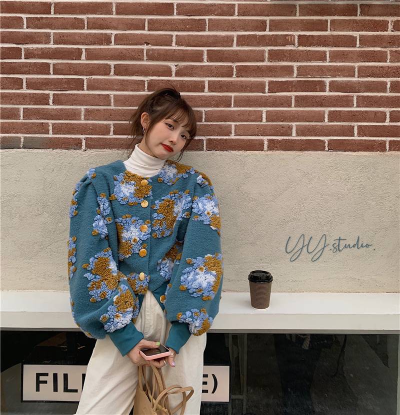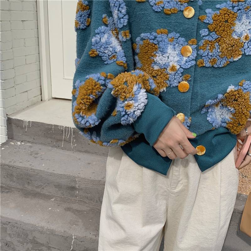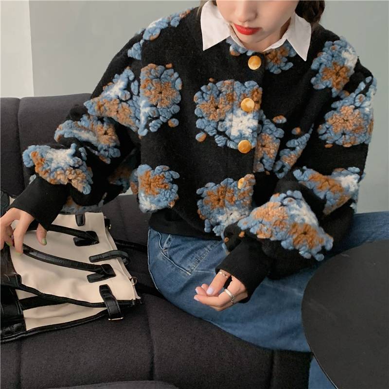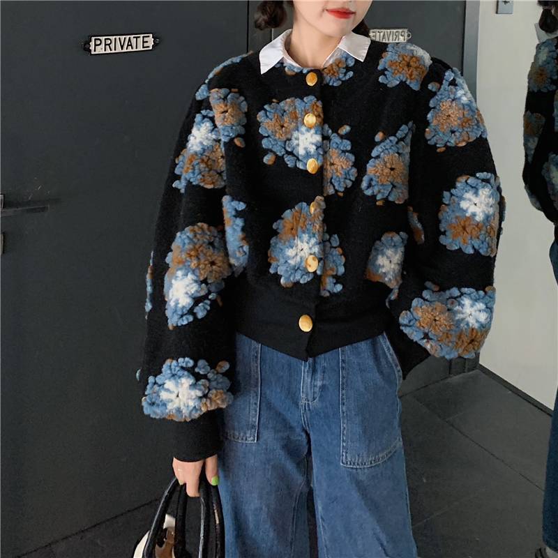 トップス レディース カーデガン 花柄 ボア おしゃれ 大人可愛い 長袖 個性的 レトロ ガーリー 大きめ オーバーサイズ きれいめ アウター ジャケット ジャンパー ボタン 華やか 青 黒 襟なし