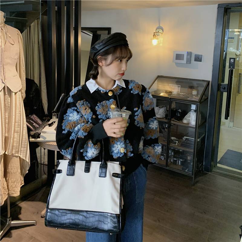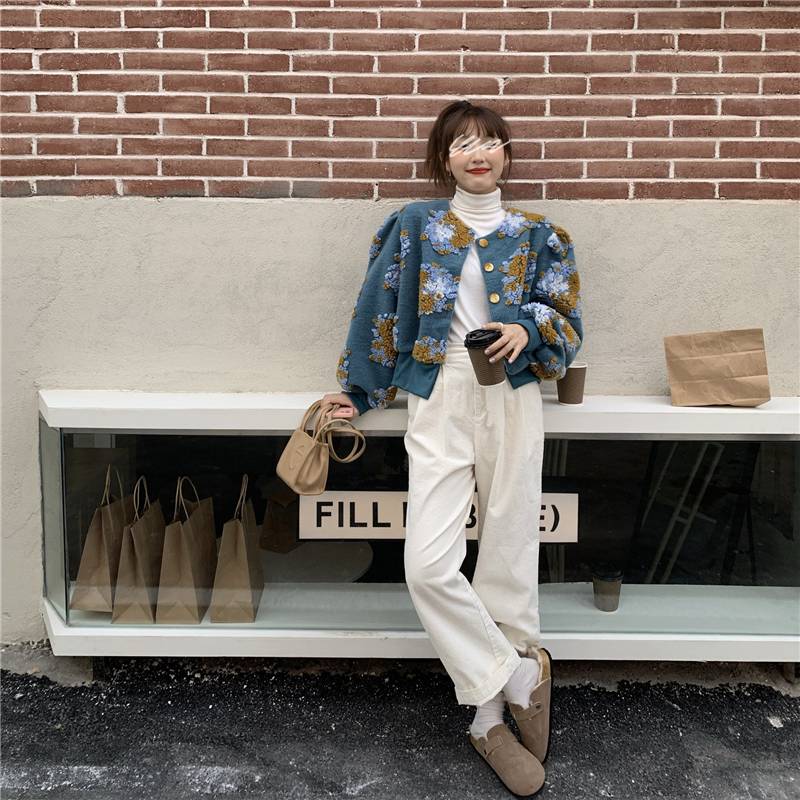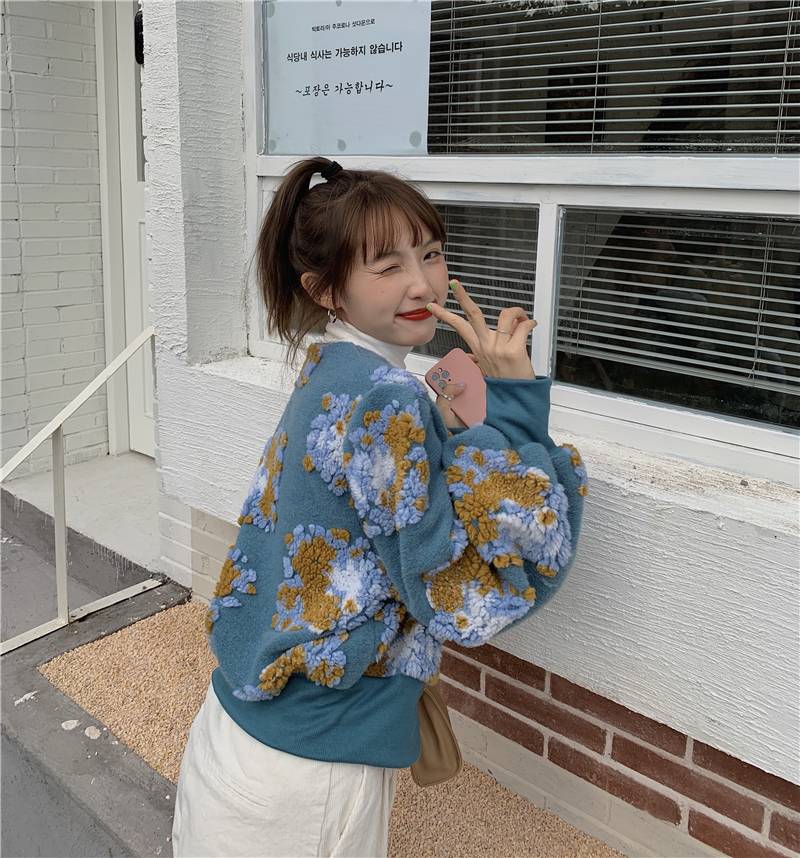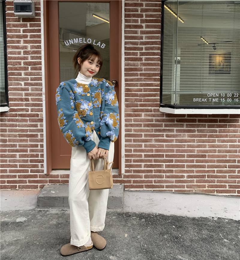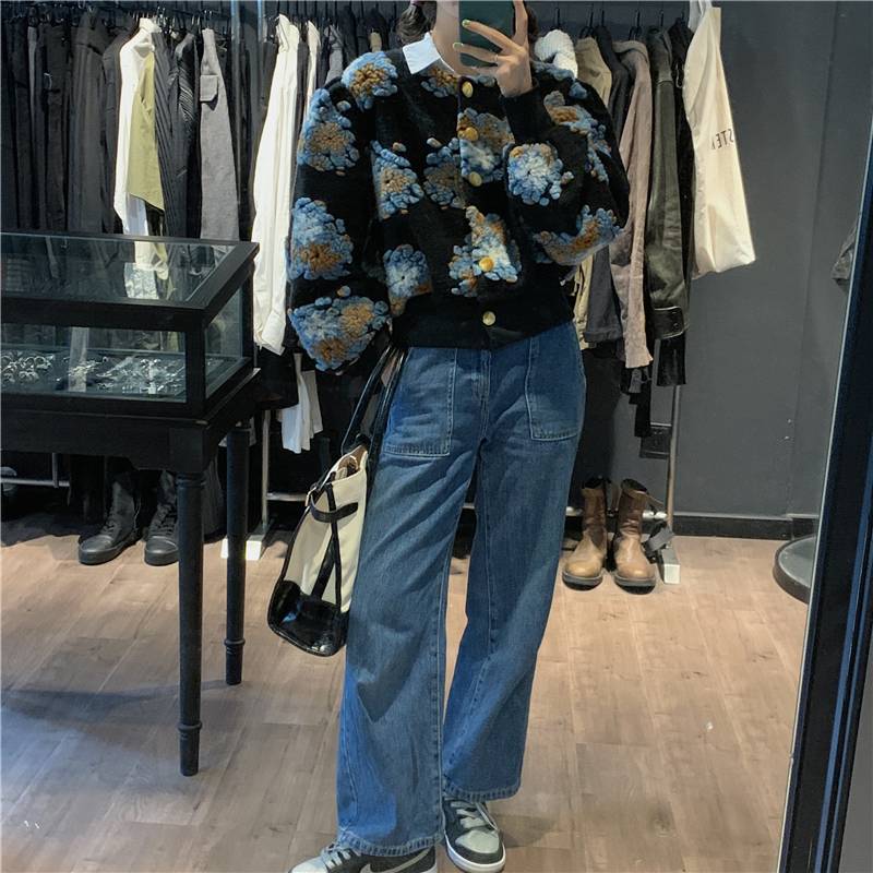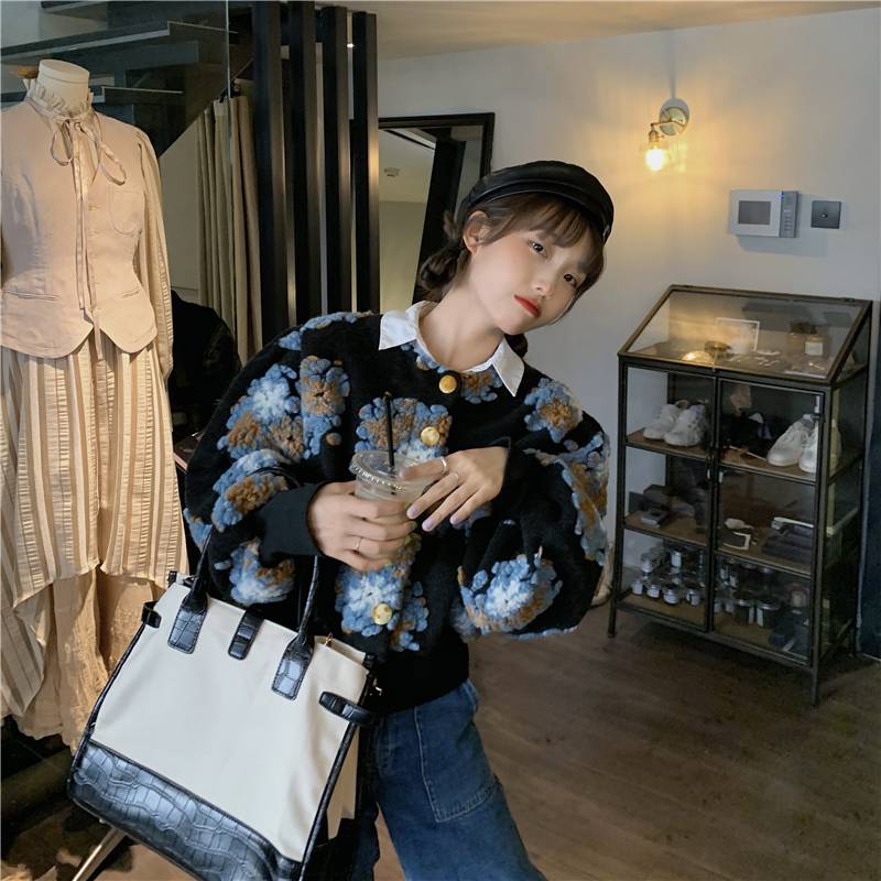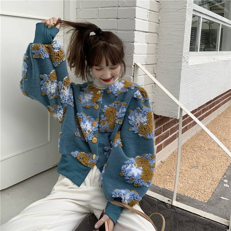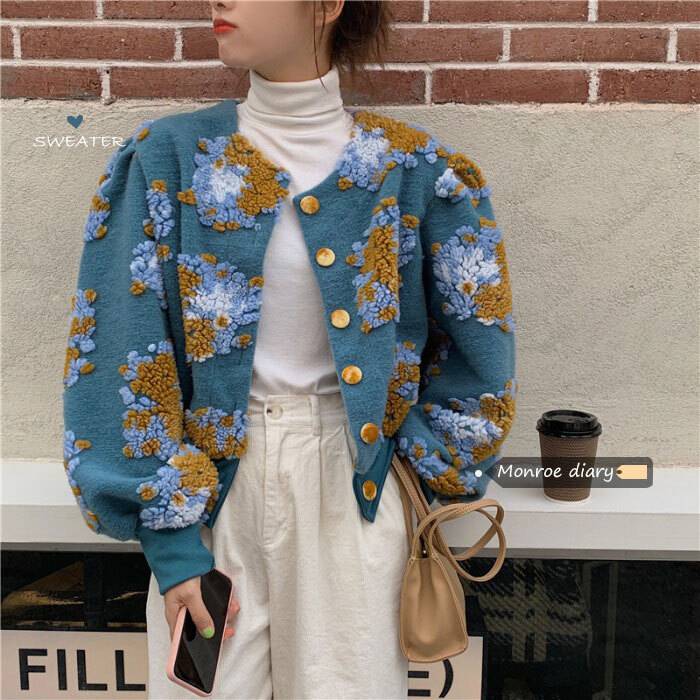 トップス レディース カーデガン 花柄 ボア おしゃれ 大人可愛い 長袖 個性的 レトロ ガーリー 大きめ オーバーサイズ きれいめ アウター ジャケット ジャンパー ボタン 華やか 青 黒 襟なし