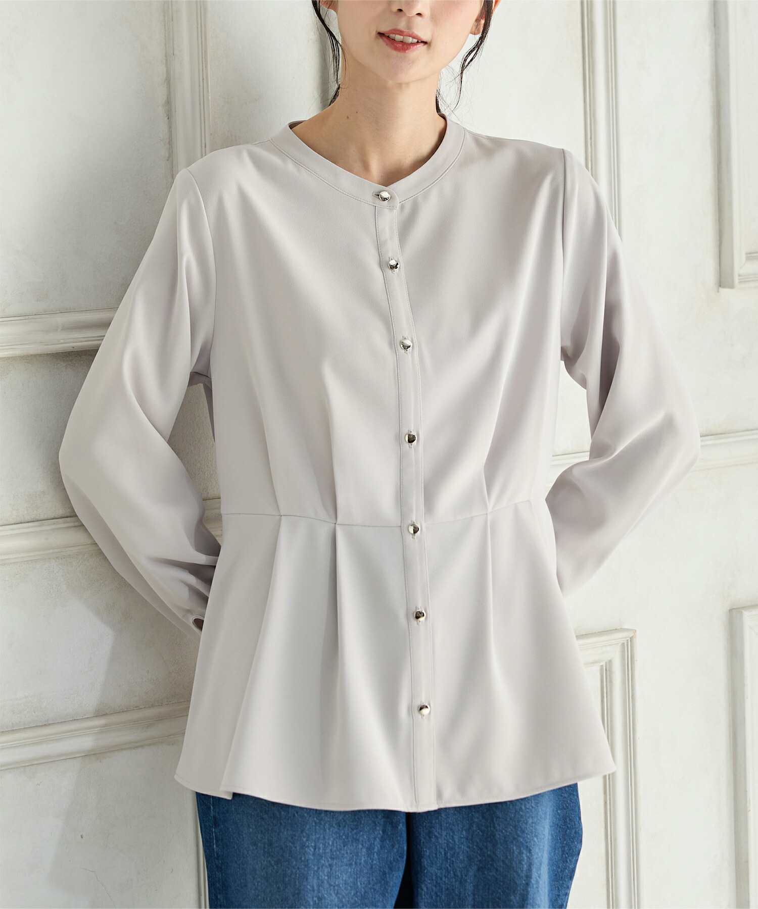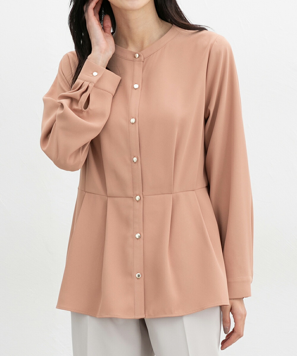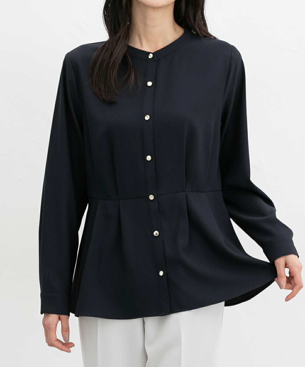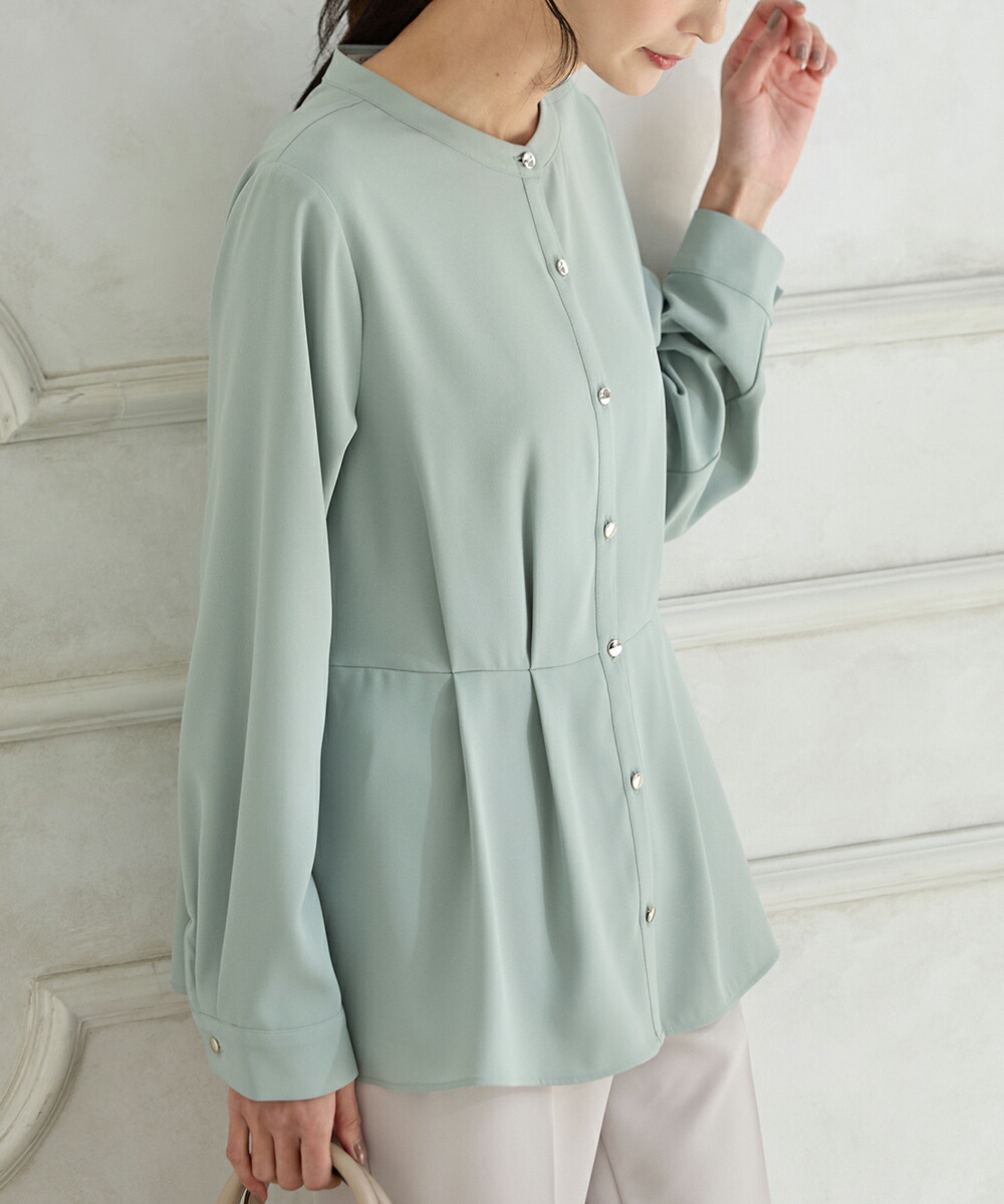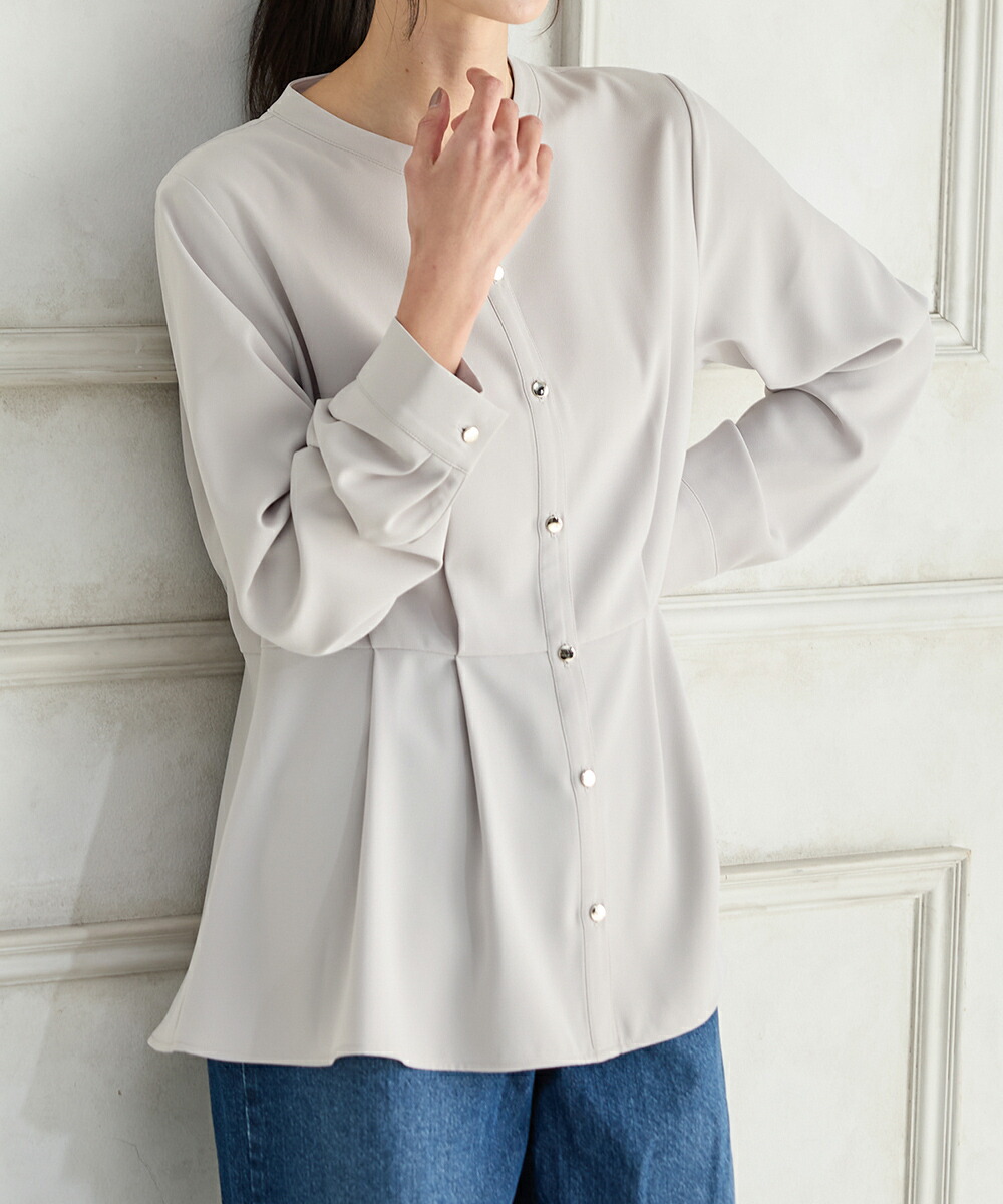 優しい印象のバンドカラーデザインにゴールドボタンでさりげない華やかさをプラス。