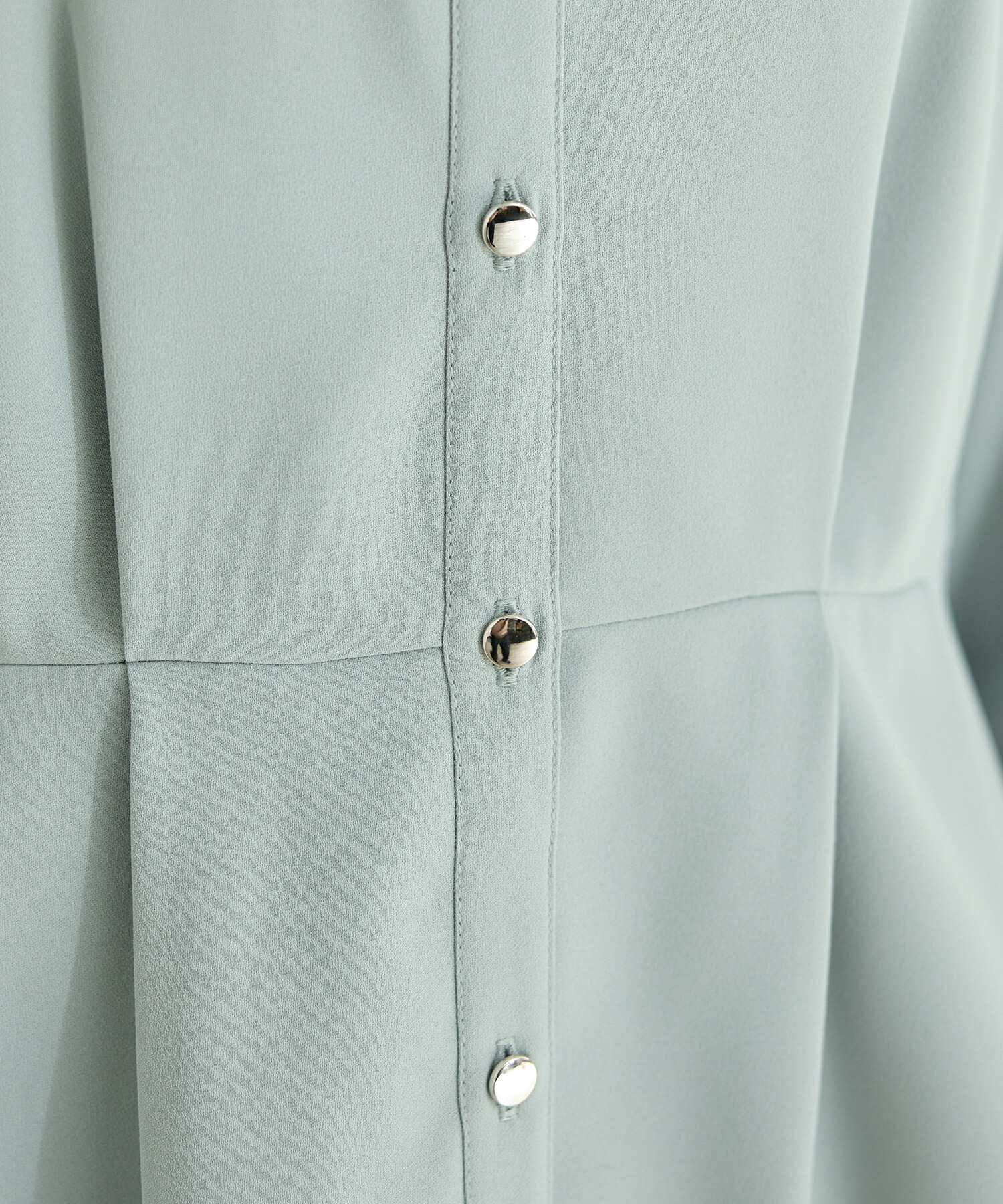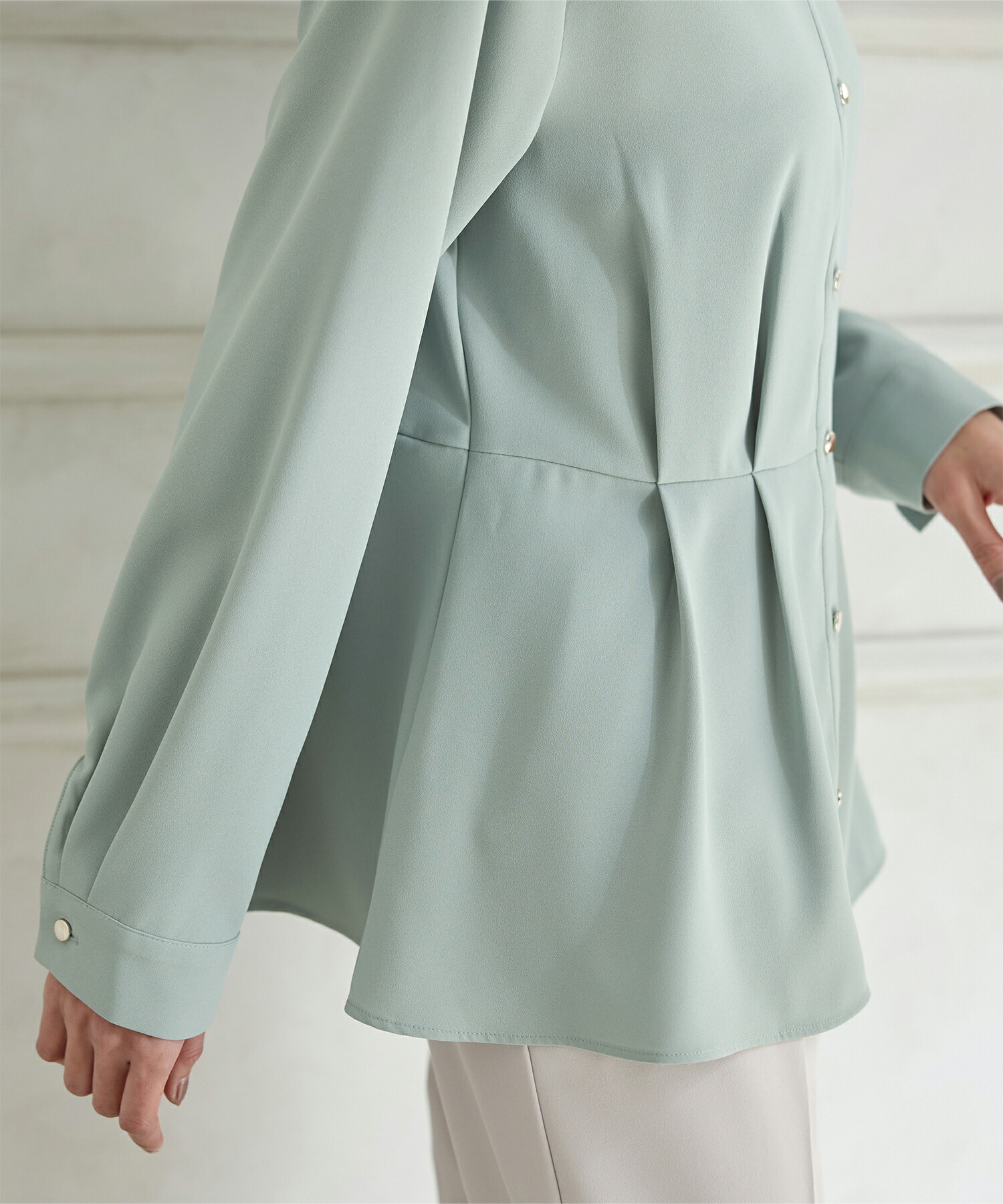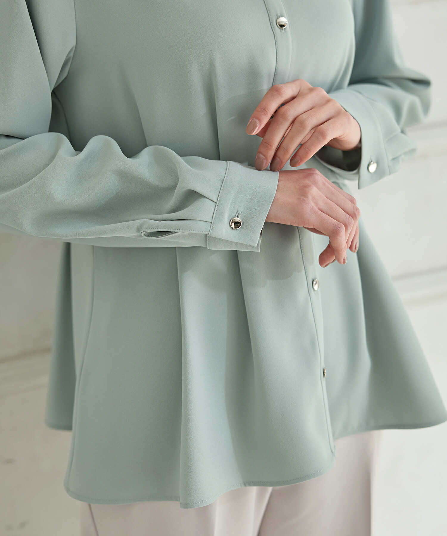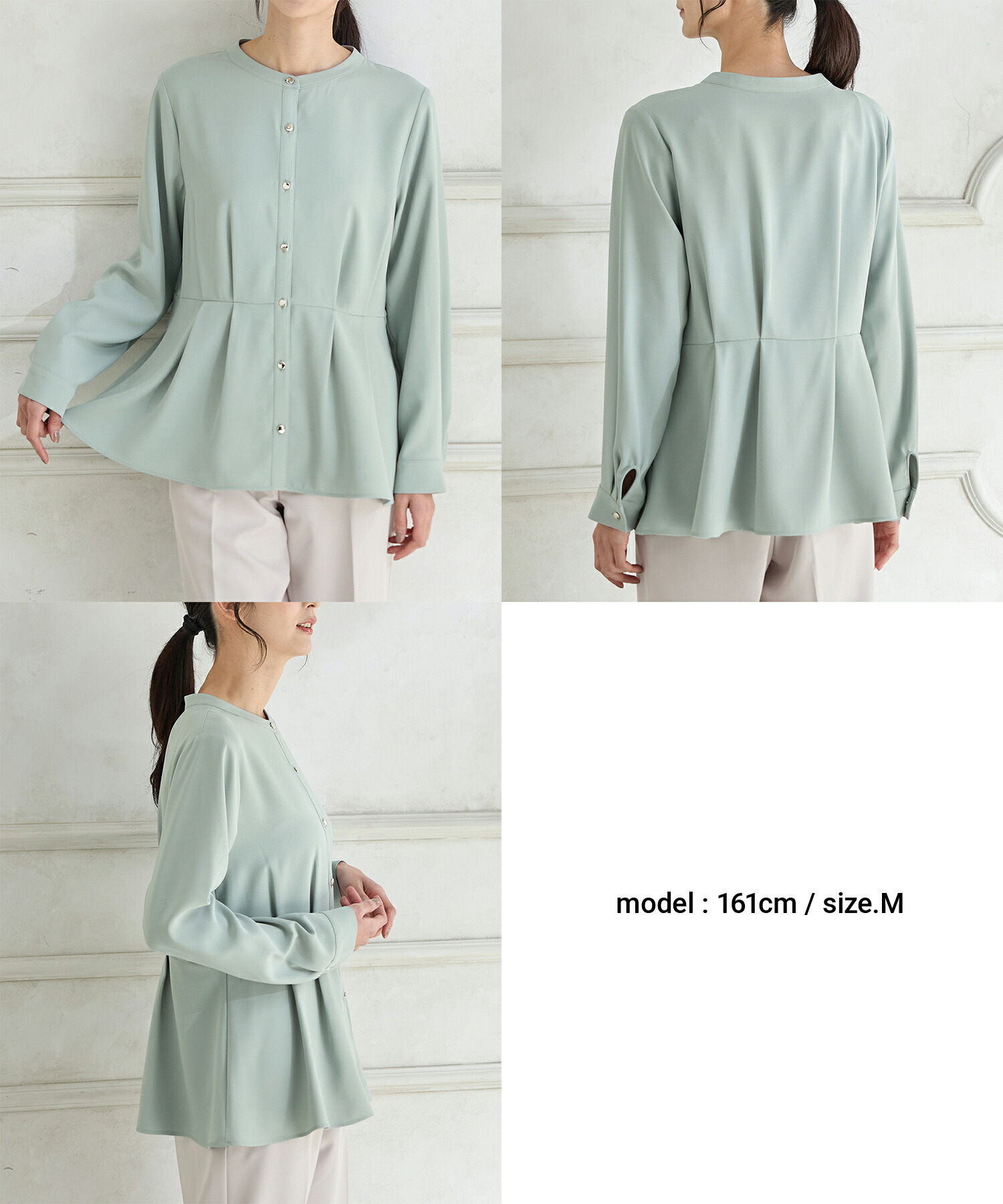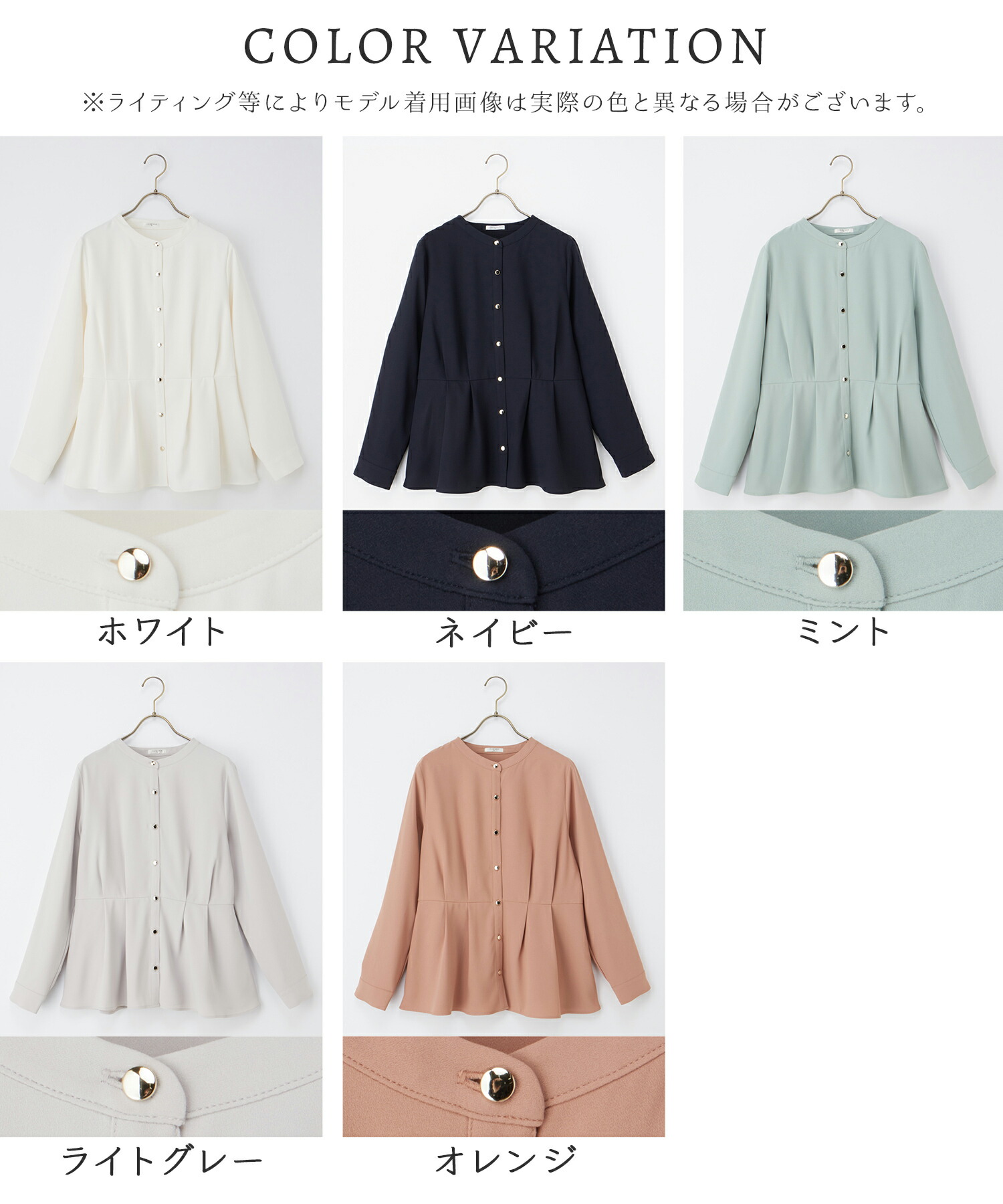 優しい印象のバンドカラーデザインにゴールドボタンでさりげない華やかさをプラス。