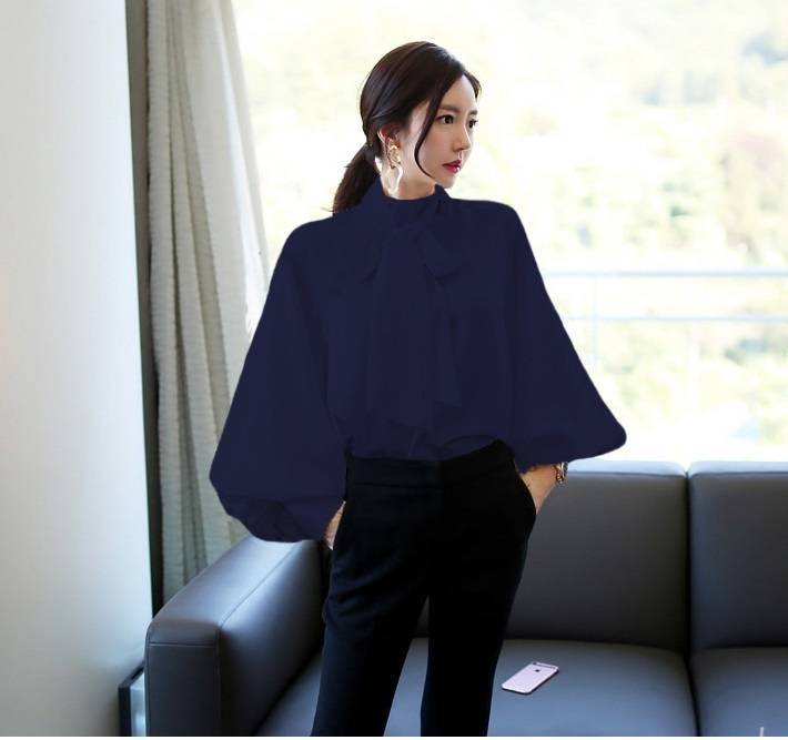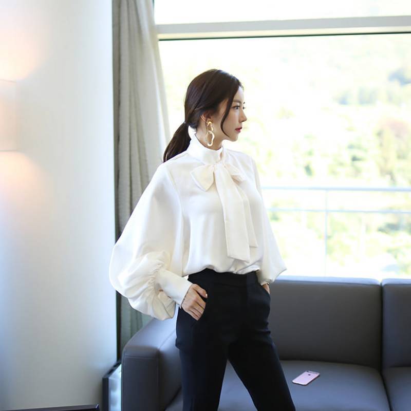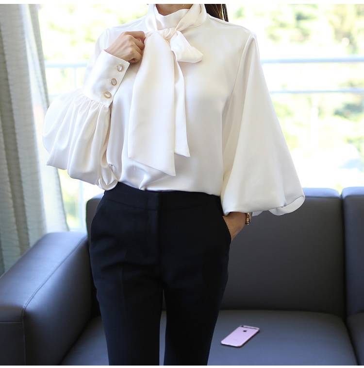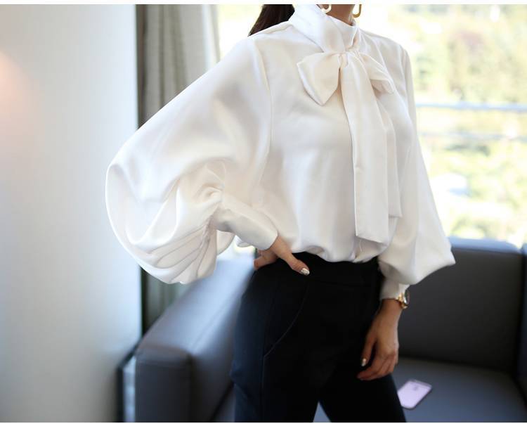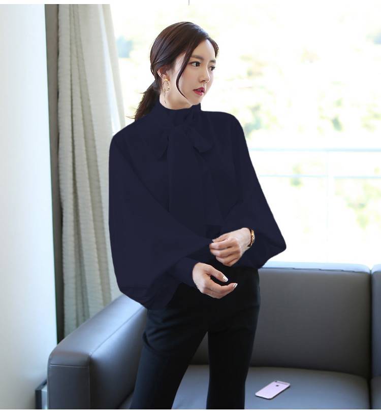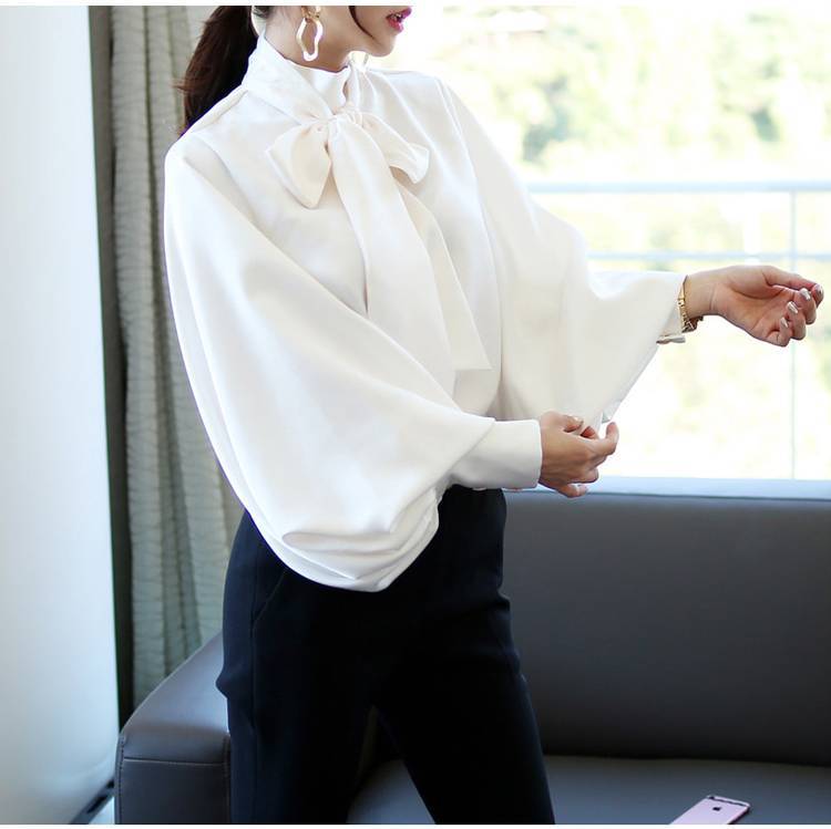 トップス ブラウス レディース シャツ シャツブラウス 白ブラウス 長袖 スタンドカラー ボウタイ リボン ランタンスリーブ ボリューム袖 ホワイト ネイビー カーキ エレガント 細見え OL 上品