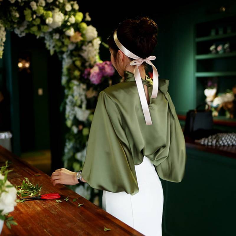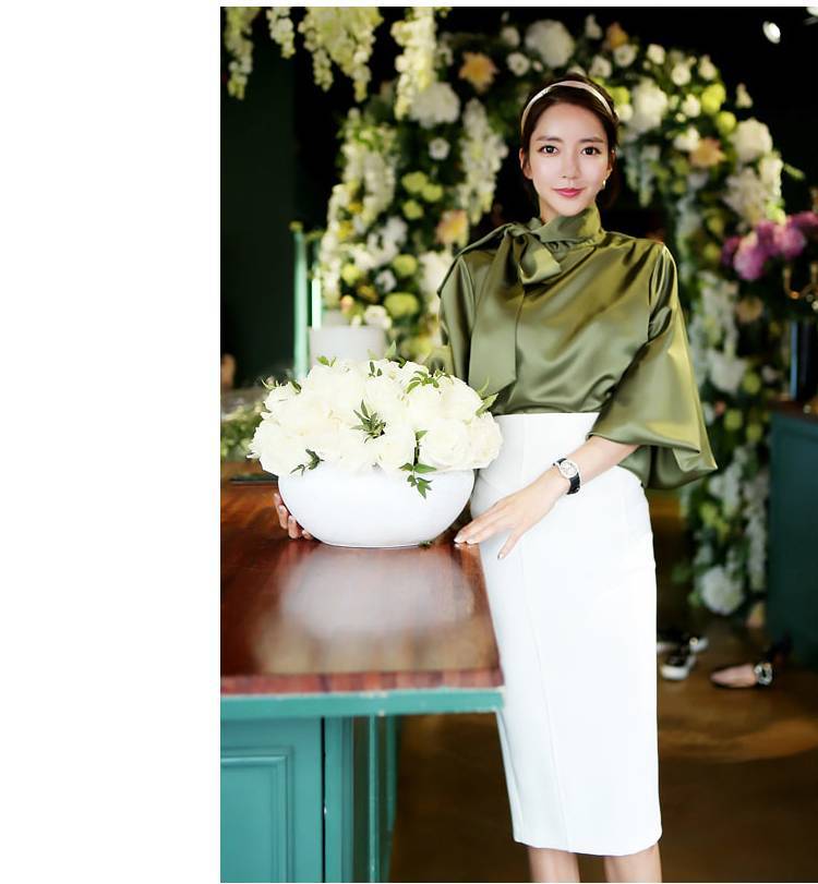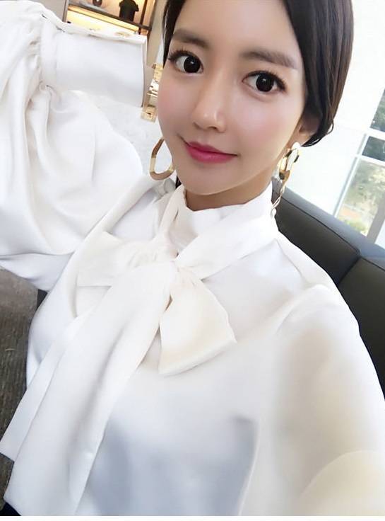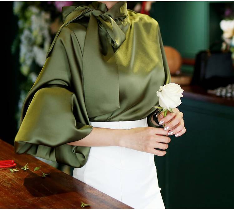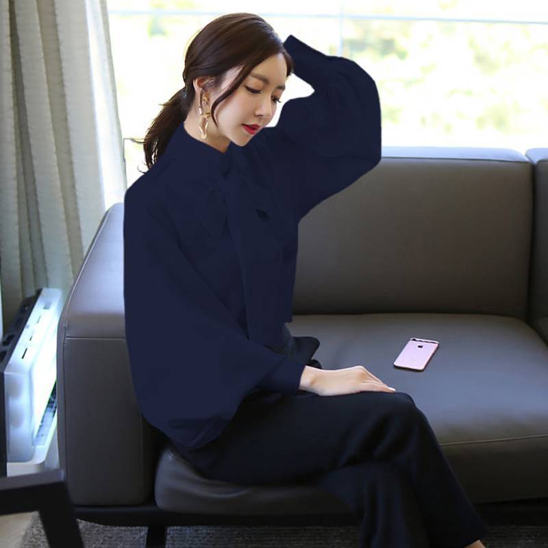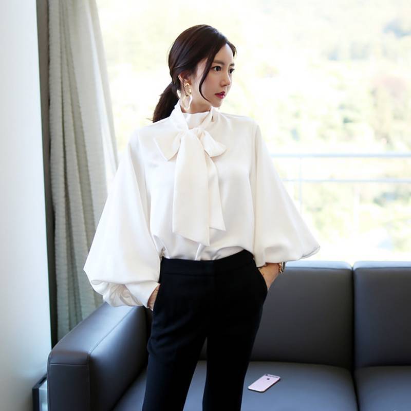 トップス ブラウス レディース シャツ シャツブラウス 白ブラウス 長袖 スタンドカラー ボウタイ リボン ランタンスリーブ ボリューム袖 ホワイト ネイビー カーキ エレガント 細見え OL 上品