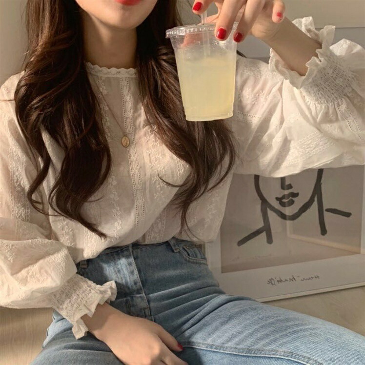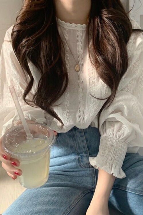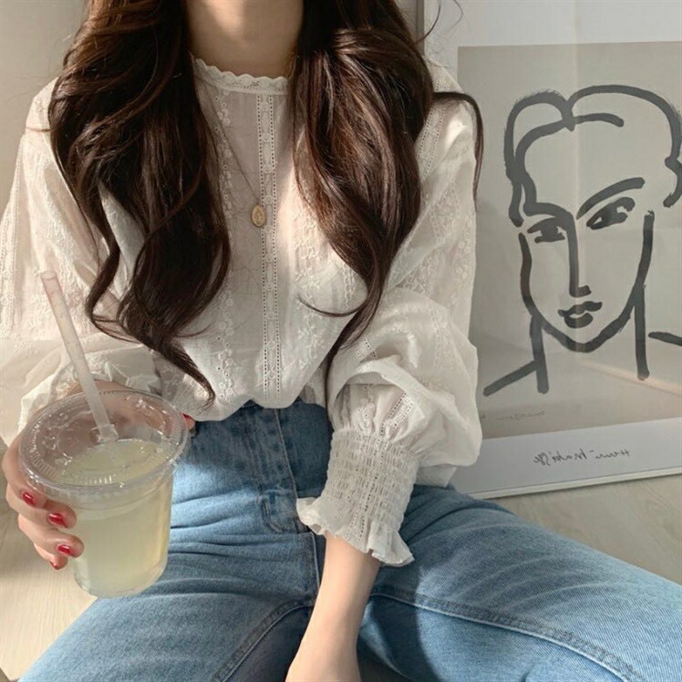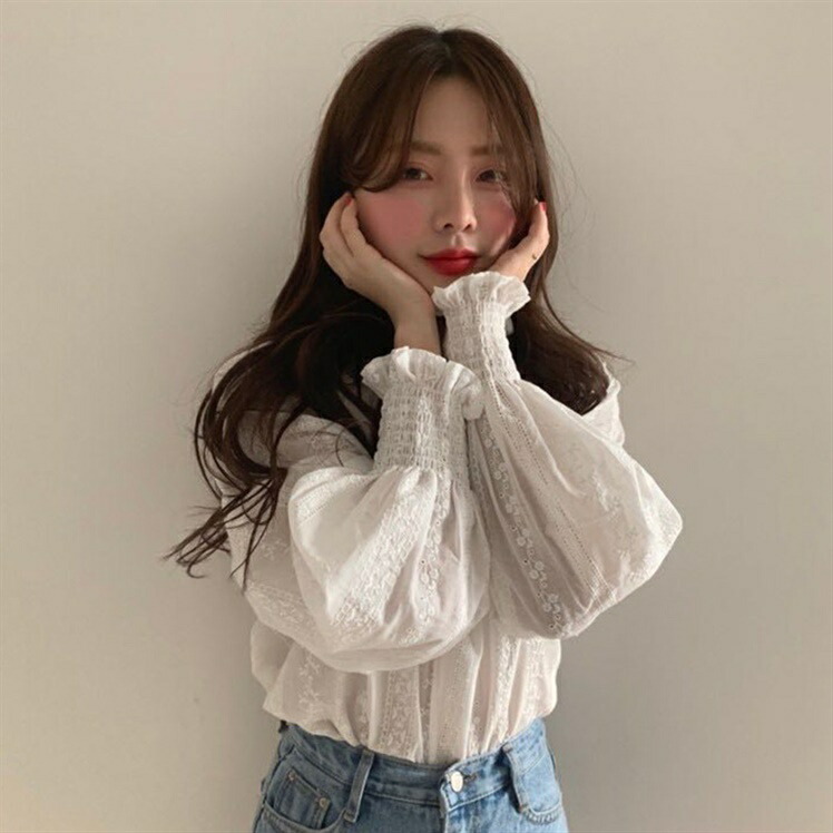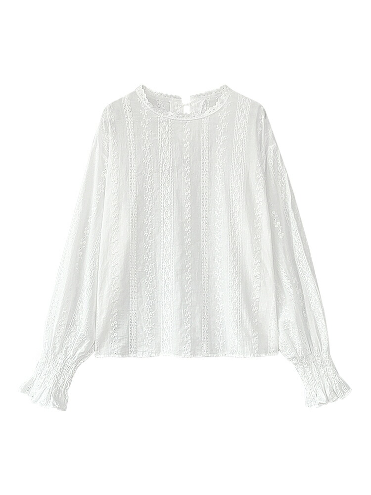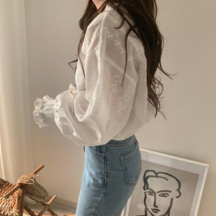 ブラウス レディース トップス シャツ レース プルオーバー ラウンドネック ランタンスリーブ 長袖 韓国 春 秋 大きいサイズ xl 2xl 3xl 4xl 白トップス 透け感 刺繍 ベル 総レース
