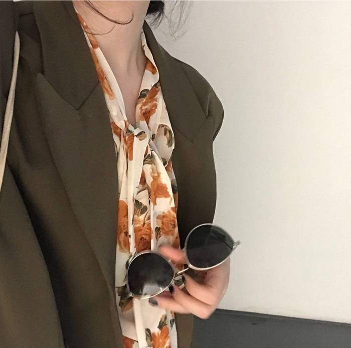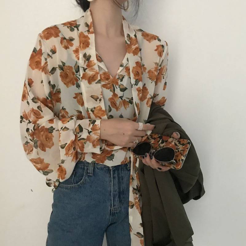 ブラウス レディース トップス シャツ 花柄 レトロ 長袖 春 夏 秋 10代 20代 30代 40代 プルオーバー Vネック フラワー 柄 ボリューム袖 ボウタイ リボン ブラック 黒 ア シフォン