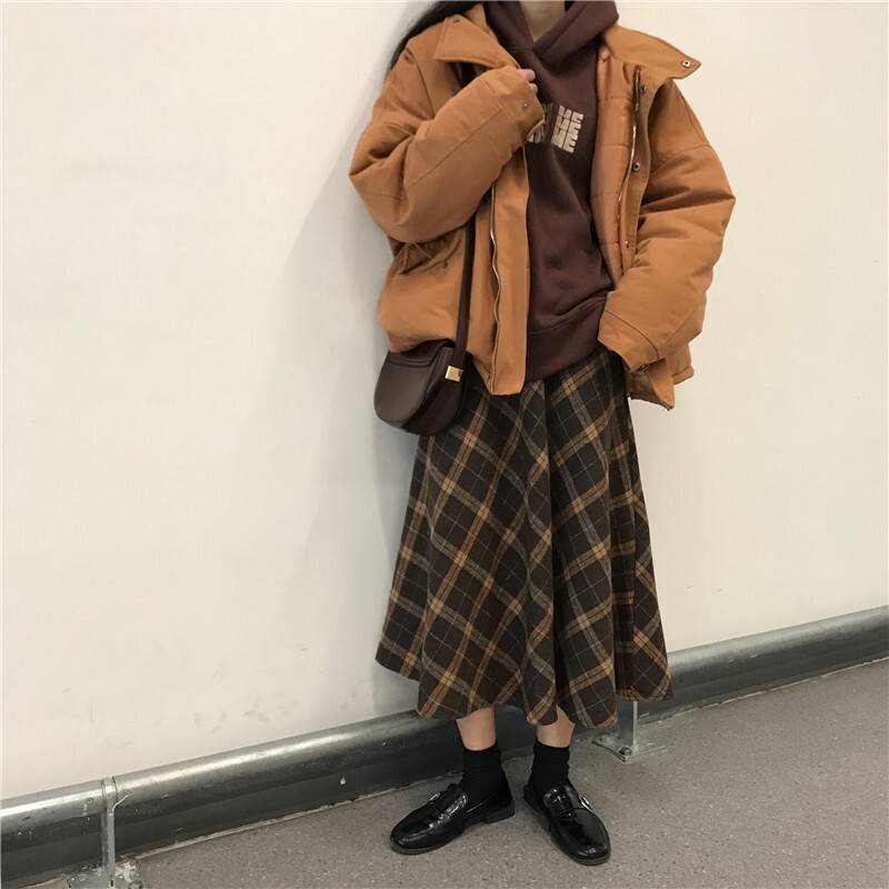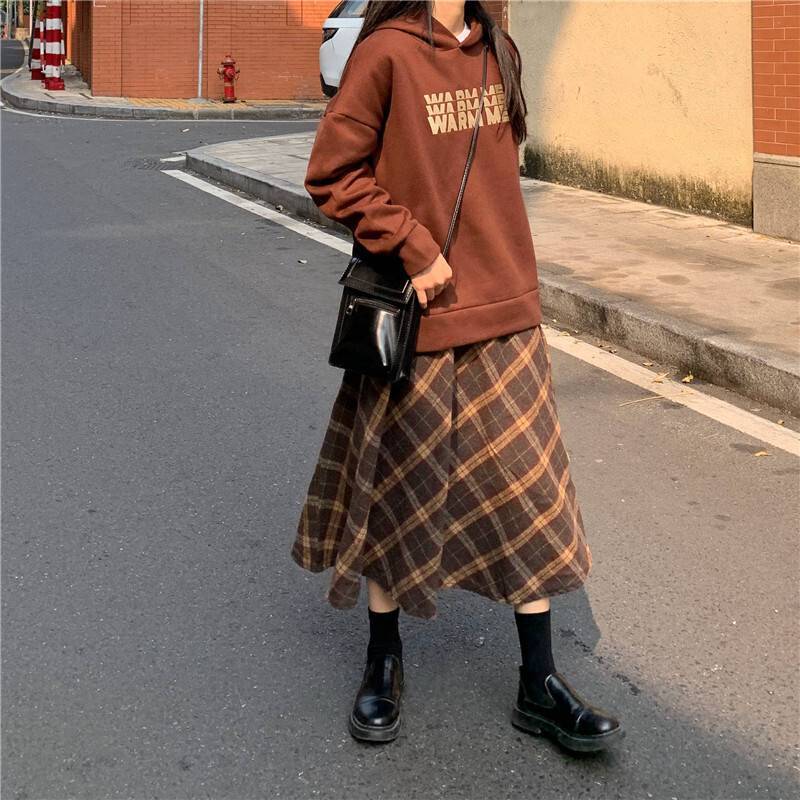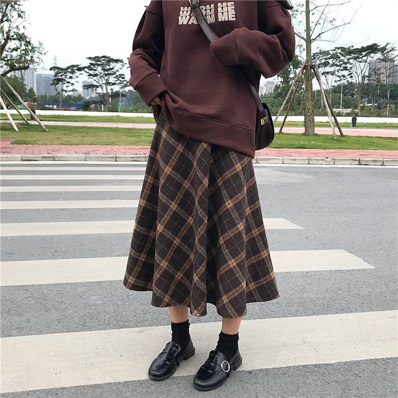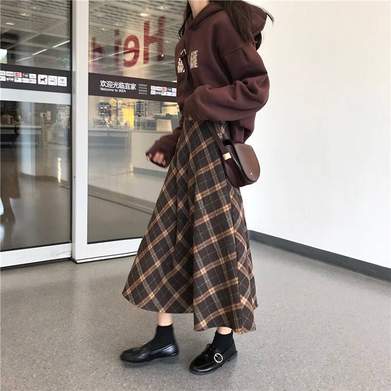 チェックスカート ロングスカート フレアスカート スカート ボトムス レディース 秋冬 ハイウエスト Aライン ロング ミモレ丈 格子縞 チェック柄 ブラウン フレア カジュアル レトロ 可 きれいめ