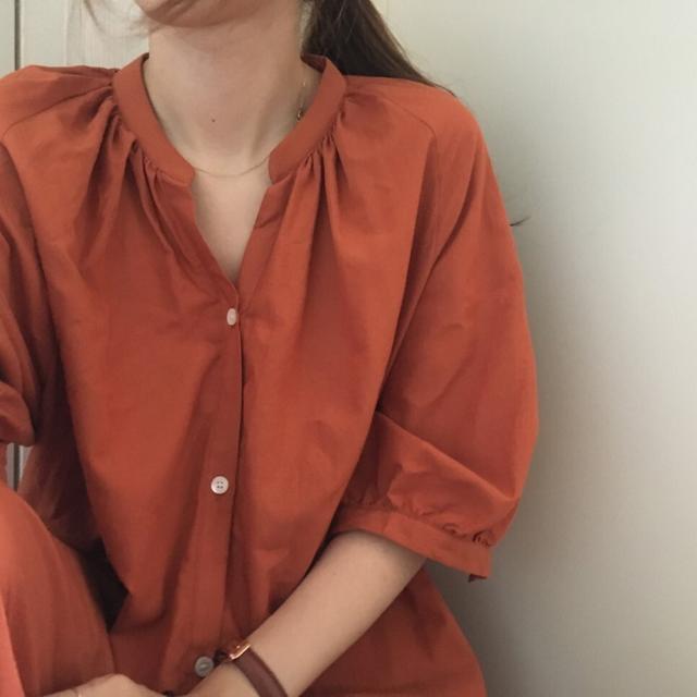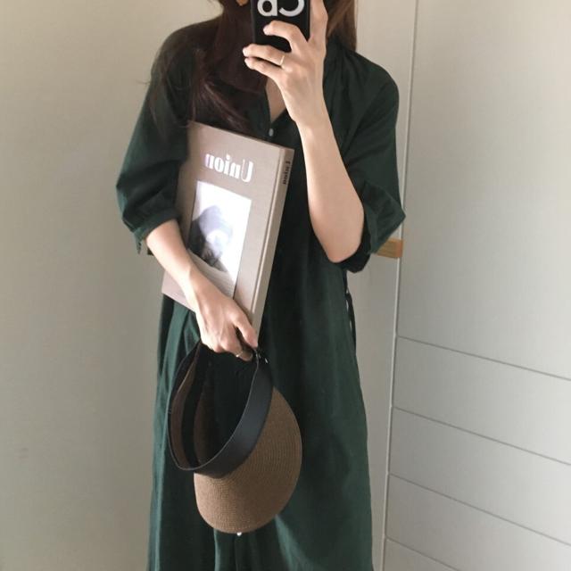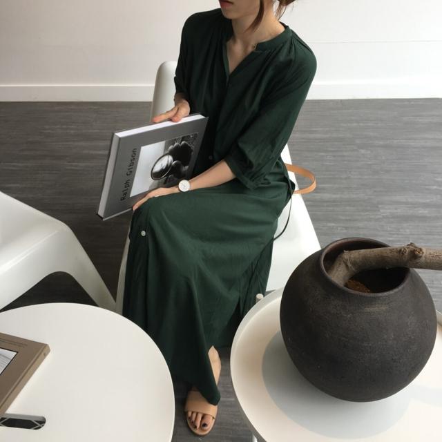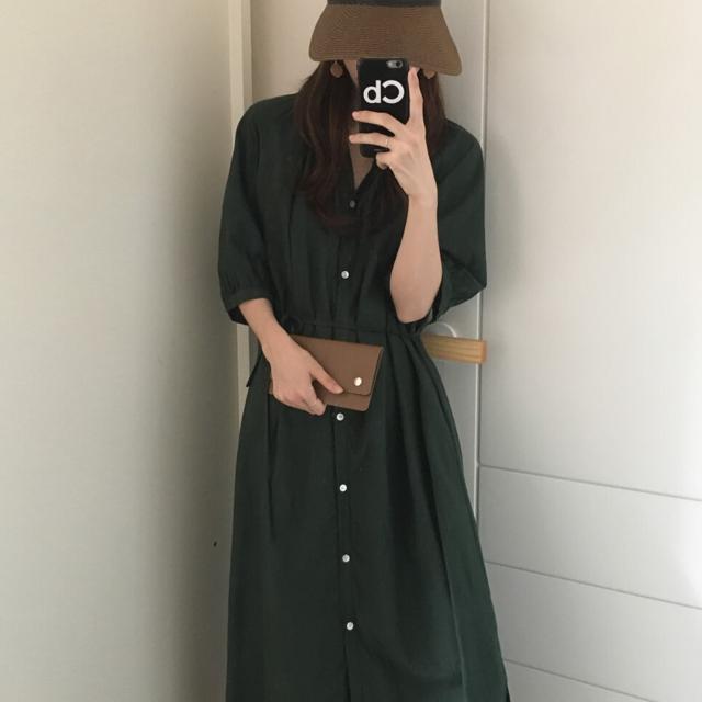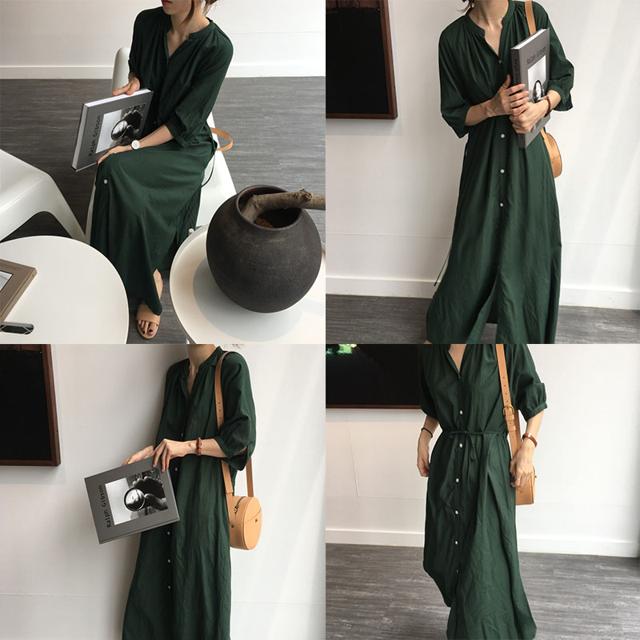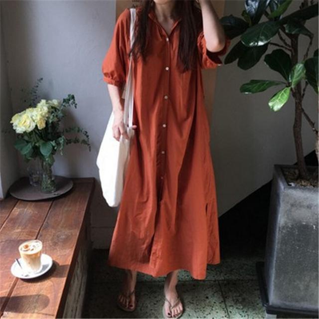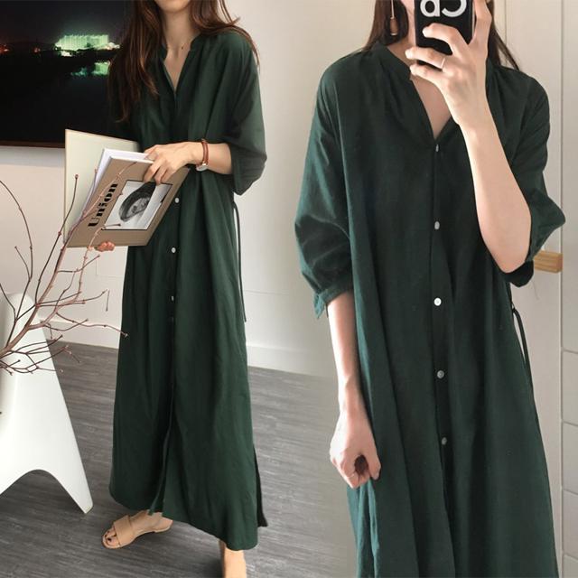 ロングワンピース シャツワンピース ワンピース レディース きれいめ シンプル カジュアル 綿 緑 オレンジ シャツ ロング フレア 半袖 五分袖 Vネック 無地 春 夏 10代 20代 30代 秋