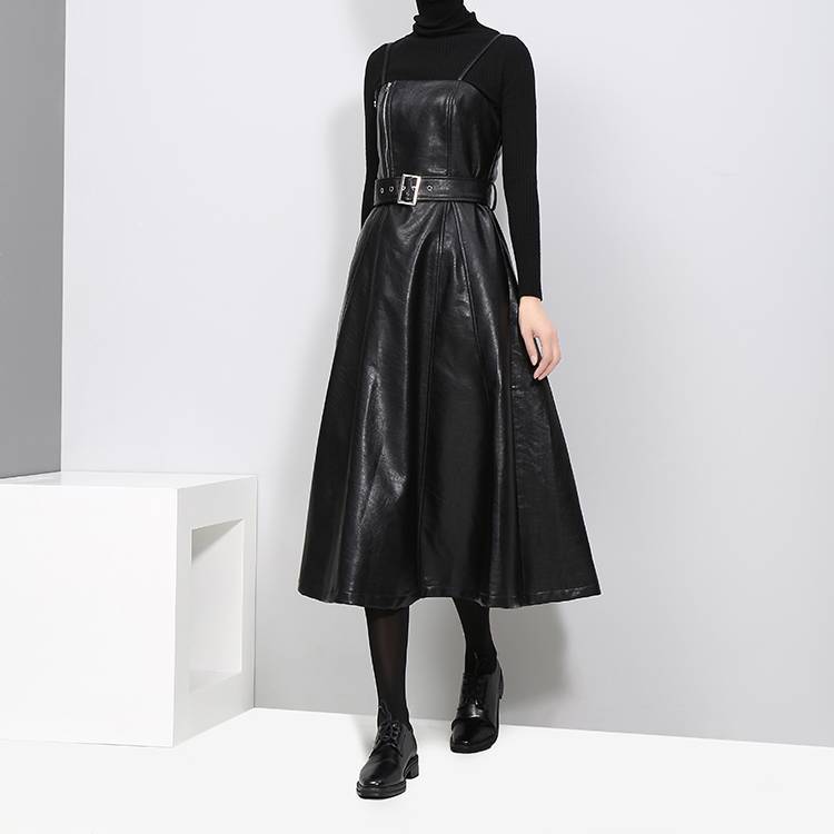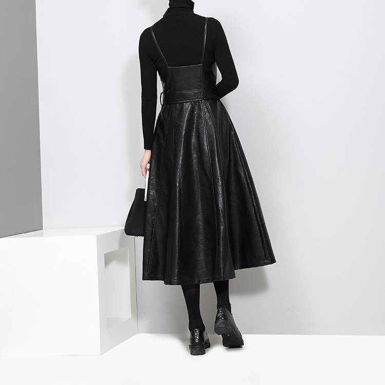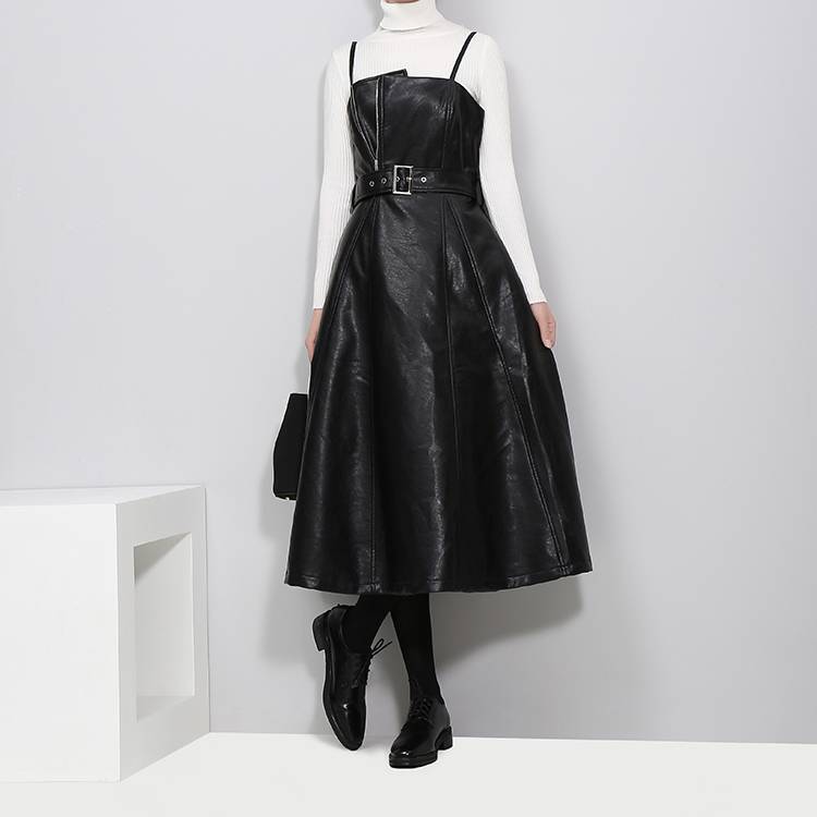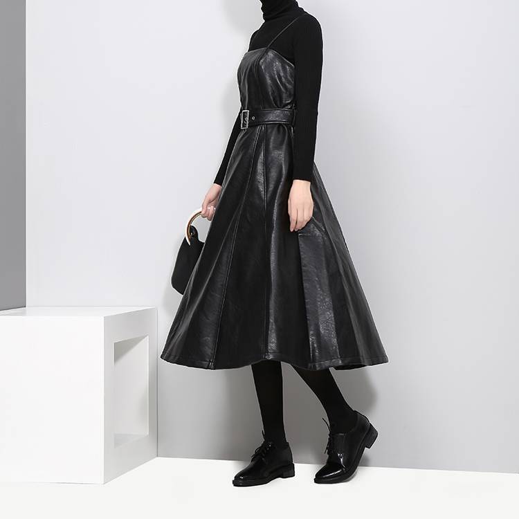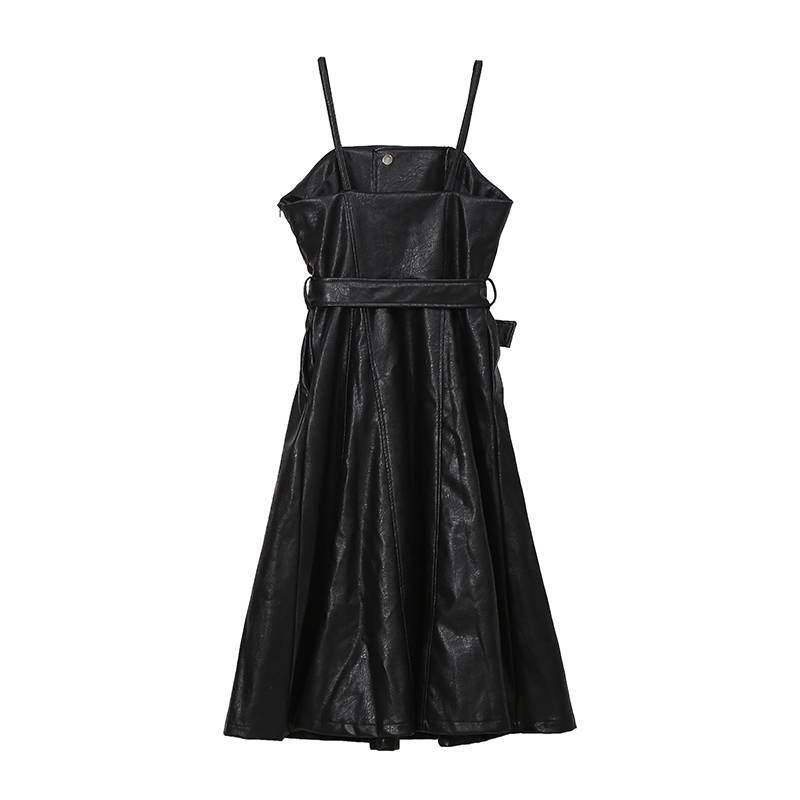 ミモレ丈ワンピース 綺麗めワンピース ワンピース ドレス レディース 秋 冬 きれいめ 10代 20代 レザー 黒 ロング ミモレ 膝丈 コーデ フレア キャミソール ウエストマーク ベルト Aライン