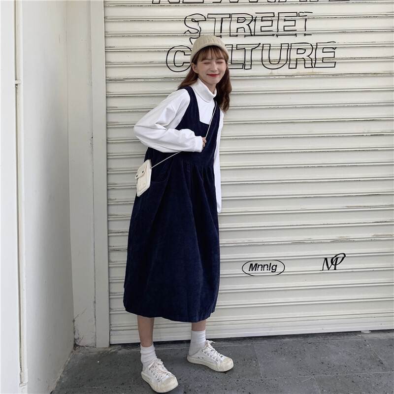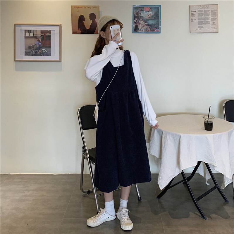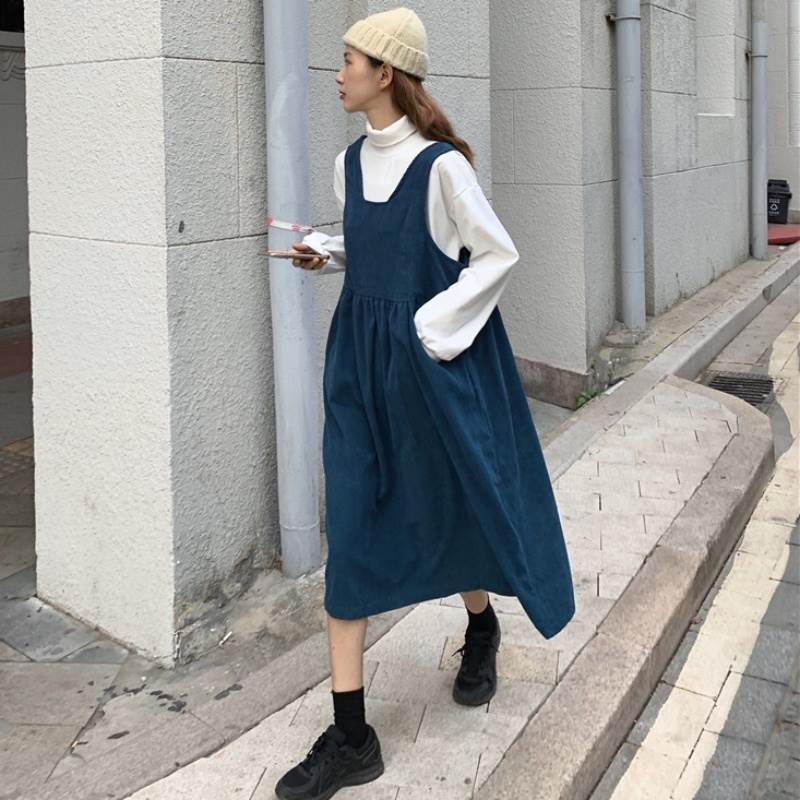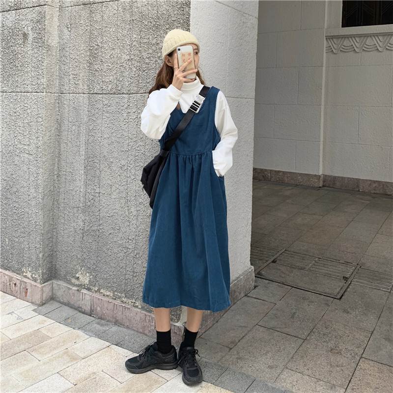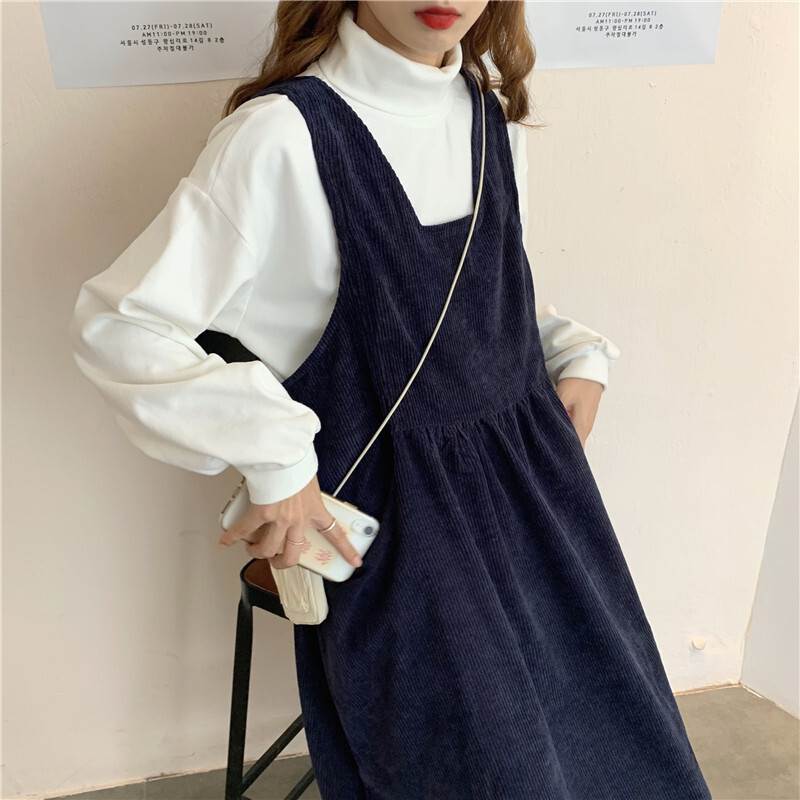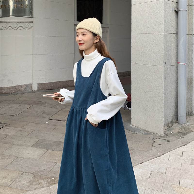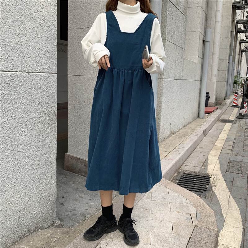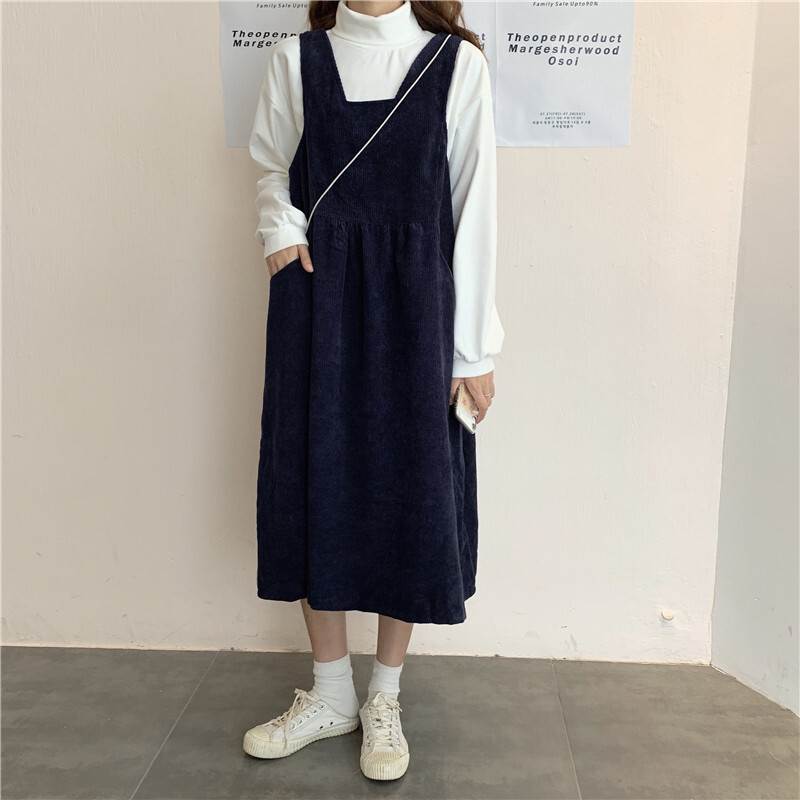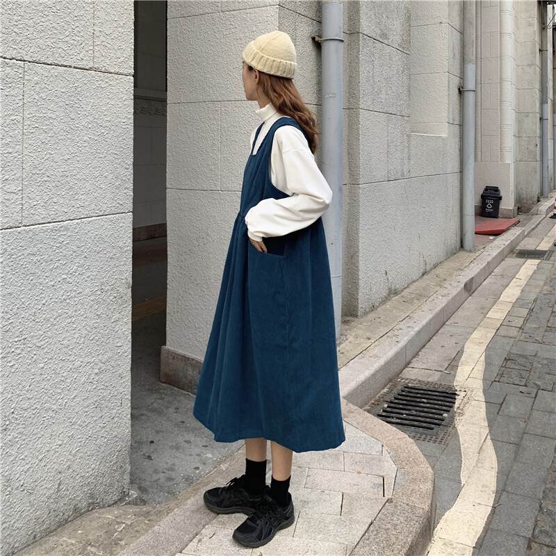 2色 ワンピース レディース ミモレ丈 フレアスカート オーバーオール コーデュロイ カジュアル かわいい レトロ ガーリー ジャンパースカート ハイウエスト ポケット ラフ シンプル 無地 ルーズ