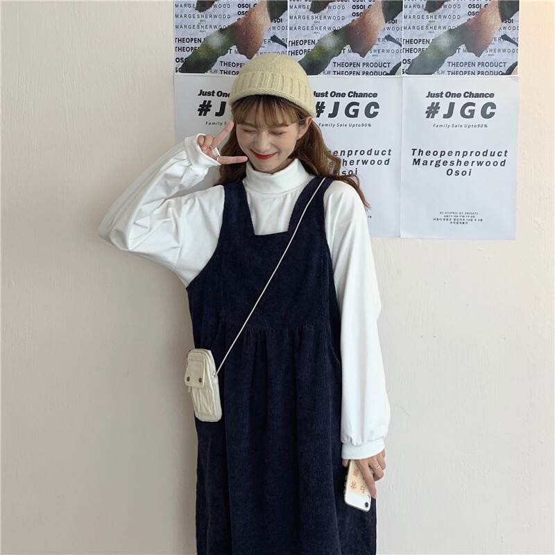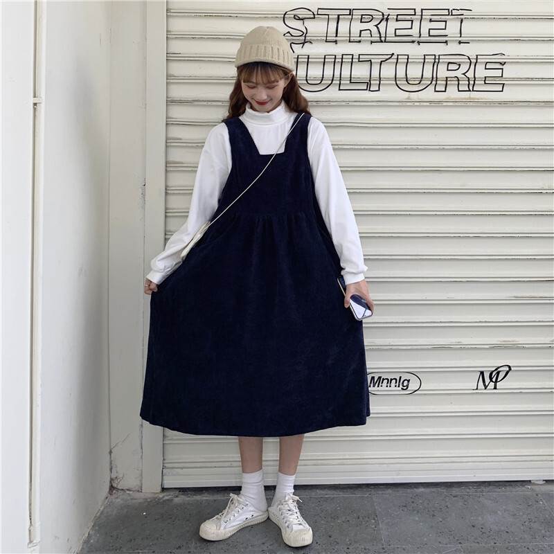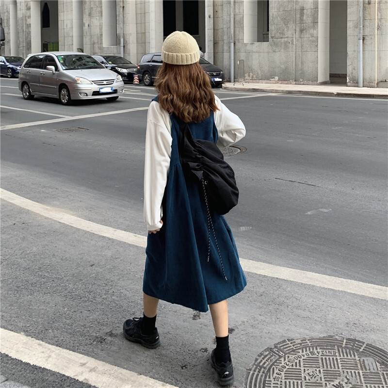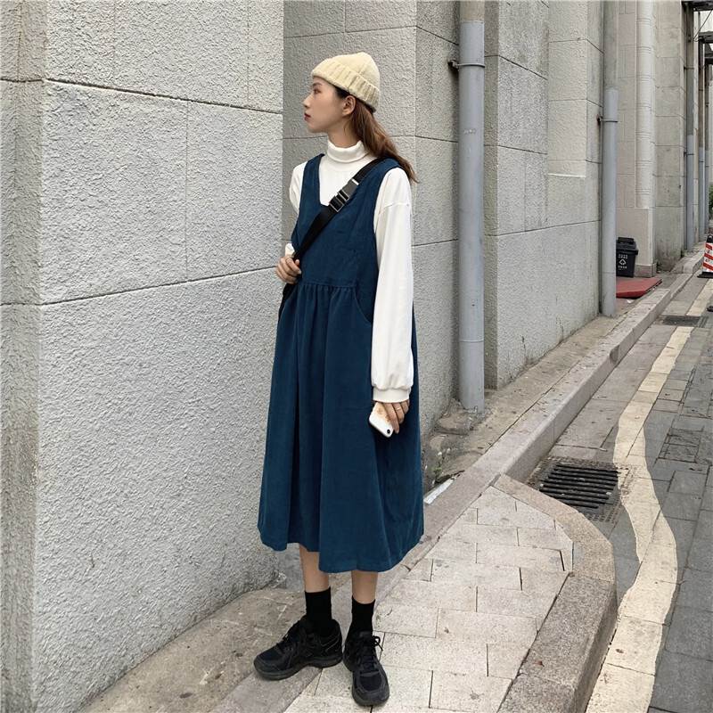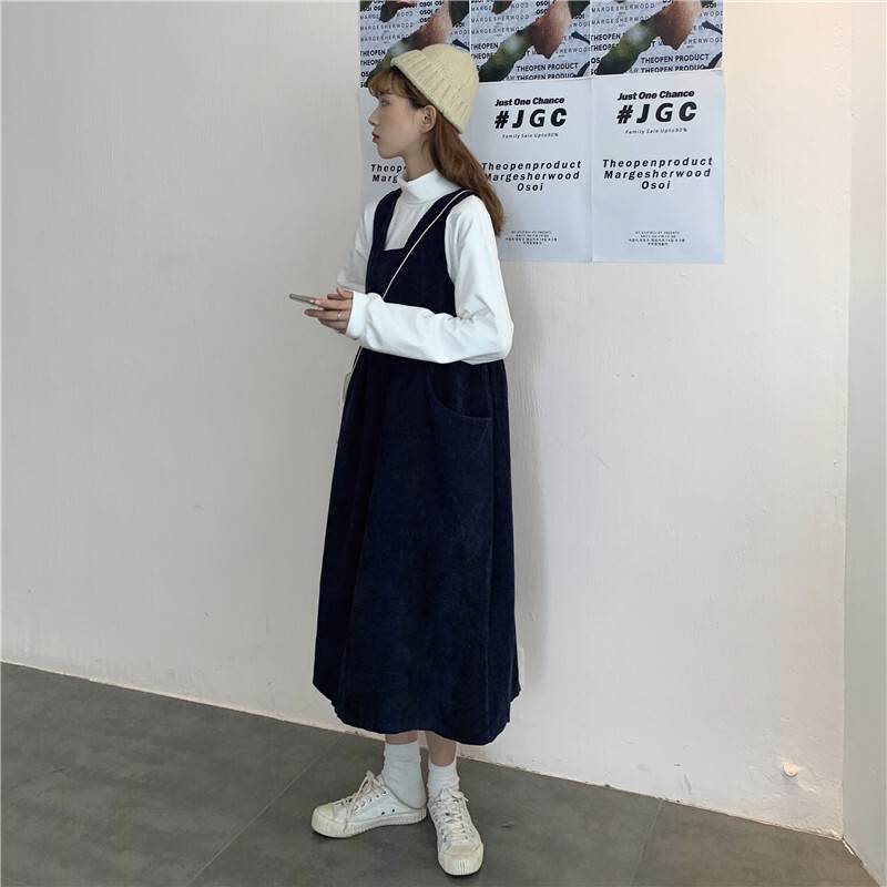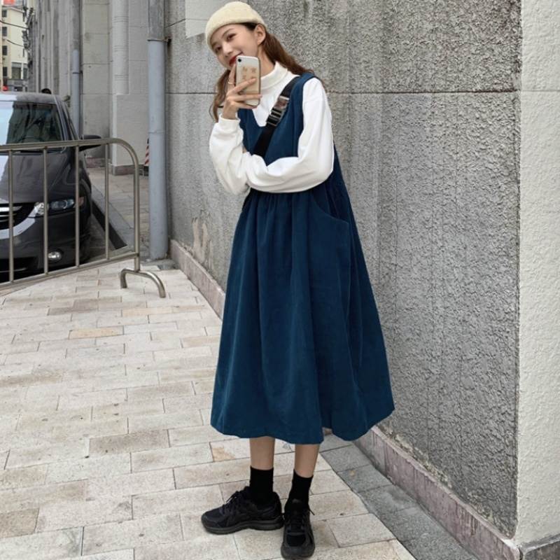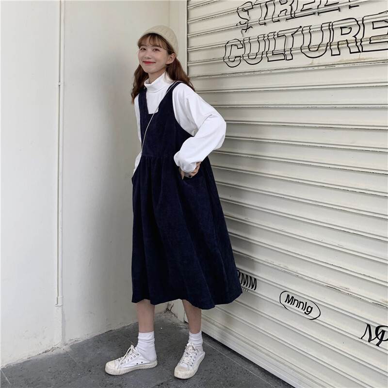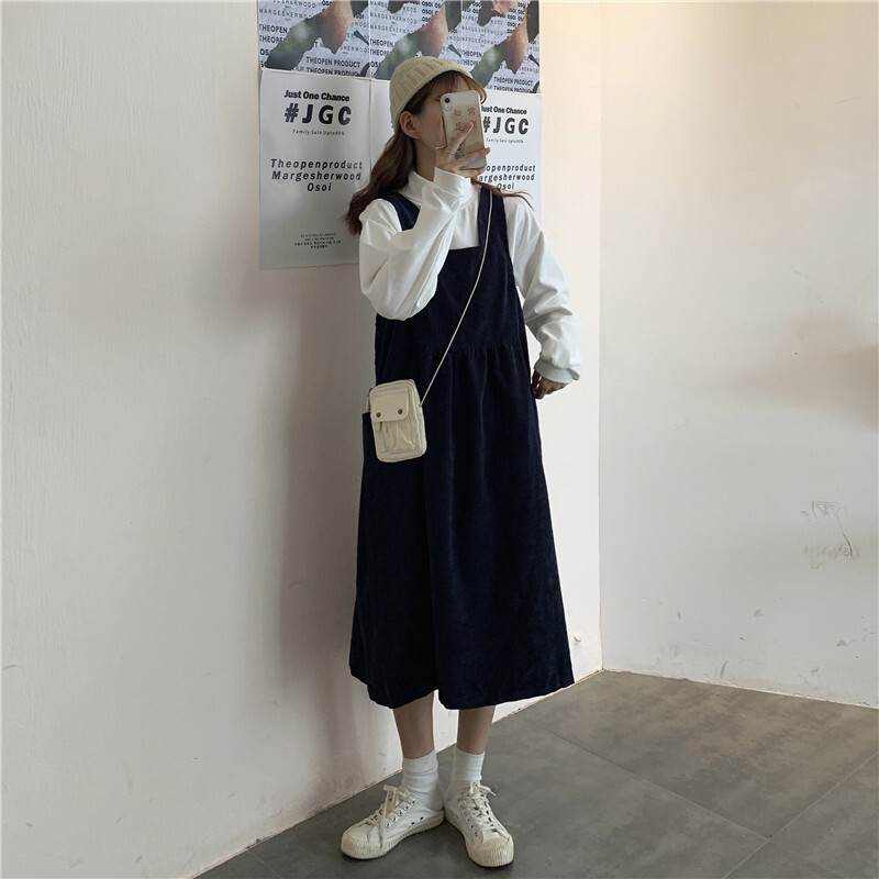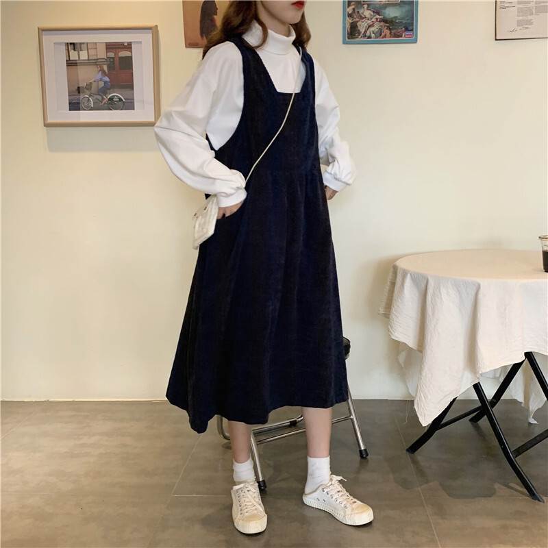 2色 ワンピース レディース ミモレ丈 フレアスカート オーバーオール コーデュロイ カジュアル かわいい レトロ ガーリー ジャンパースカート ハイウエスト ポケット ラフ シンプル 無地 ルーズ
