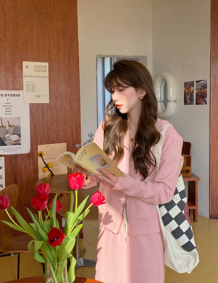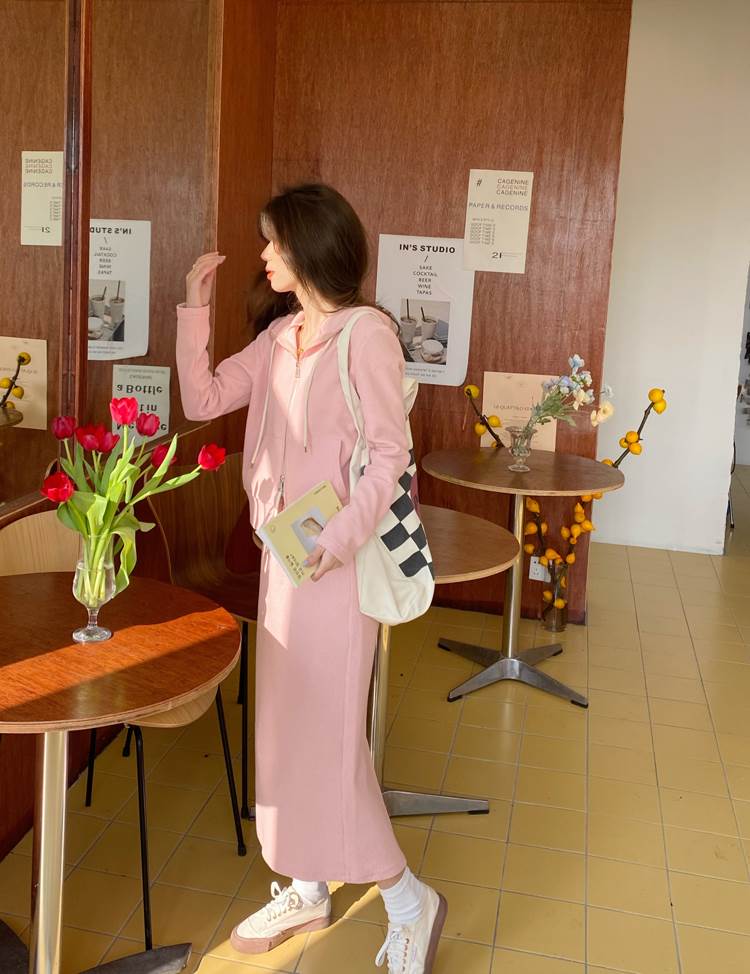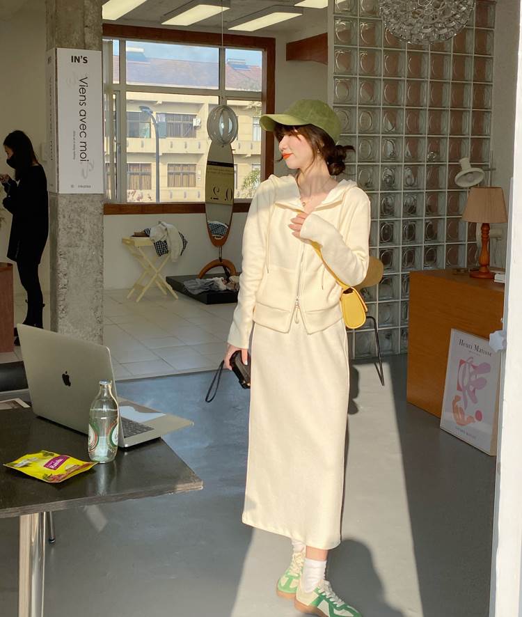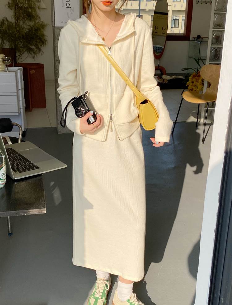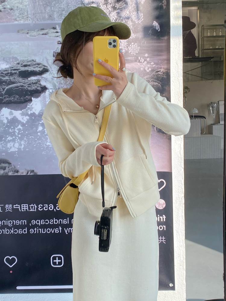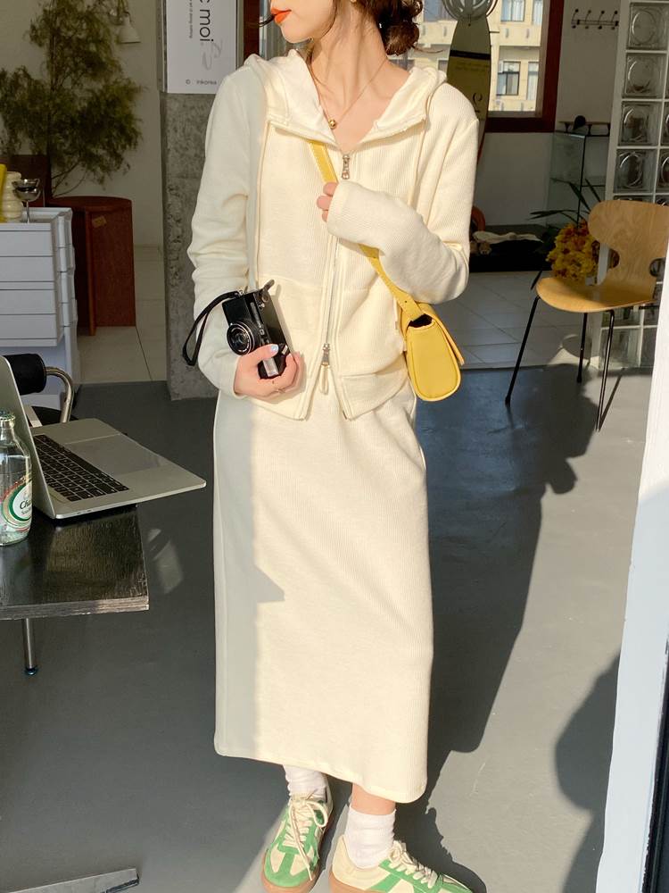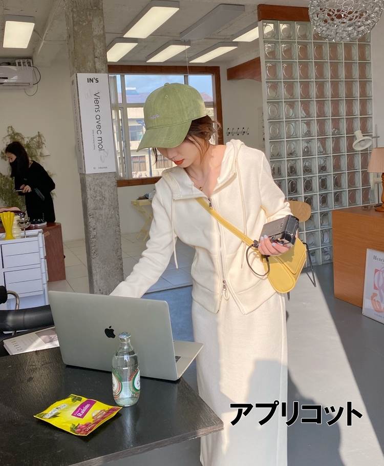 セットアップ パーカー スカート ロングスカート ペンシルスカート フーディー フード リブ ワッフル 上下セット 春 秋 かっこいい 長袖 個性的 襟付き ピンク ジップ ジッパー セ アプリコット