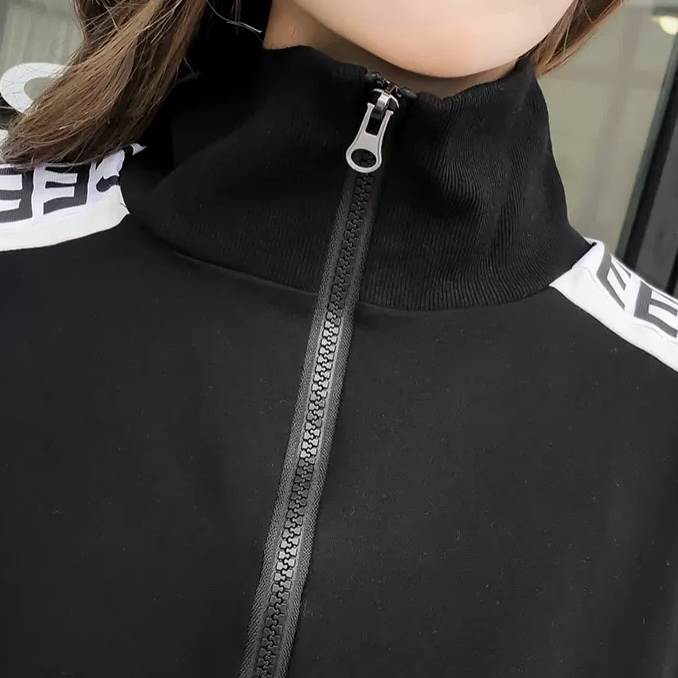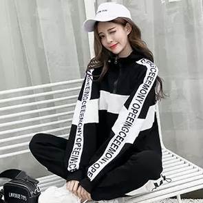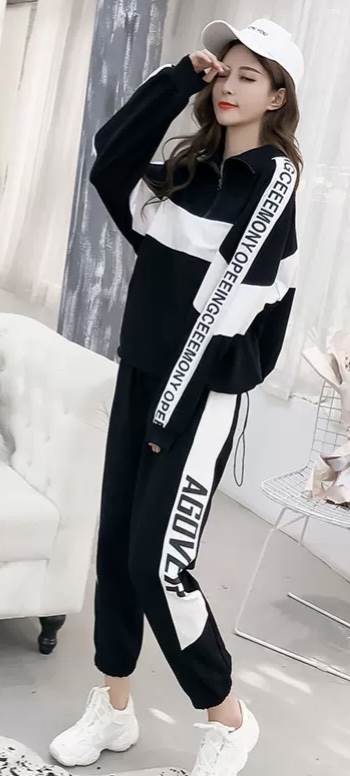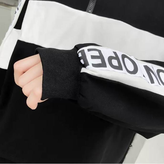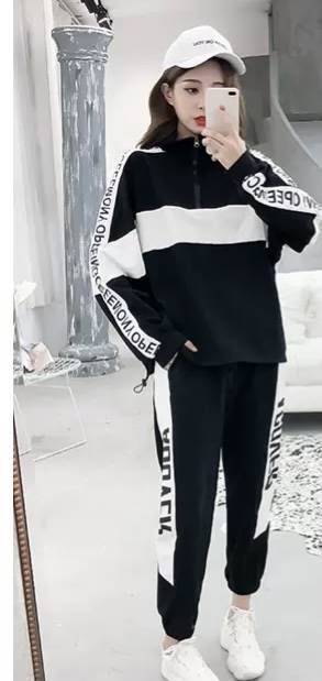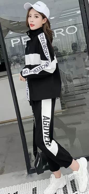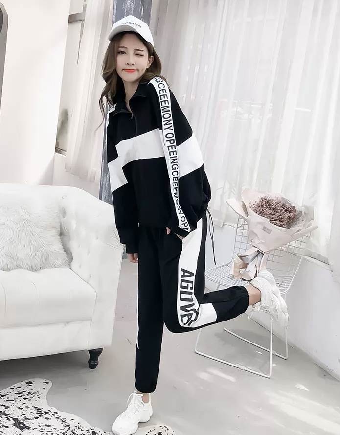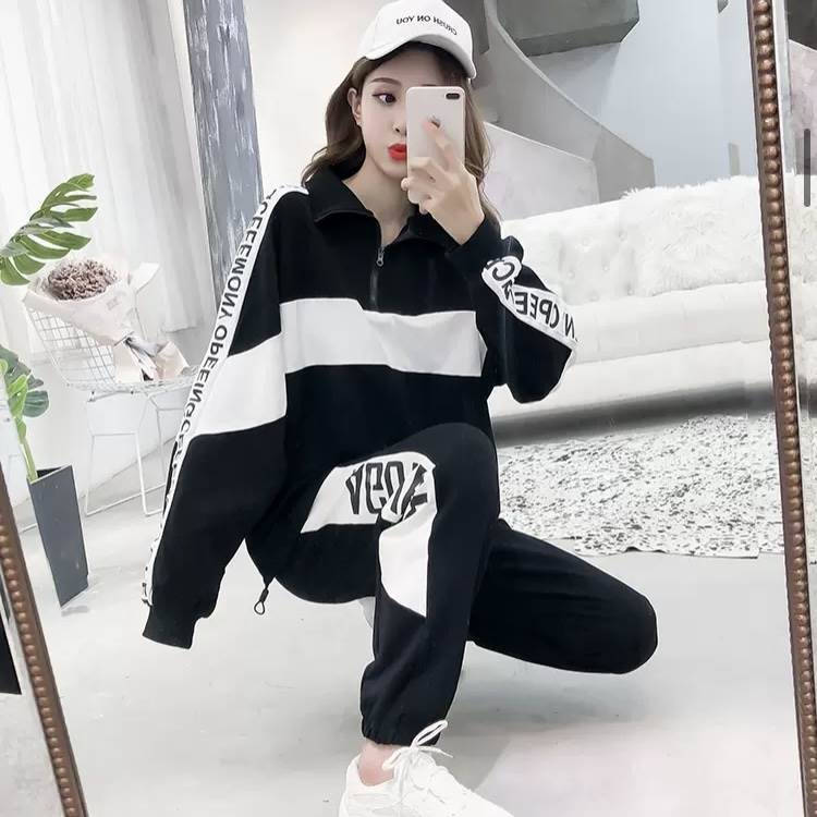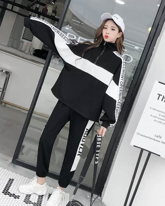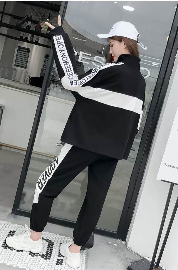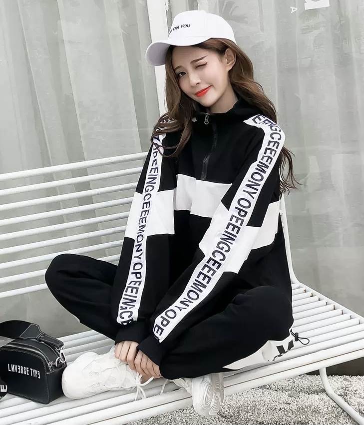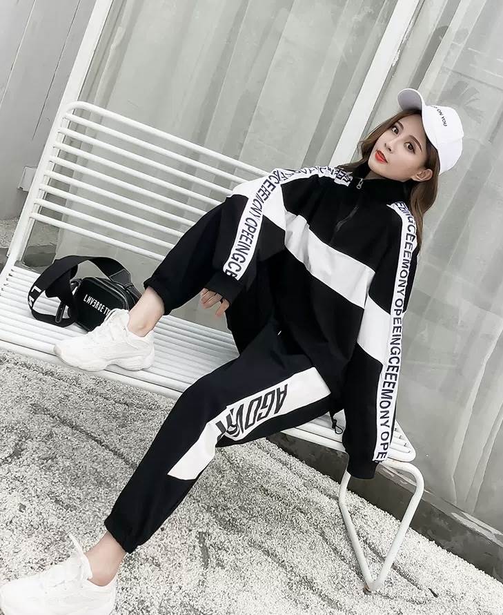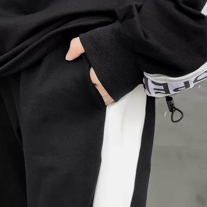 セットアップ レディース スウェット パンツ スポーツウェア 上下セット 黒 バイカラー ロゴ かっこいい お洒落 ツーピース トップス ブラック ライン ルーズ ストリート ダンス ヒッ カジュアル