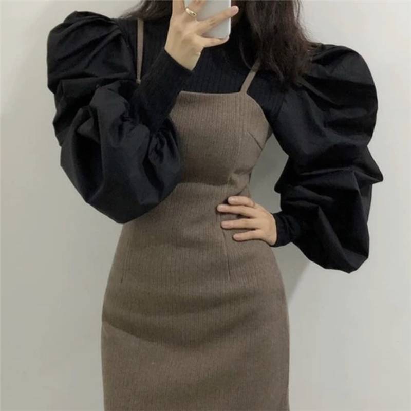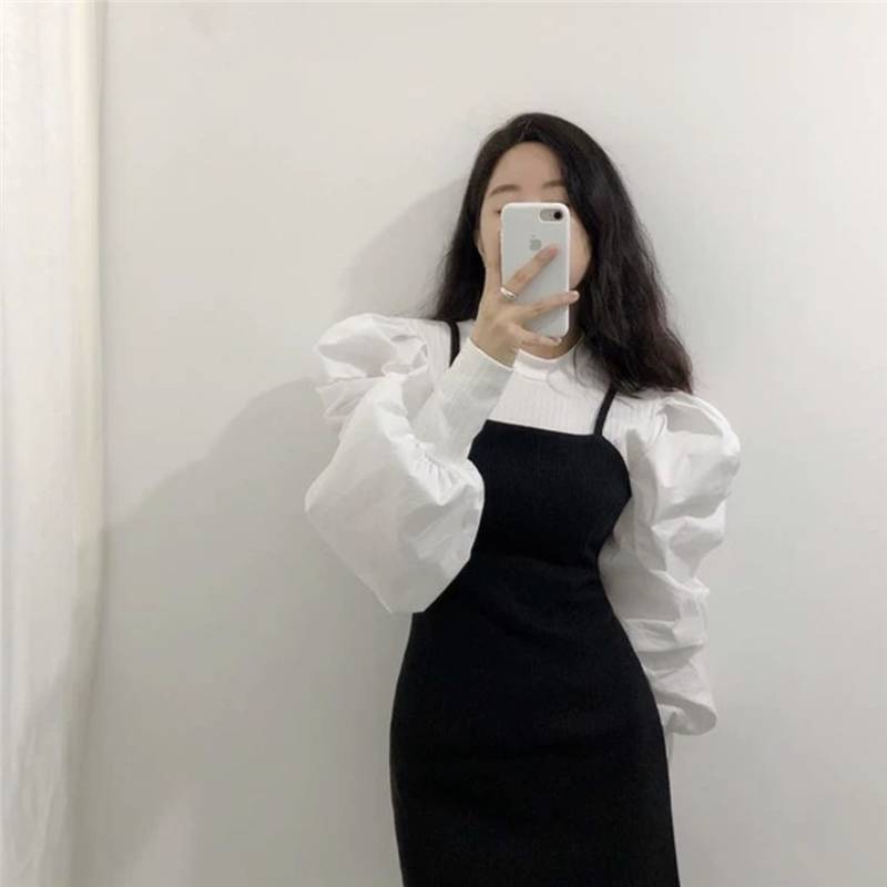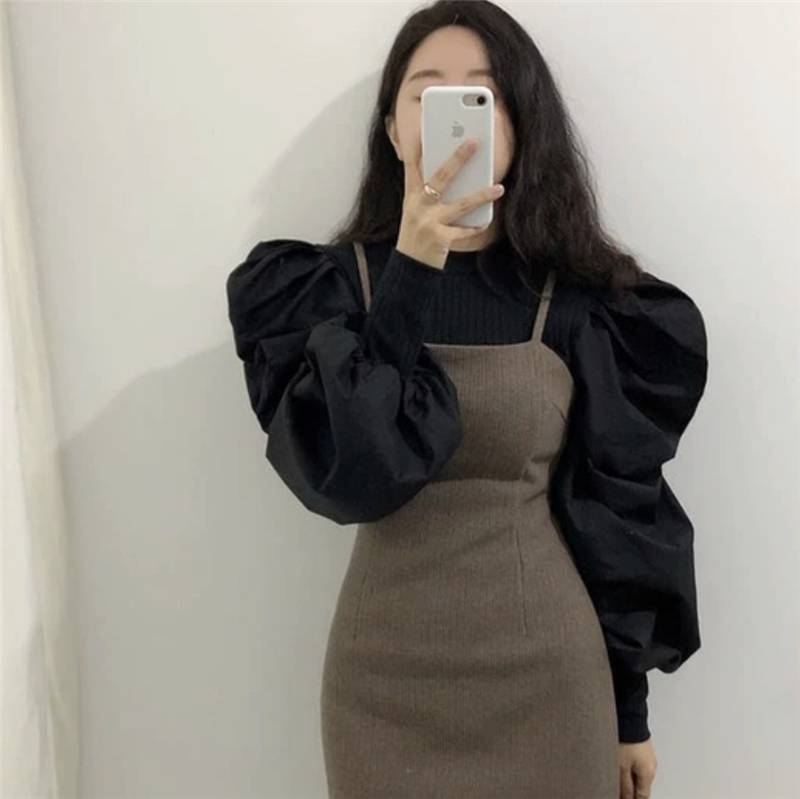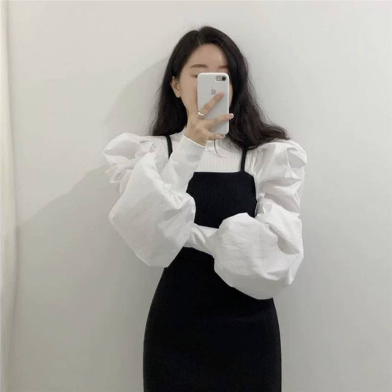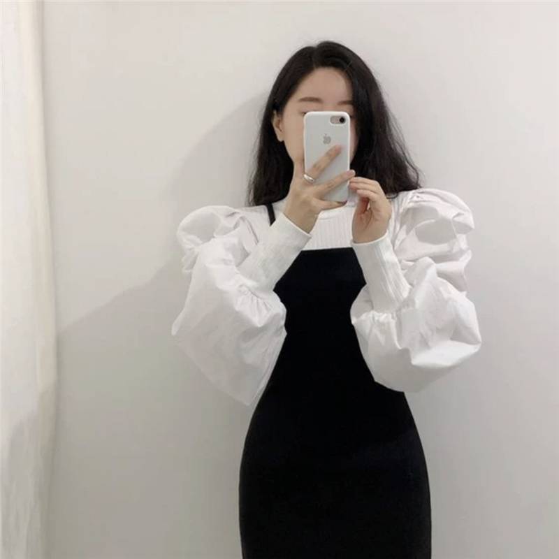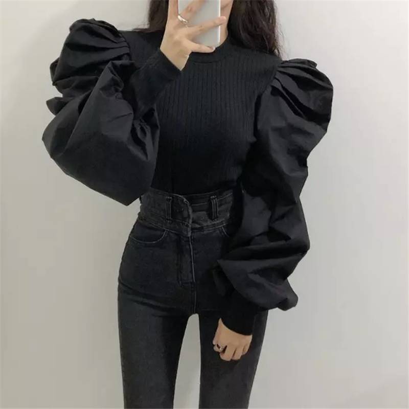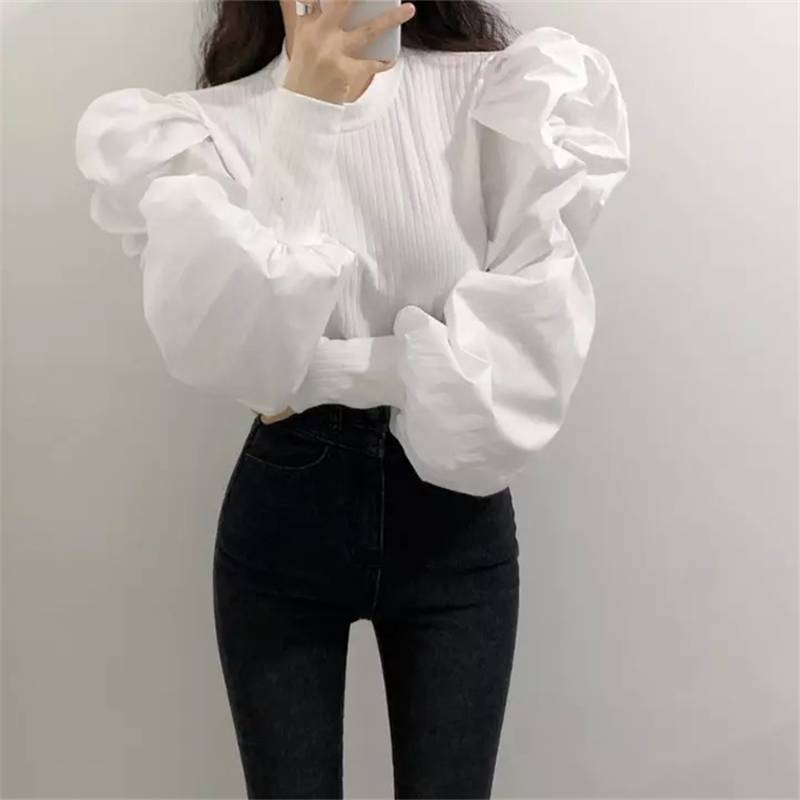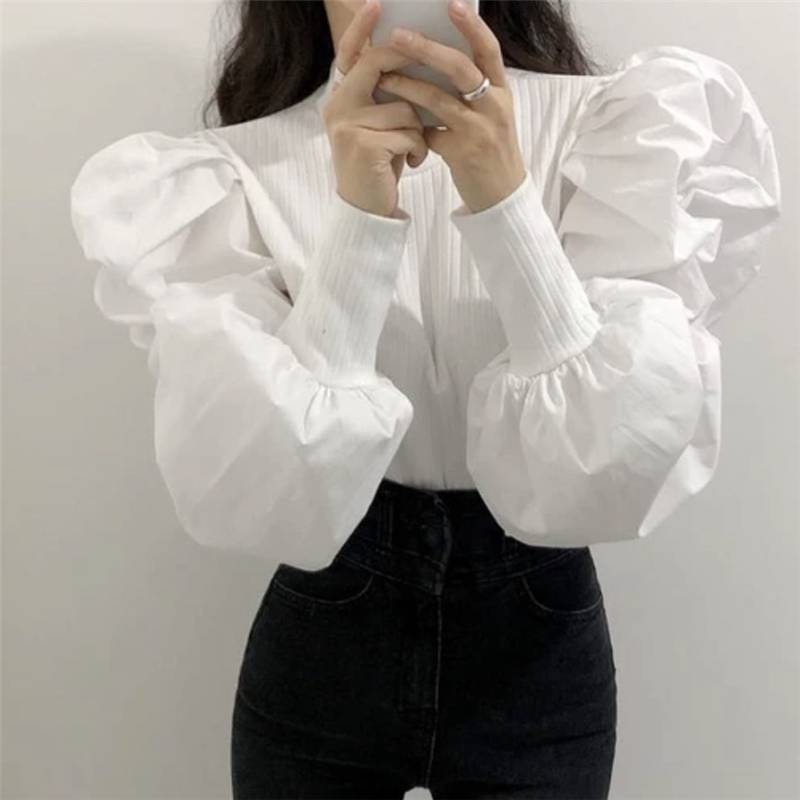 2色 トップス レディース シャツ ブラウス ボリューム袖 長袖 ラウンドネック 無地 かわいい おしゃれ 個性的 ランタンスリーブ パフスリーブ 切り替え デザイン ホワイト ブラック 黒 モノ 白