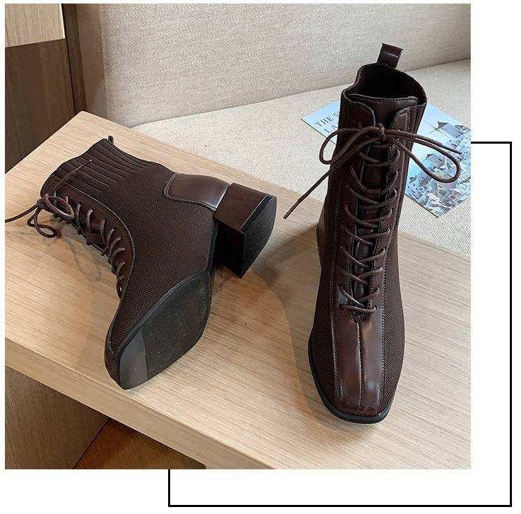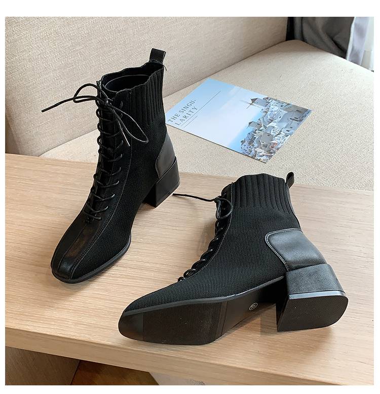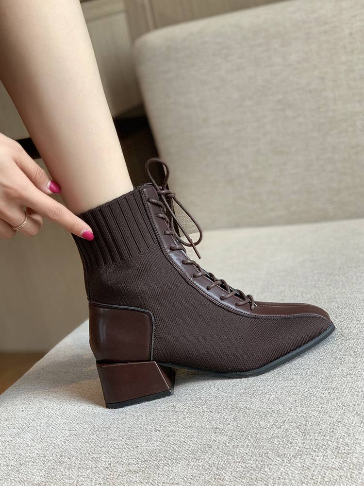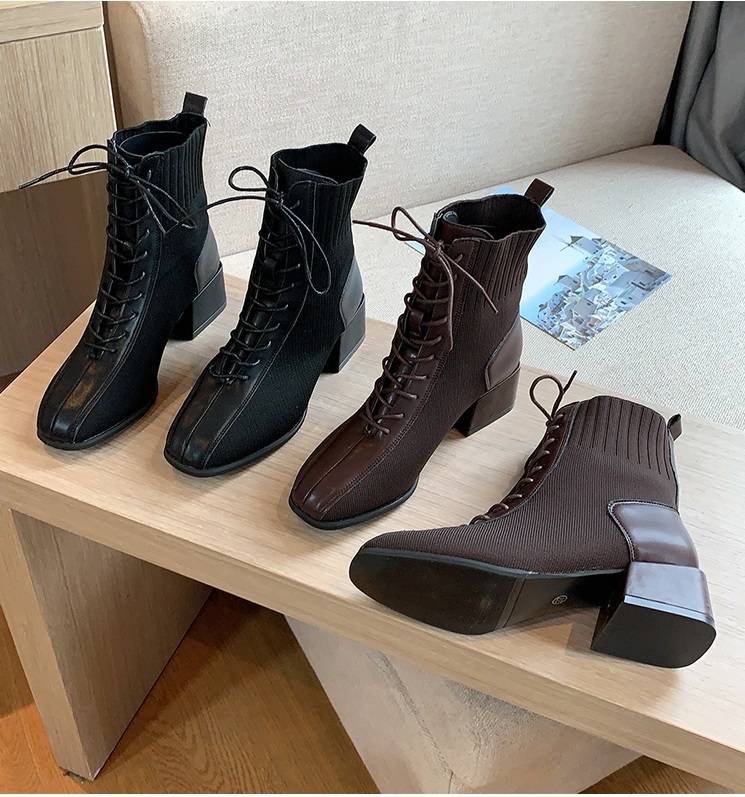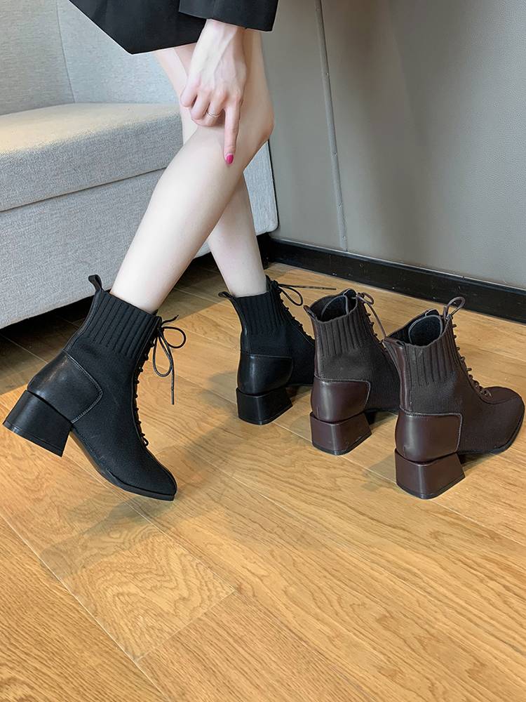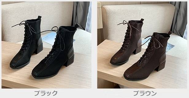 ショートブーツ レディース シューズ ブーツ 靴 レースアップ ヒール 異素材MIX 切り替え デザイン カジュアル かっこいい 大人可愛い ソックスブーツ アンクルブーツ ハイヒール スクエアトゥ
