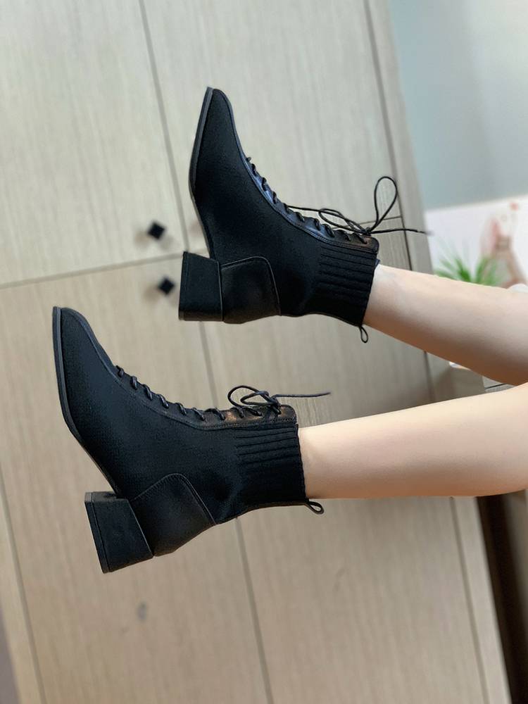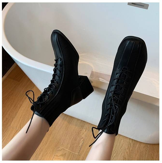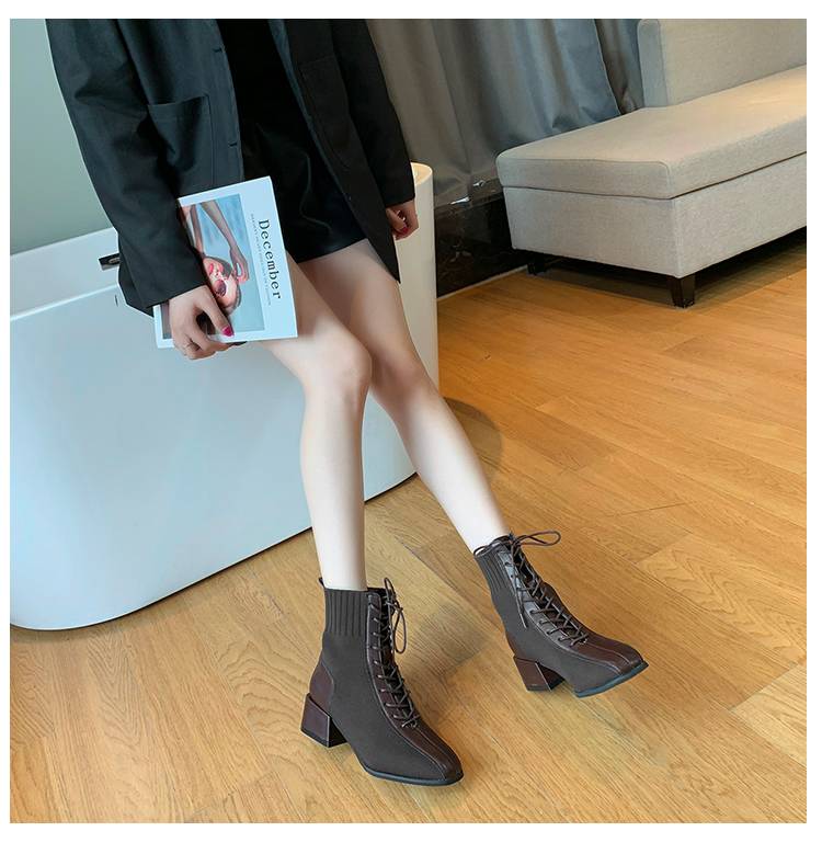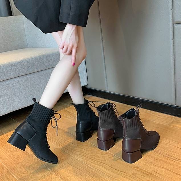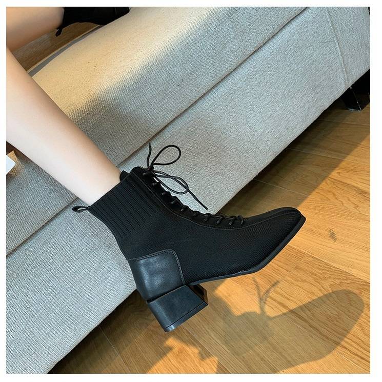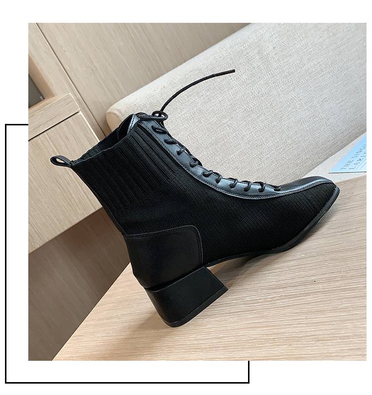 ショートブーツ レディース シューズ ブーツ 靴 レースアップ ヒール 異素材MIX 切り替え デザイン カジュアル かっこいい 大人可愛い ソックスブーツ アンクルブーツ ハイヒール スクエアトゥ