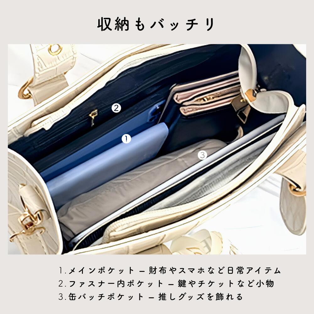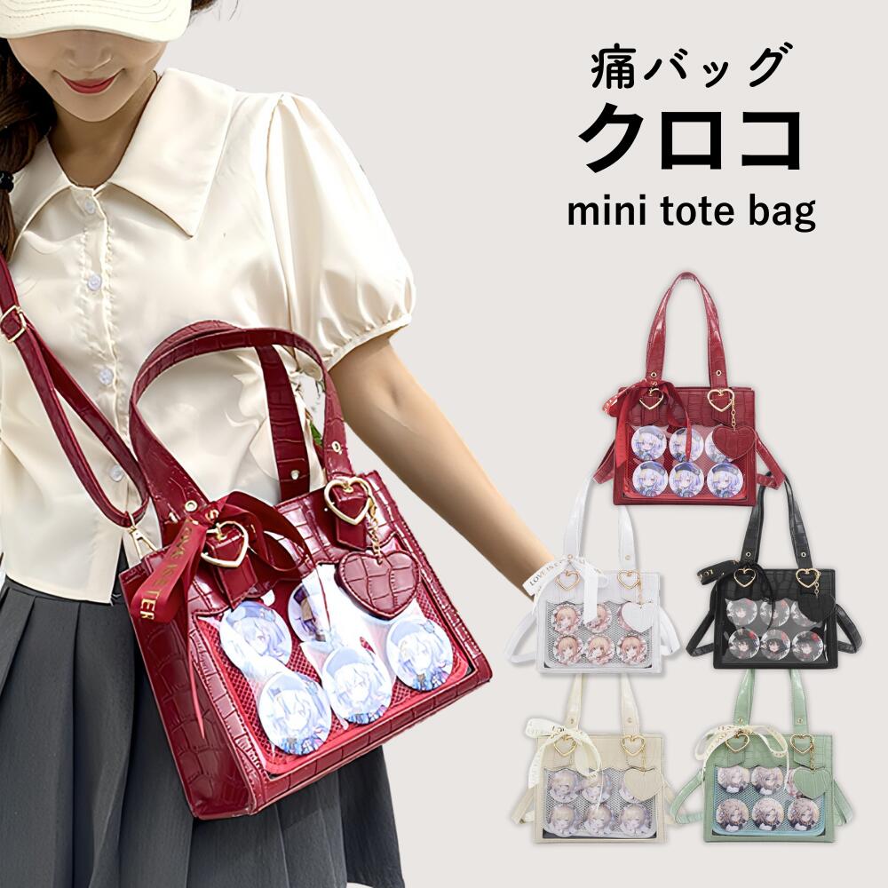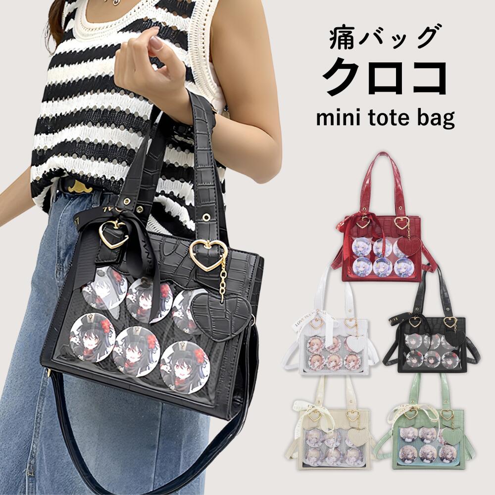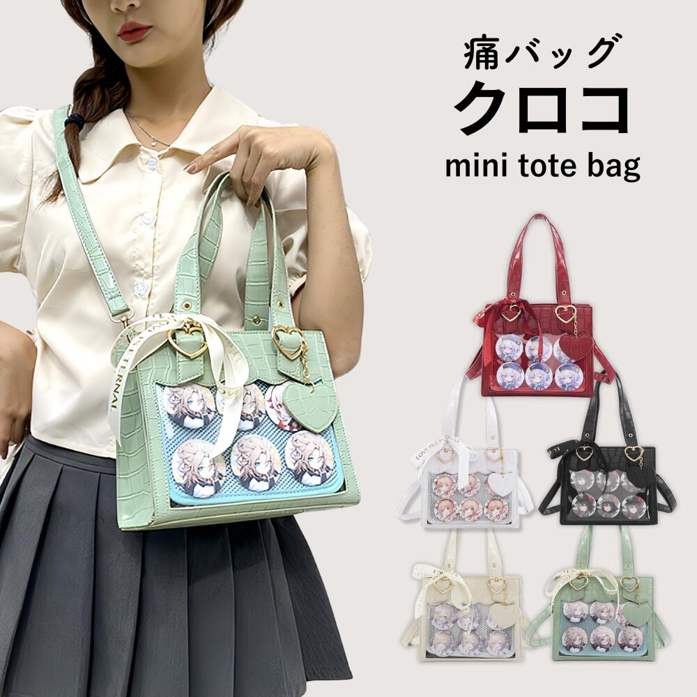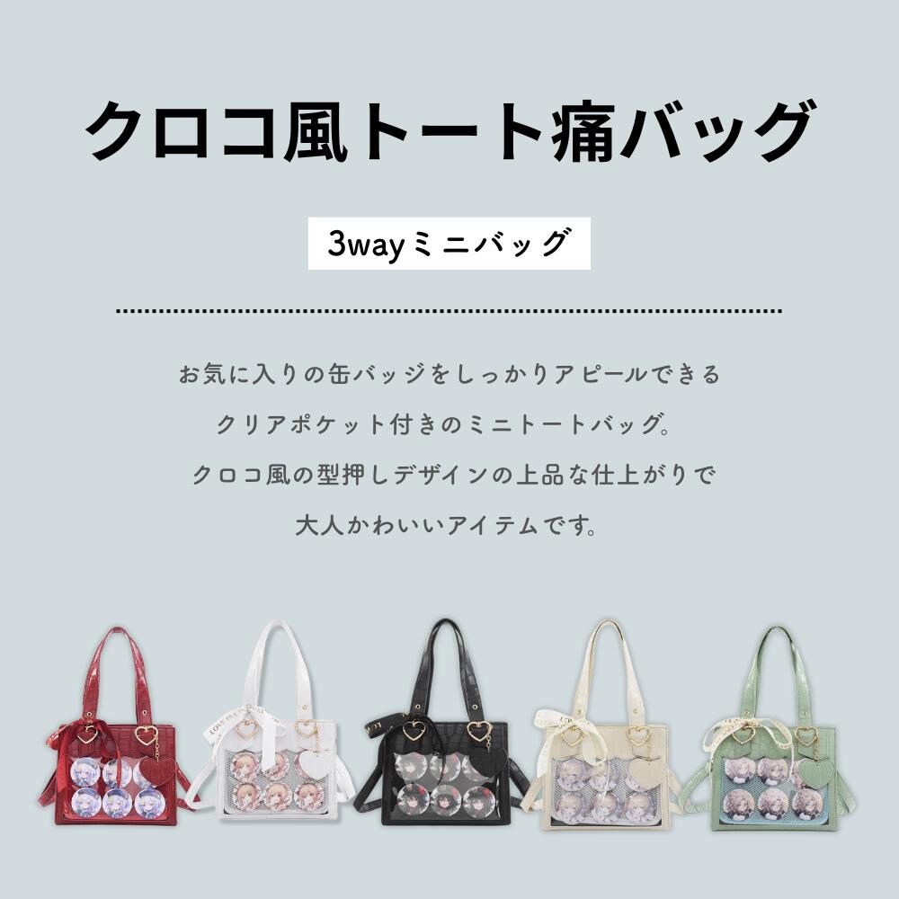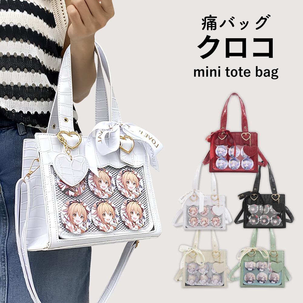 クロコ柄2WAY痛バッグはトートとショルダーの2WAY仕様で、小さめサイズながらお気に入りのぬいぐるみ、缶バッジなどをスタイリッシュに収納できます。
