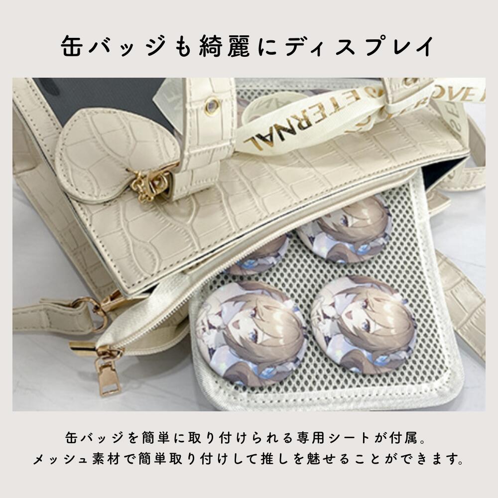 透明ポケット搭載: クリアで透明感のあるデザインには、外からでも中身が一目瞭然な透明ポケットが。お気に入りの缶バッジやアクセサリーを飾りながら、オタ活をアピール。