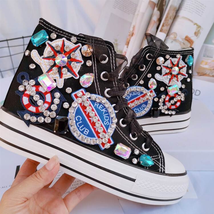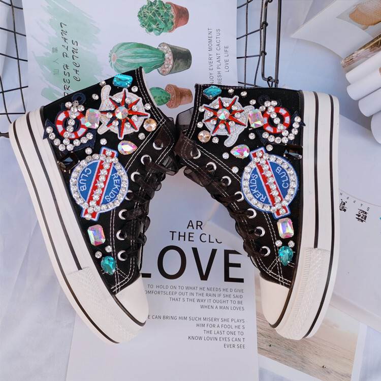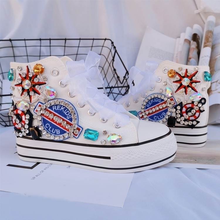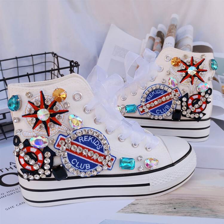 カラフルなビジューとワッペンが華やかなハイカットスニーカー