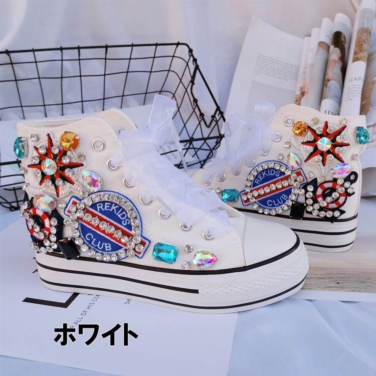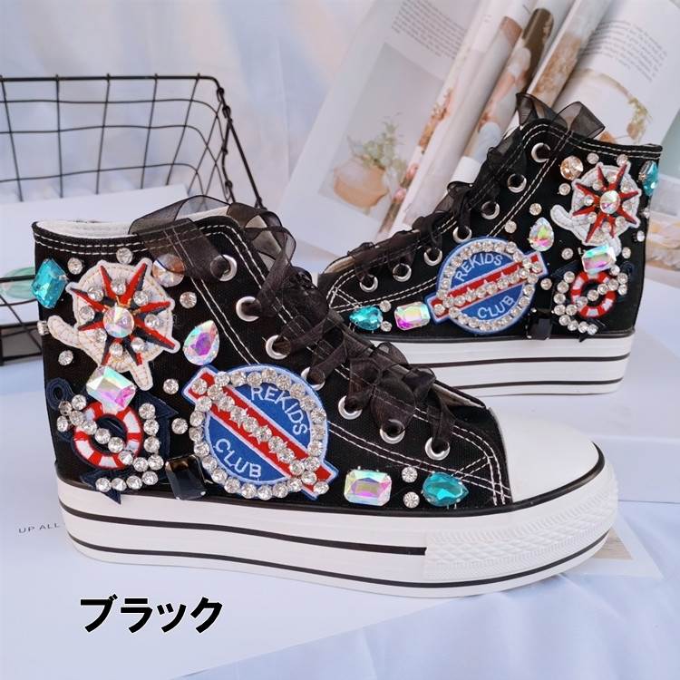 2色 ハイカット スニーカー ビジュー 靴 人気 ホワイト ブラック 35 36 37 38 39 40