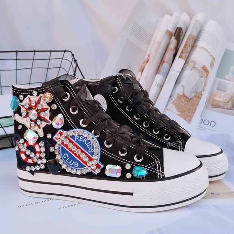 2色 ハイカット スニーカー ビジュー ラインストーン デコ シューズ レディース カジュアル ストリート ファブリック 布 厚底 靴 クツ 黒 白 個性的 バイカラー フラット ホワイ 大人かわいい
