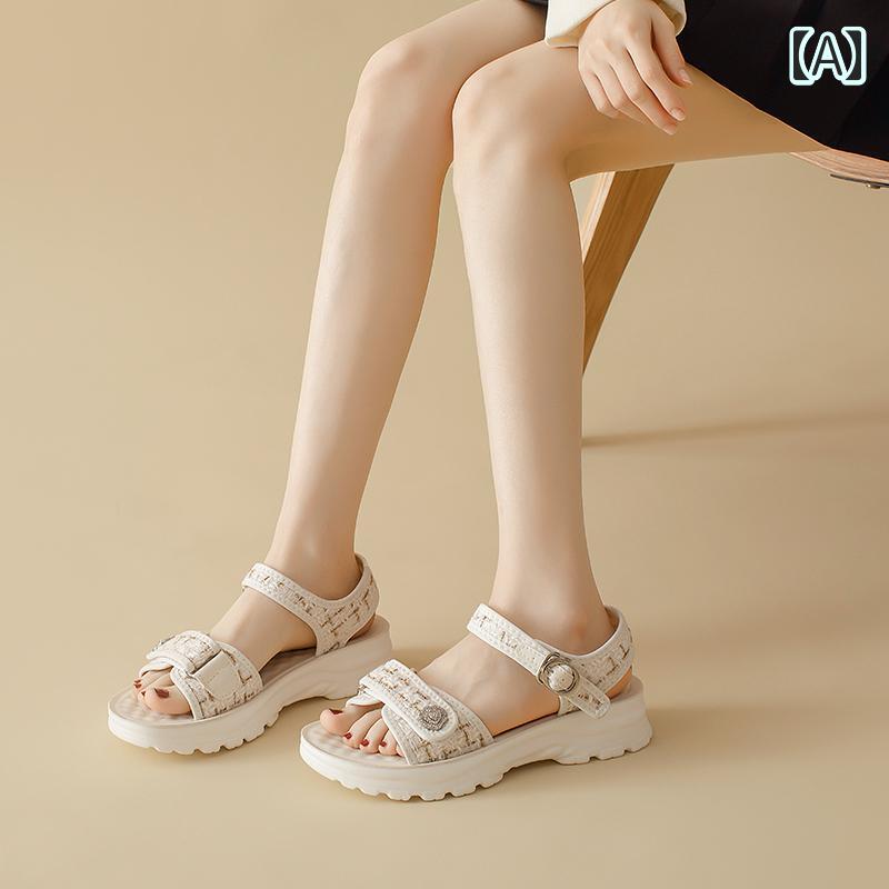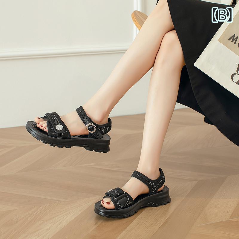 スポーツサンダル ツイード風 エスニック 黒 白 ビーチサンダル 可愛い レディース 韓国系 ニッチ かわいい ストラップ サンダル 厚底 春夏 シューズ 柄デザイン 刺繍 ワンポイント モノトーン