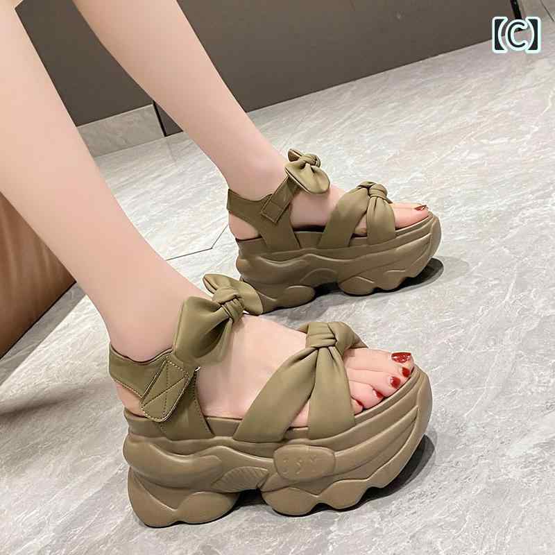 9cm 超厚底 スポサン リボン 可愛い スポーツサンダル ウェッジソール 黒 白 茶色 カーキ 無地 ごつかわいい 韓国系 個性的 サンダル レディース ストラップ シューズ 海 ビーチサンダ 春夏
