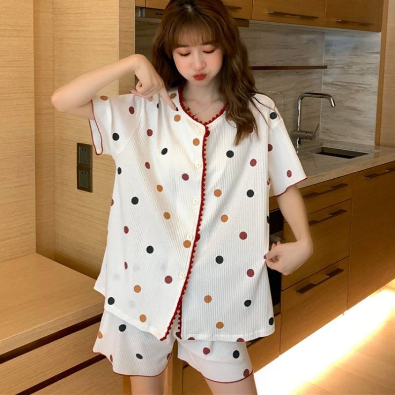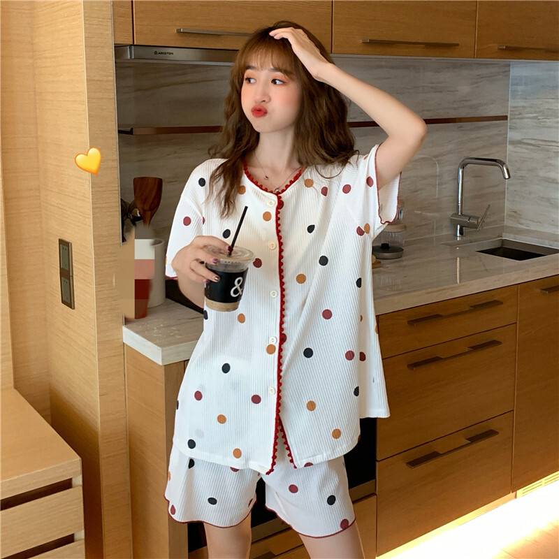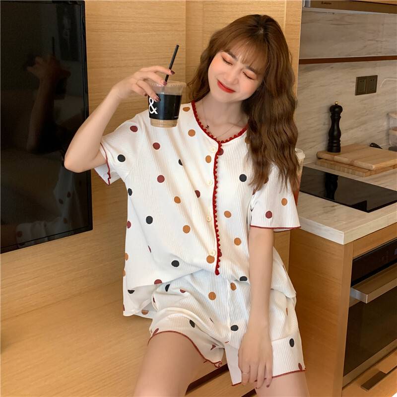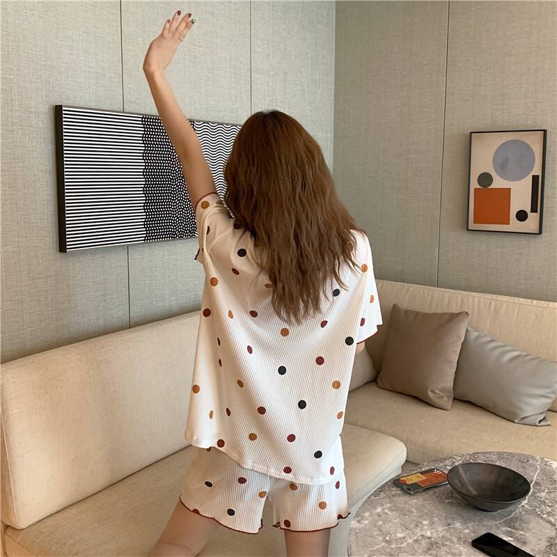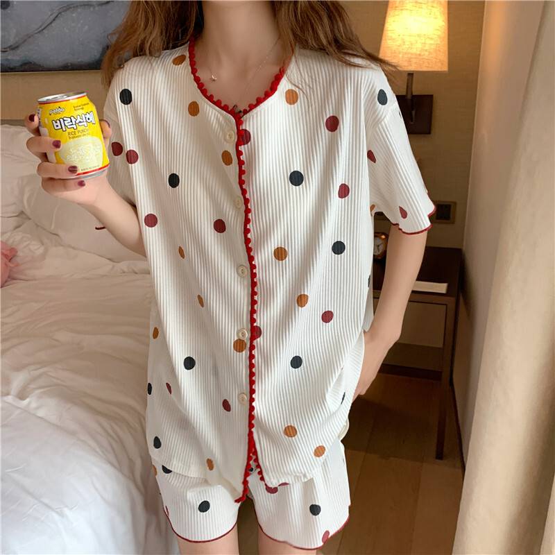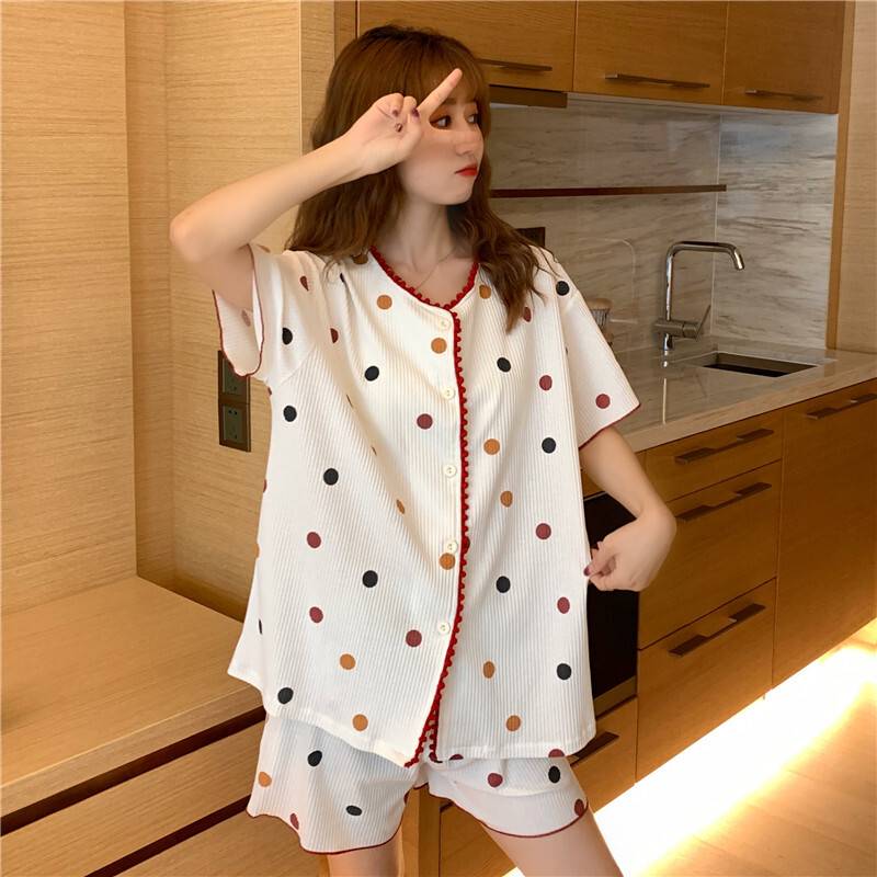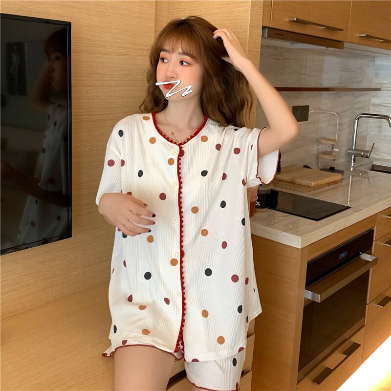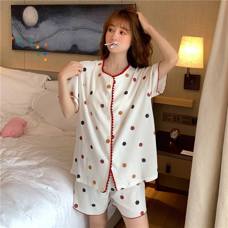 ルームウェア レディース シャツ 部屋着 パジャマ 寝間着 上下セット ドット柄 前開き ボタン 襟なし 半袖 ショートパンツ ミニ丈 半ズボン ツーピース 水玉 ガーリー 可愛い 大人かわい レトロ