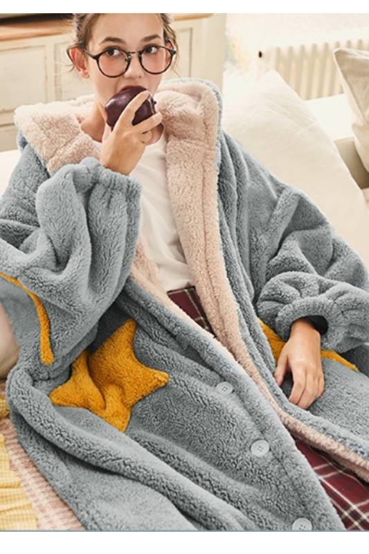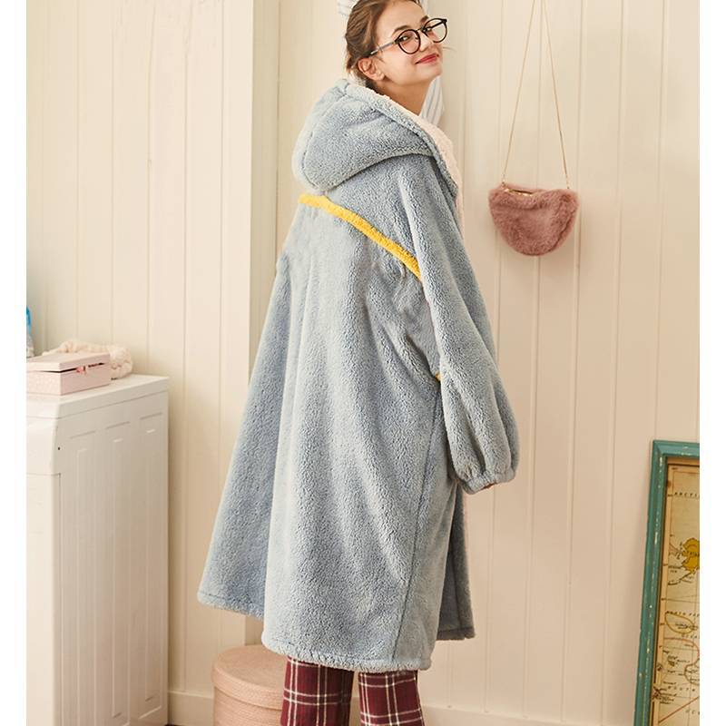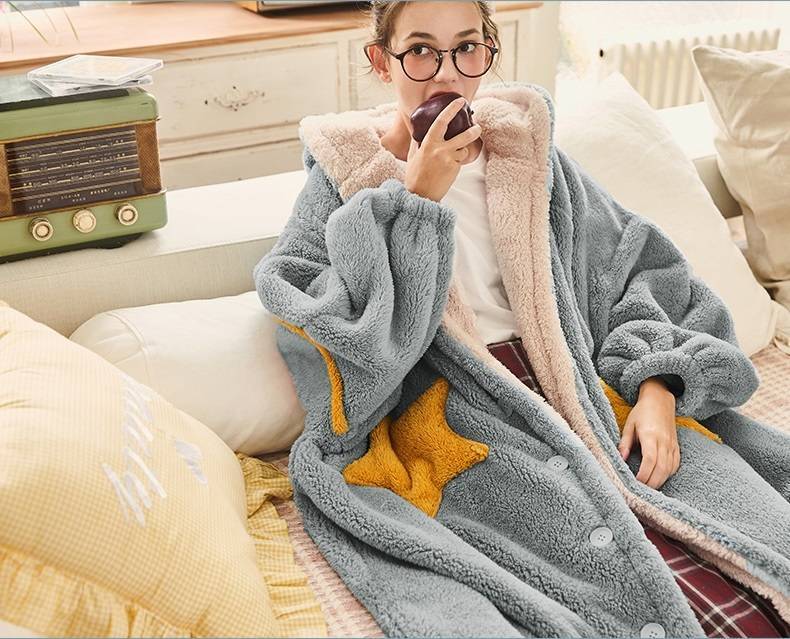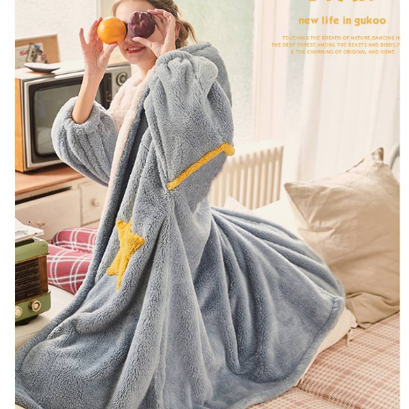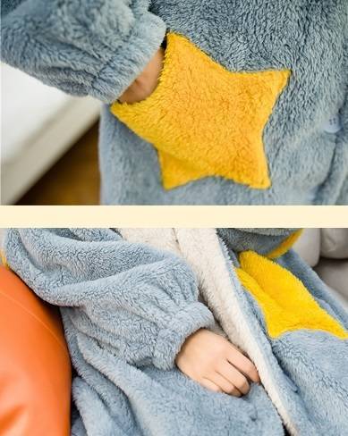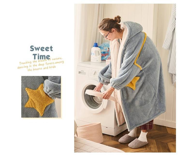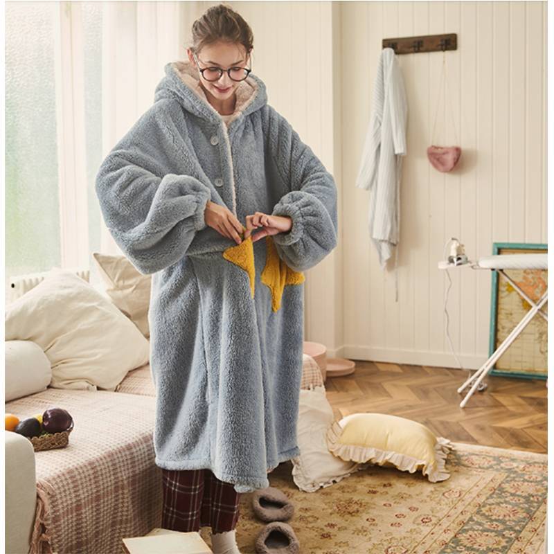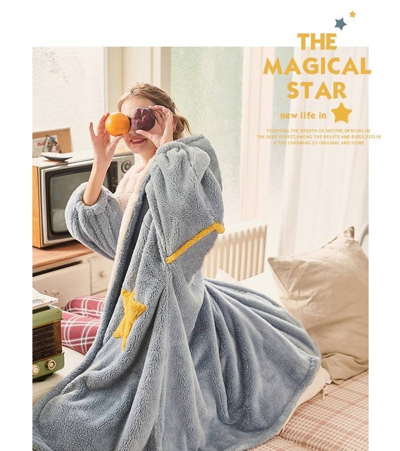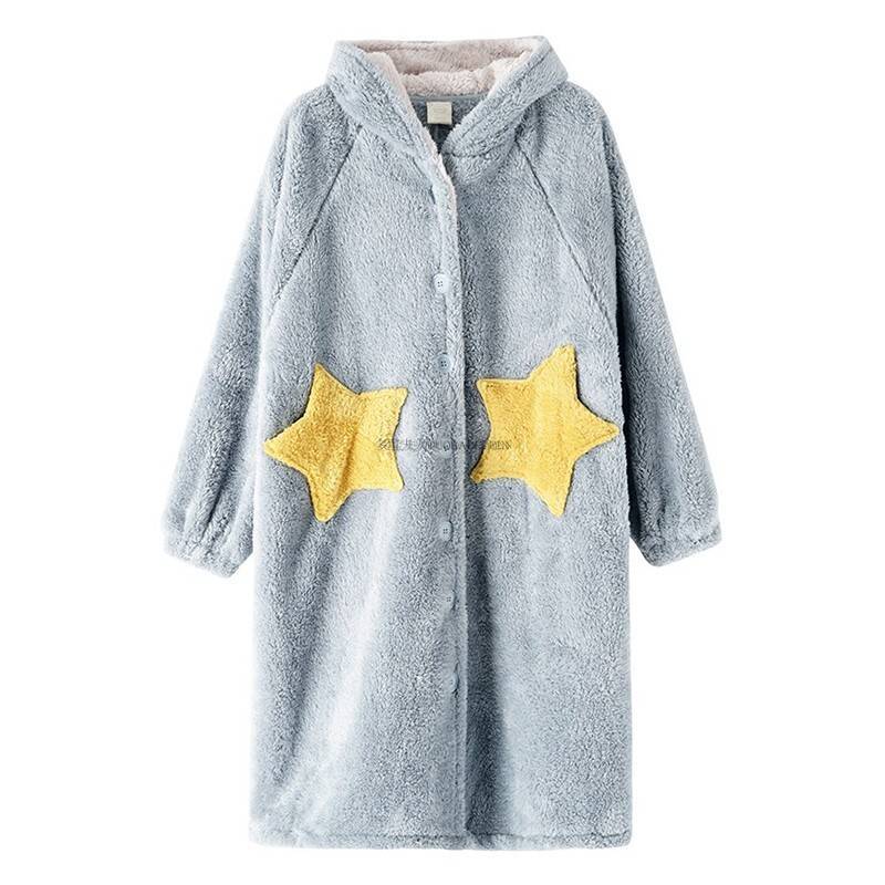 パジャマ レディース もこもこ ガウン ルームウェア 部屋着 寝巻き ナイトウェア ワンピース モコモコ 暖かい 防寒 秋 冬 星 スター ブルー フ―ディー かわいい 女子会 フード付き