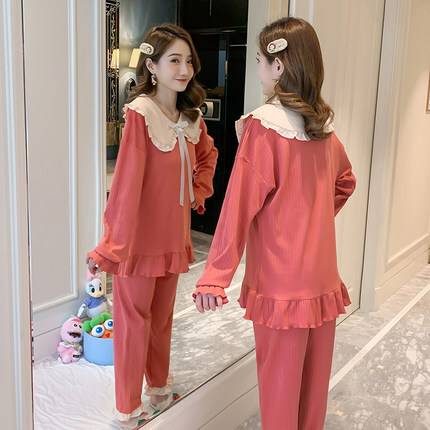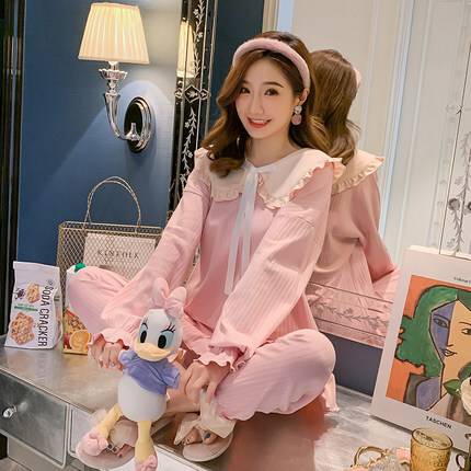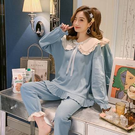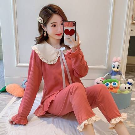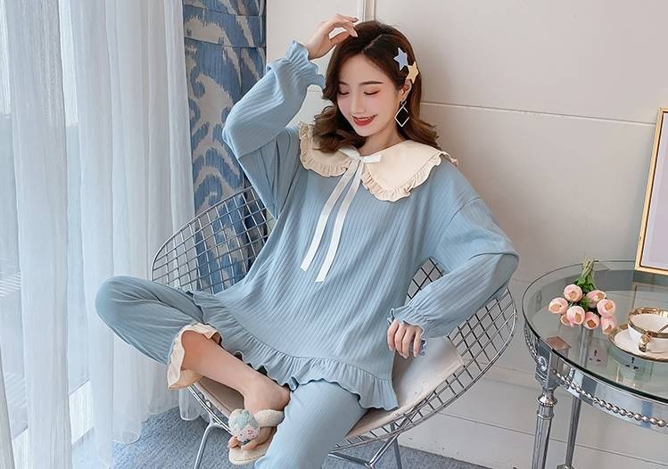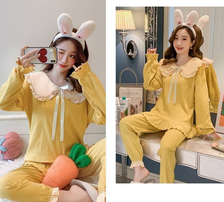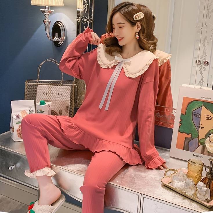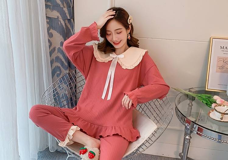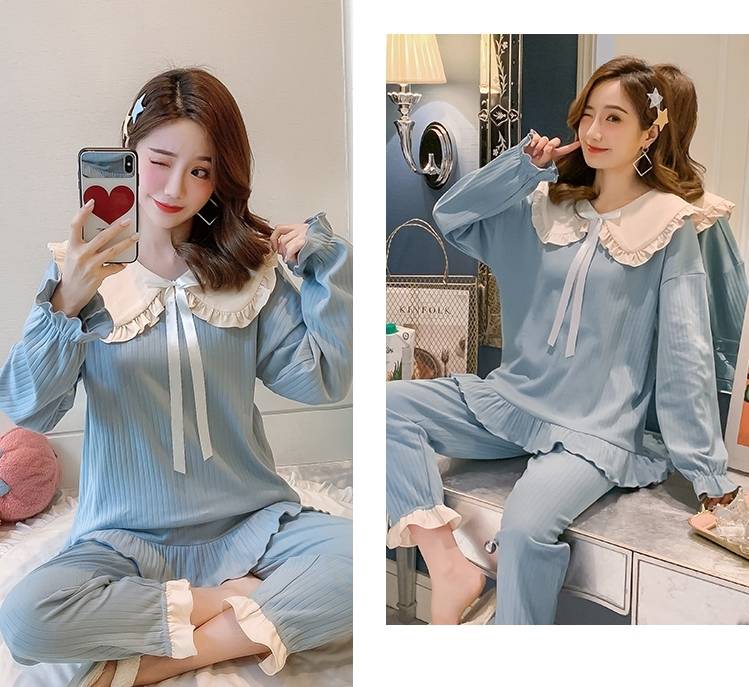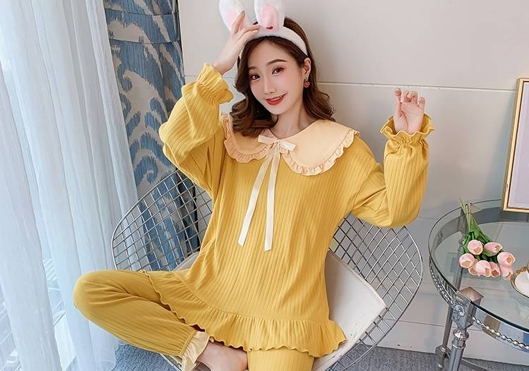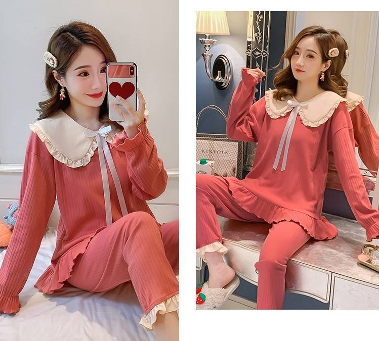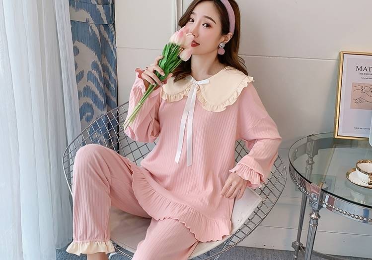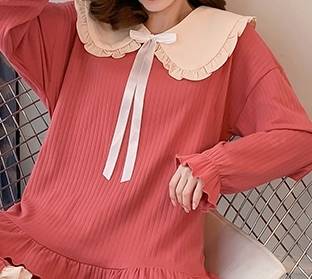 4色 パジャマ レディース 上下セット ルームウェア かわいい おしゃれ 長袖 春 秋 寝巻き 部屋着 リブ ビッグカラー リボン フリル 襟 ラブリー ガーリー xl 2xl ホームウ 大きいサイズ