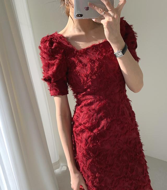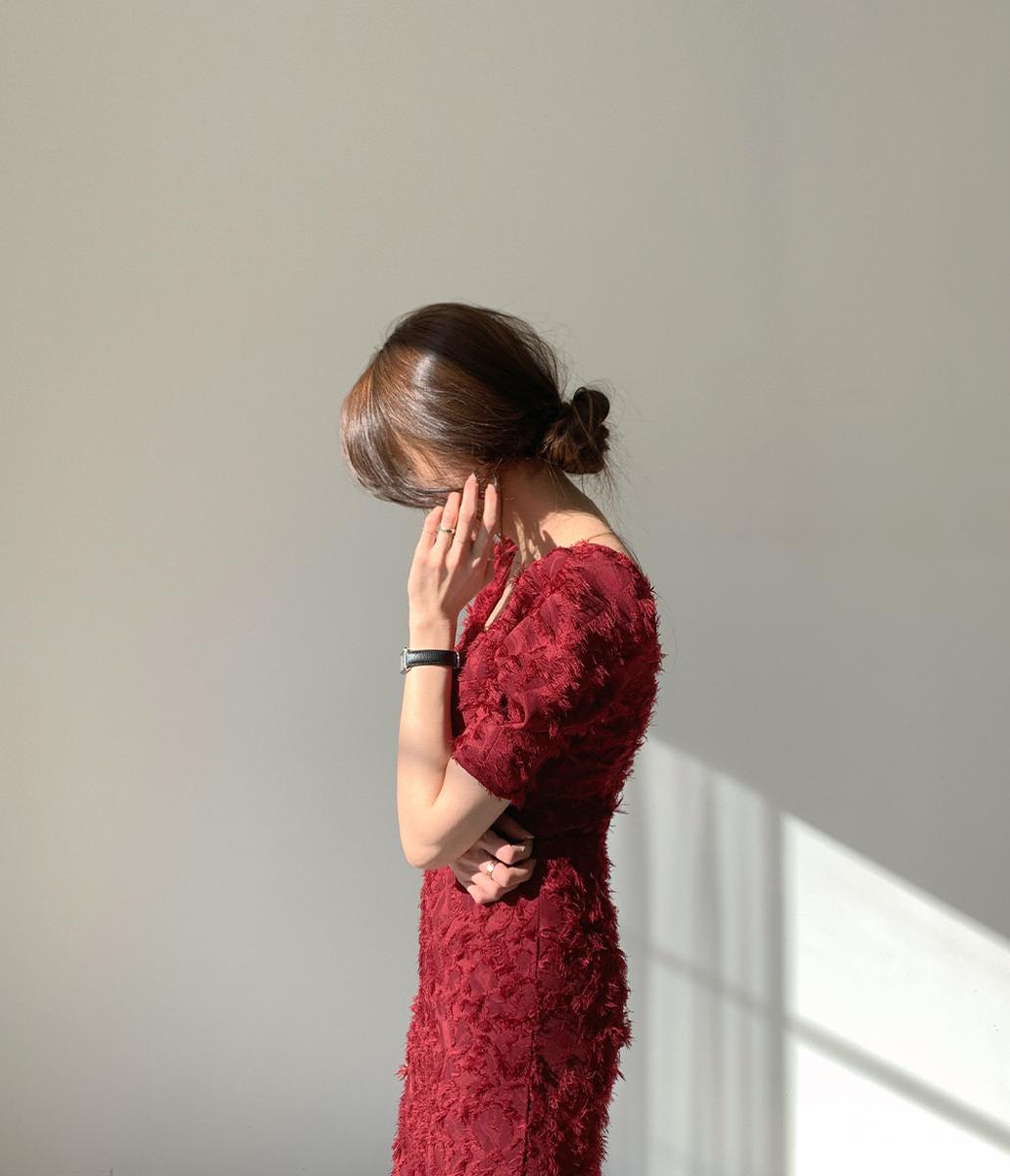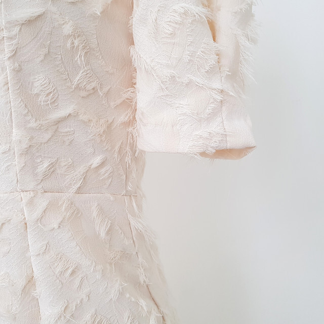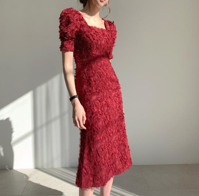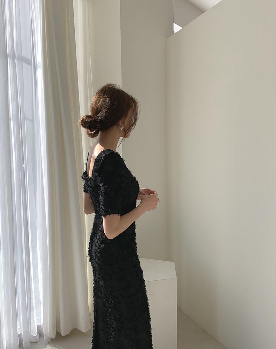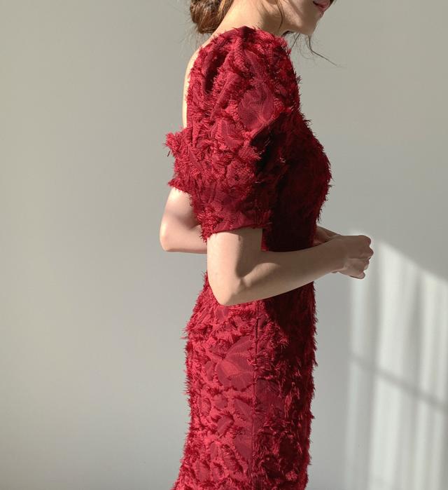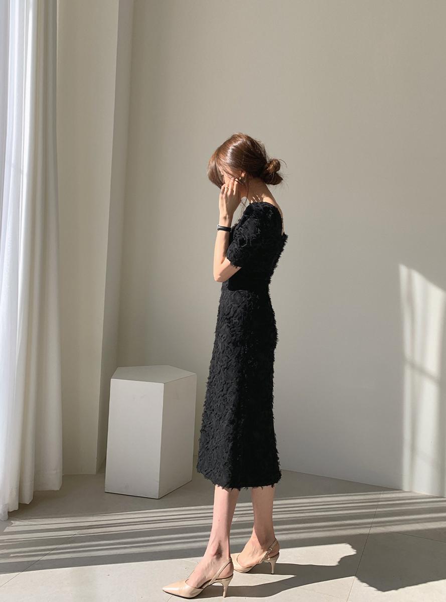 フェザー風仕立てがおしゃれな膝下スレンダードレス