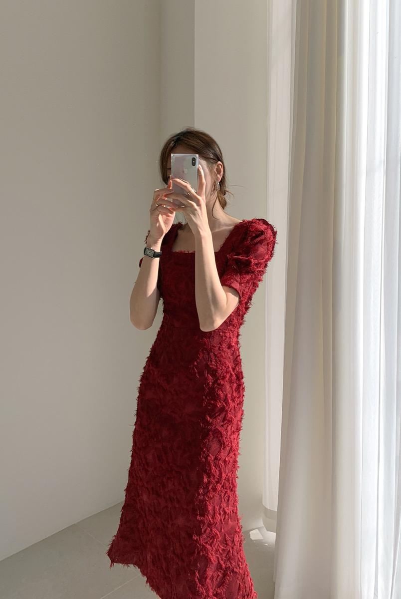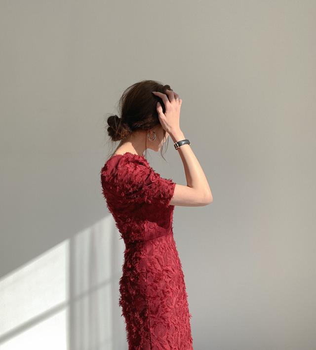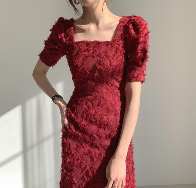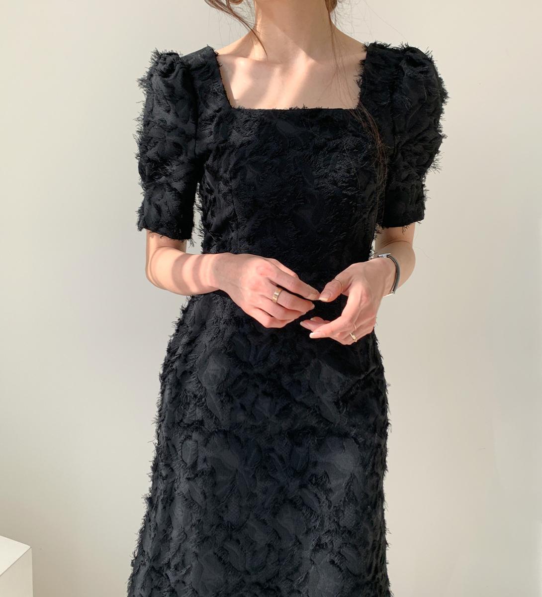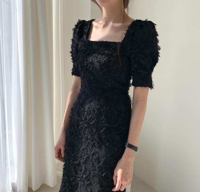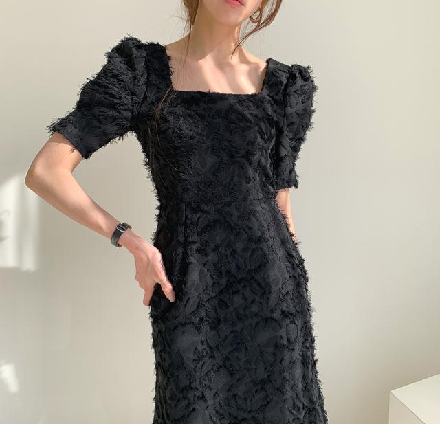スクエアネックと小ぶりボリュームの袖でレトロ&エレガントな印象に♪