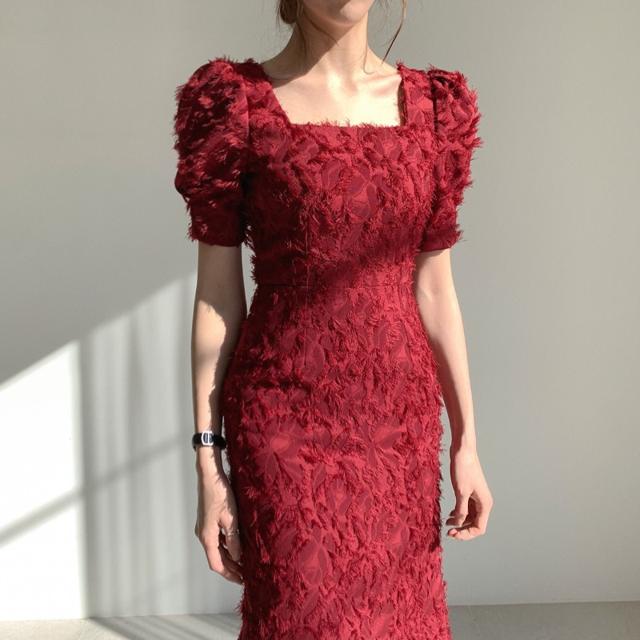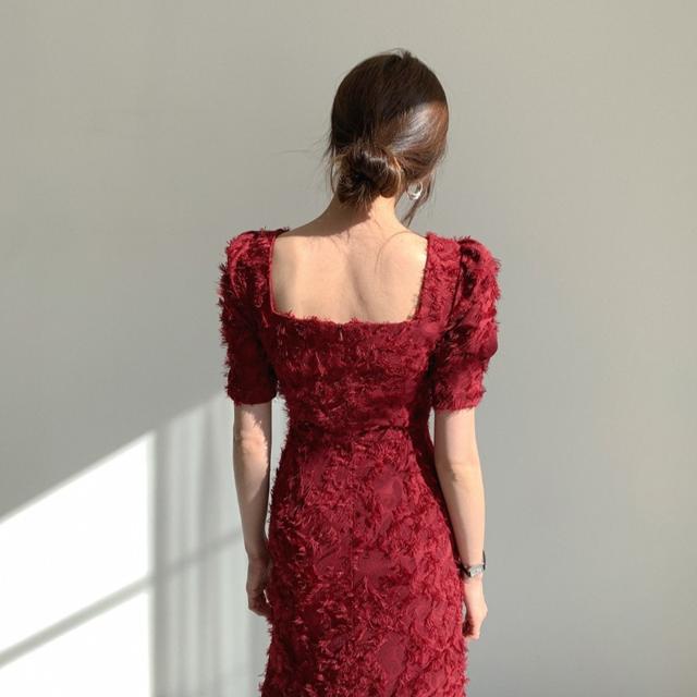 パーティードレス ミモレ丈 膝下 ひざ丈 ベージュ かっこいい 個性的 タイト 袖あり 結婚式 二次会 お呼ばれ ドレス ワンピース おしゃれ きれいめ ハイウエスト 半袖 袖付き スクエアネック
