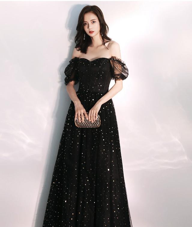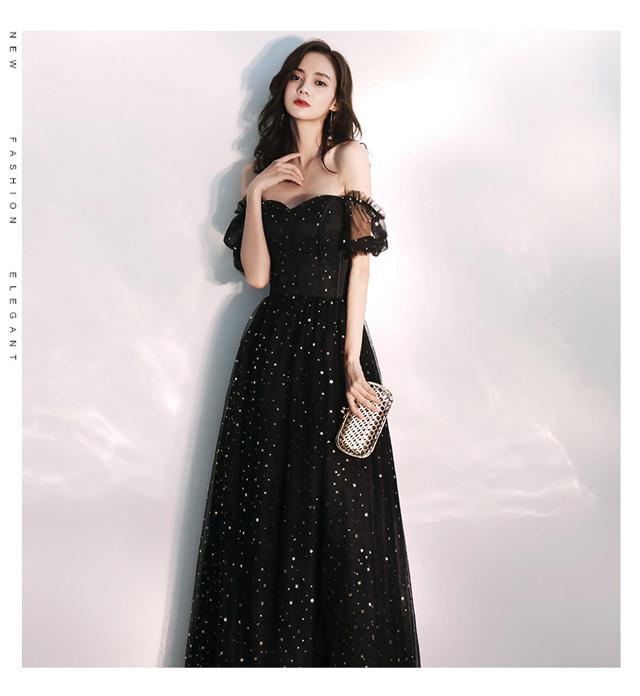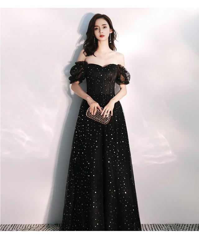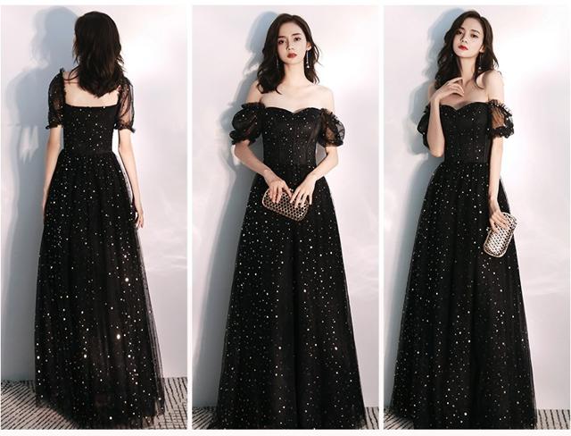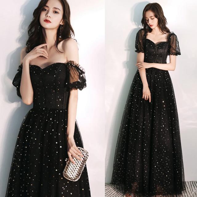 パーティードレス ロング ドレス 黒 可愛い 大きいサイズ 演奏会 結婚式 大人 ピアノ 発表会 おしゃれ きれいめ セクシー 袖あり 透け感 ブラックドレス イブニングドレス ロ オフショル