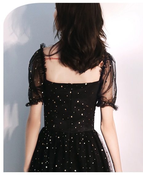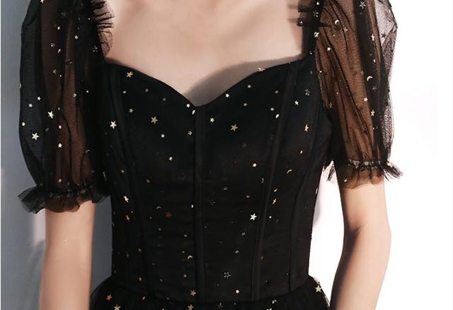 ビジューがきらめく、可愛らしいブラックドレスです。