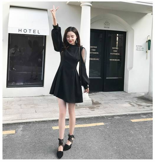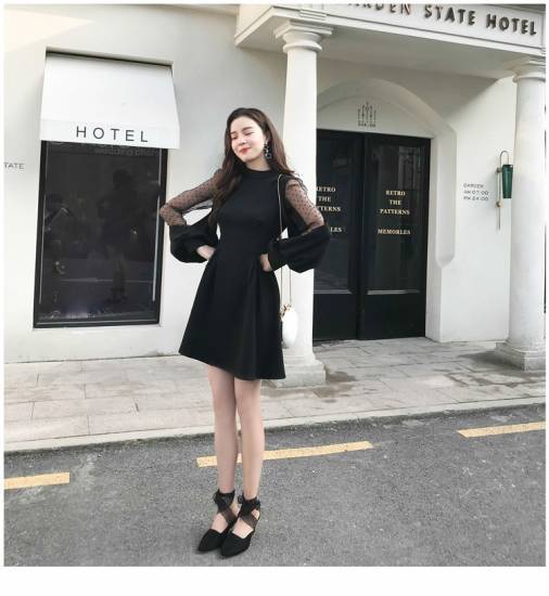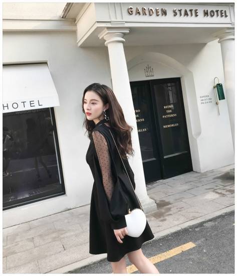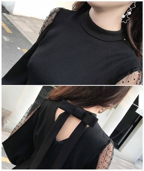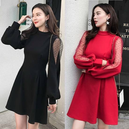 シンプルなデザインですが、低めのハイネックと、ボリューミーな袖の透け感がオシャレなワンピースです。。