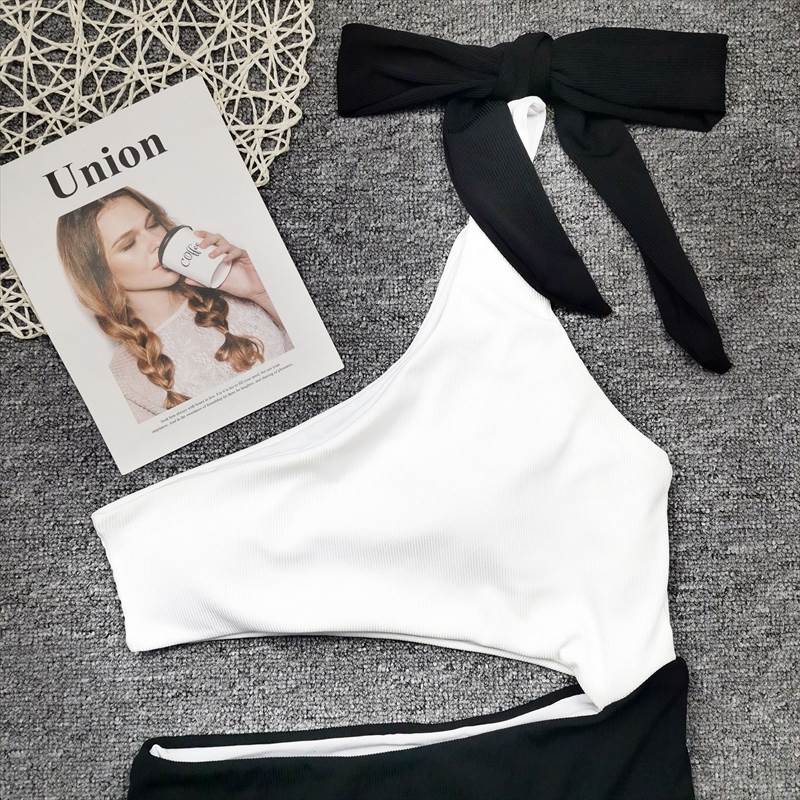 ワンピース 水着 タンキニ モノキニ レディース 黒白バイカラー ワンショル リボン ハイレグ セクシー かっこいい 海外 ビキニ風 セパレート風 アシンメトリー 小胸 モノトーン 大人 個性的