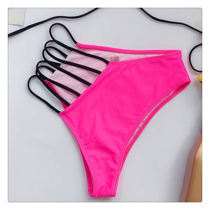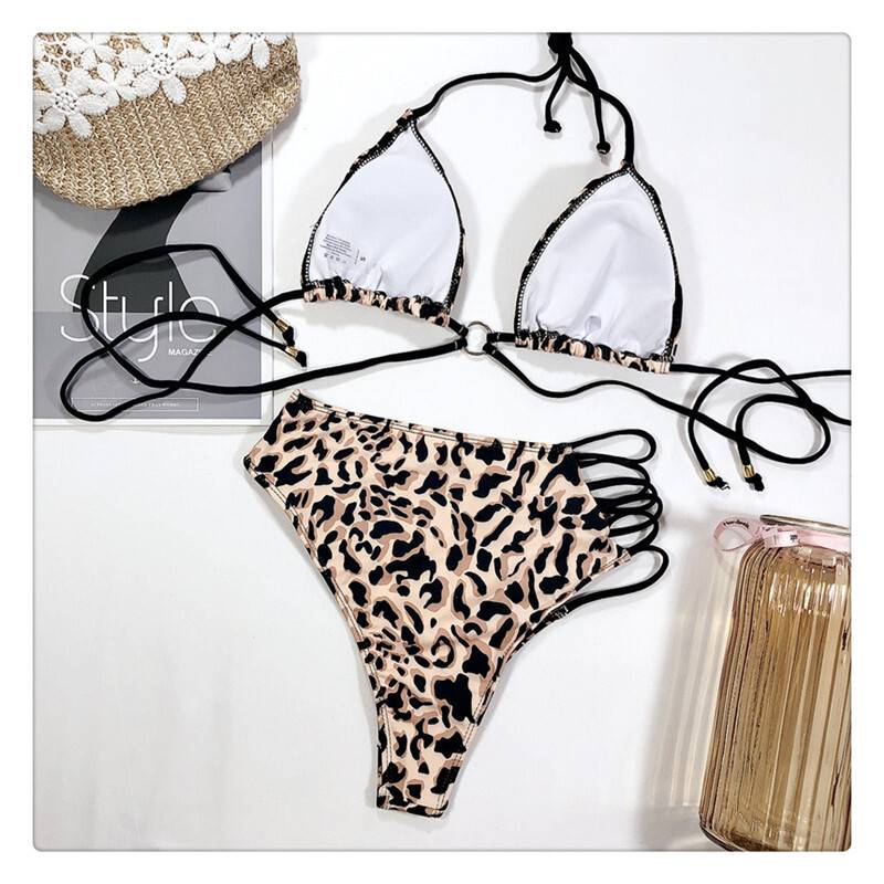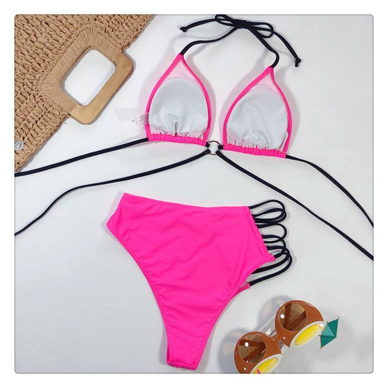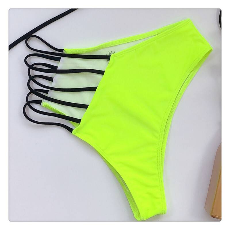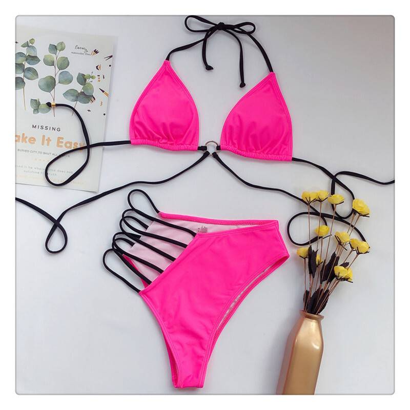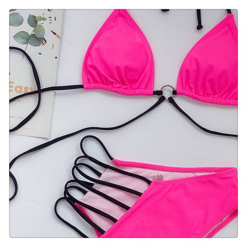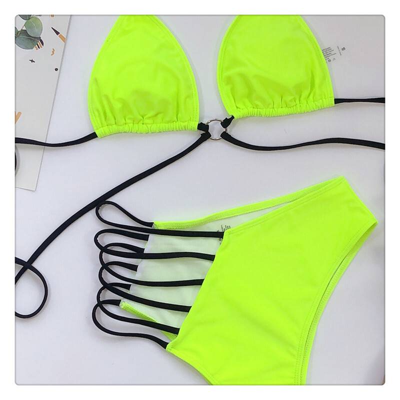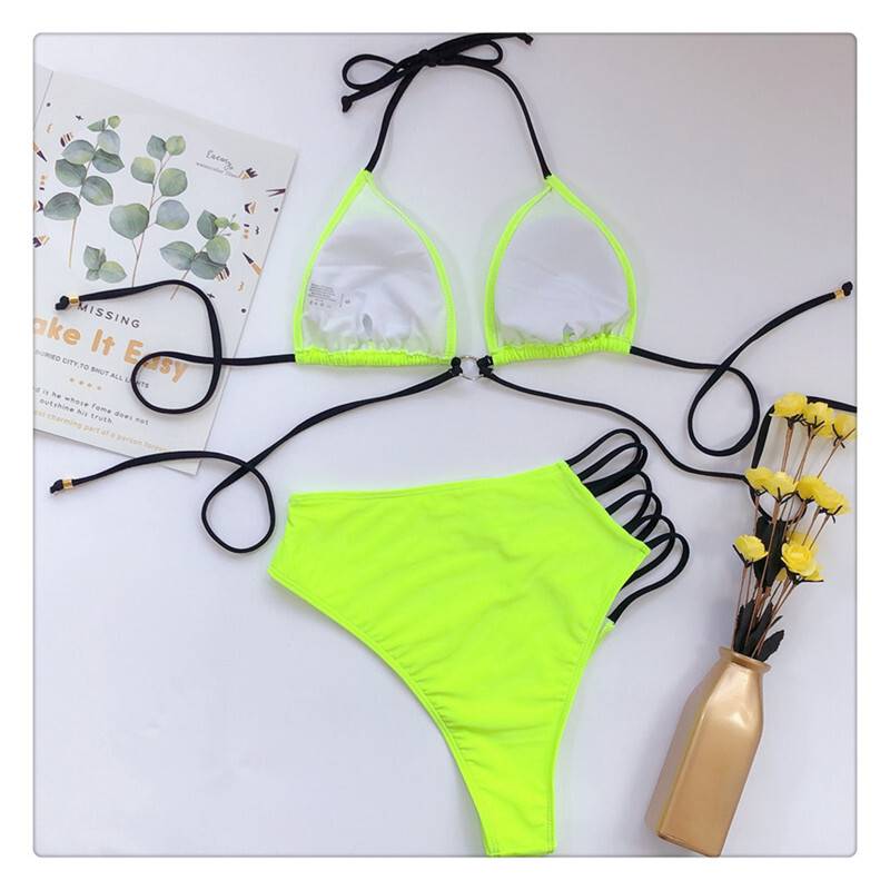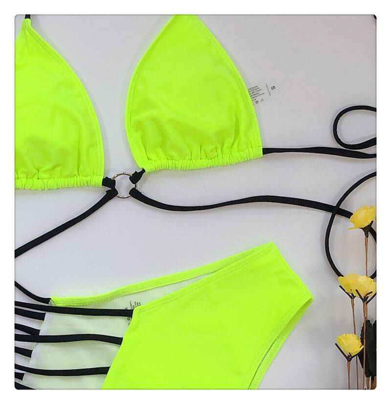 水着 ビキニ レディース ヒョウ柄 蛍光色 セクシー トライアングル ブラジリアン ホルターネック 紐 かっこいい アシンメトリー 三角 大人 レオパード イエロー ピンク 切り替えデザ 無地