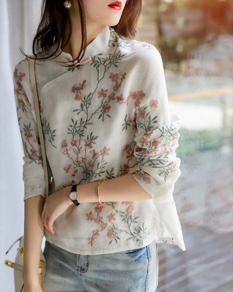 花柄 ブラウス シャツ 華やか チャイナ風 可愛い 個性的 袖あり 白 トップス 刺繍 フラワー ピンク カッコイイ レトロ きれいめ プルオーバー スタイリッシュ M 大きいサイズ L レディース
