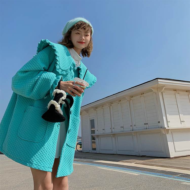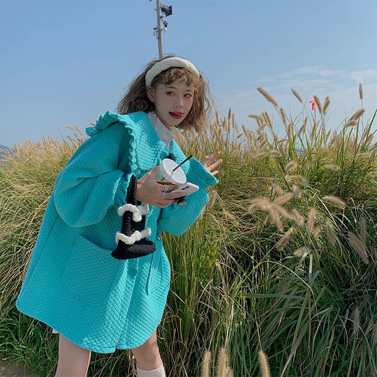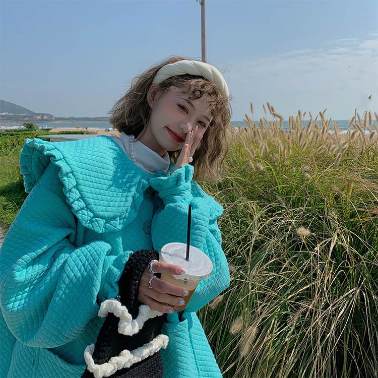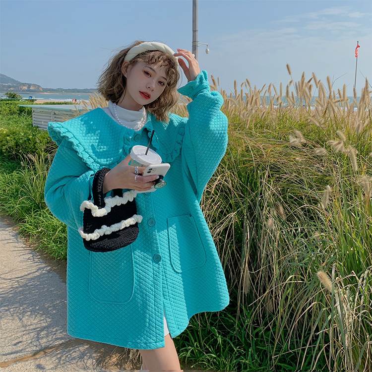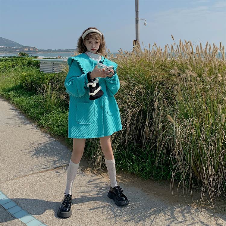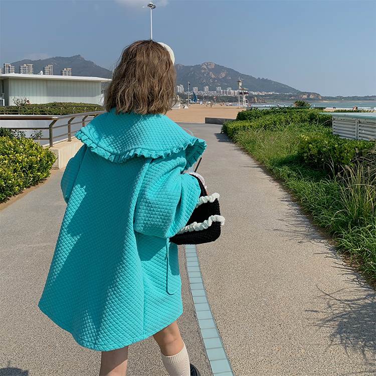 2色 アウター コート レディース ショート丈 ミドル丈 ビックカラー フリル 個性的 かわいい 青 白 ブルー ホワイト 襟付き 長袖 上着 大人可愛い かっこいい ラブリー ガーリー カ おしゃれ