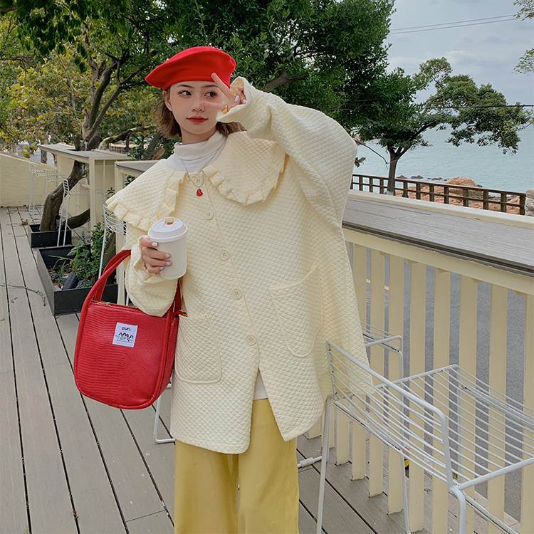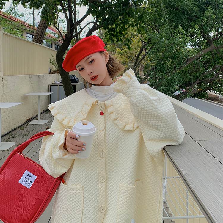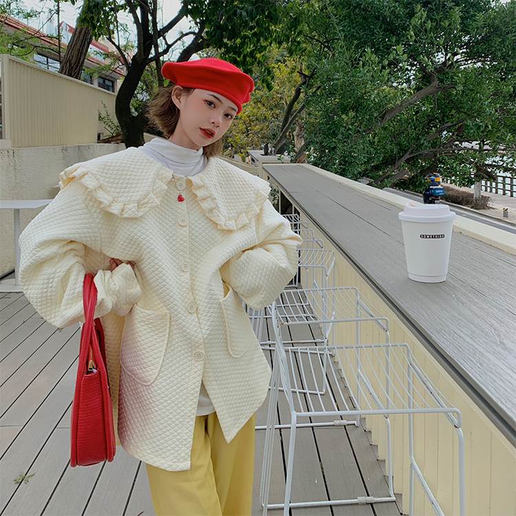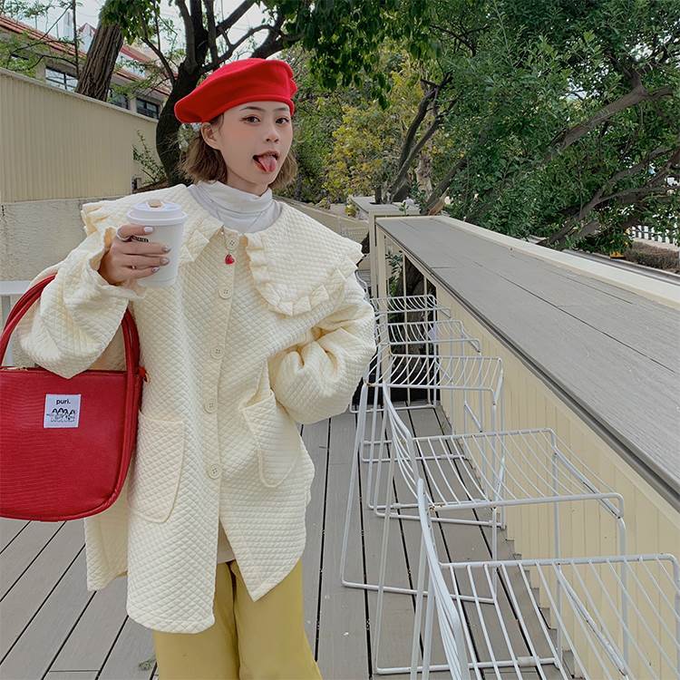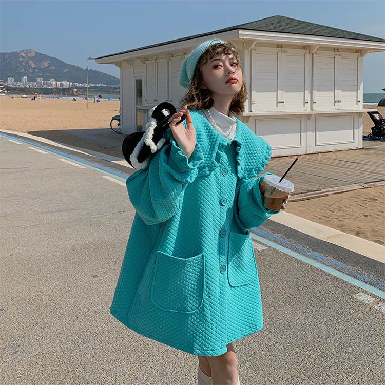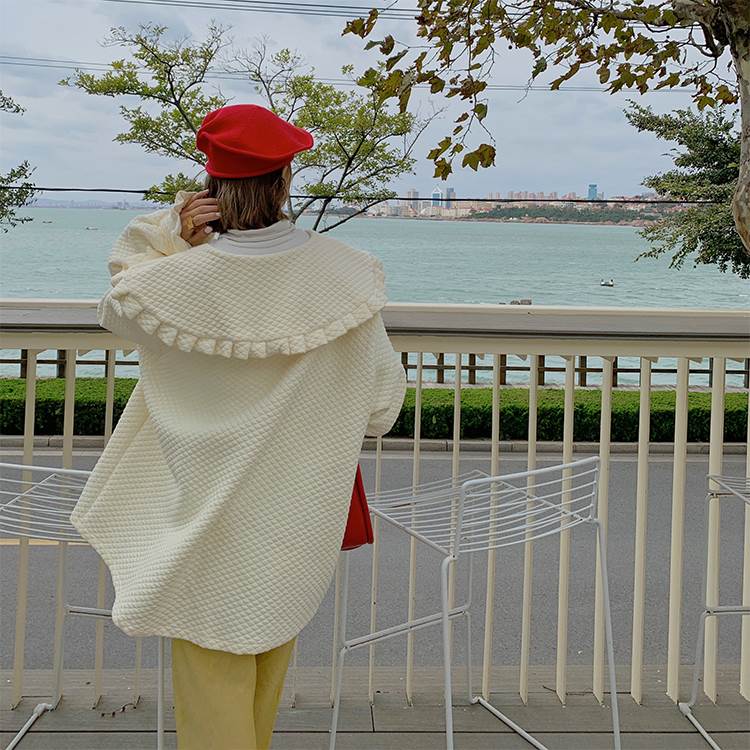 2色 アウター コート レディース ショート丈 ミドル丈 ビックカラー フリル 個性的 かわいい 青 白 ブルー ホワイト 襟付き 長袖 上着 大人可愛い かっこいい ラブリー ガーリー カ おしゃれ