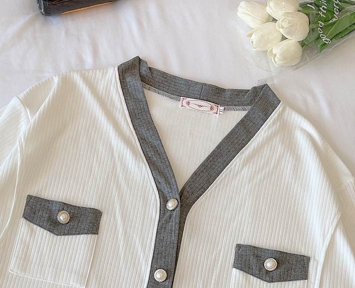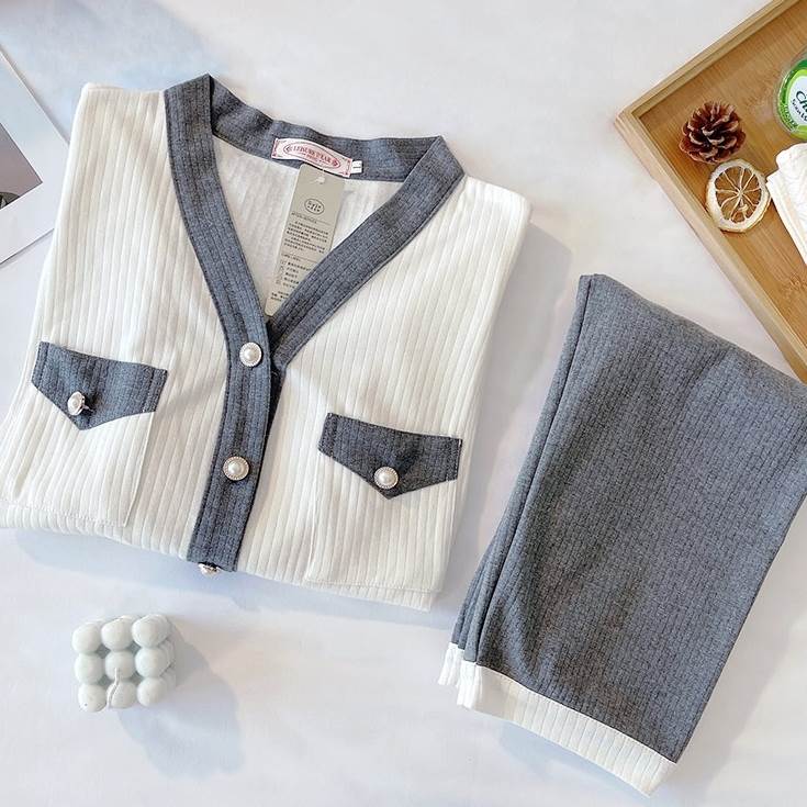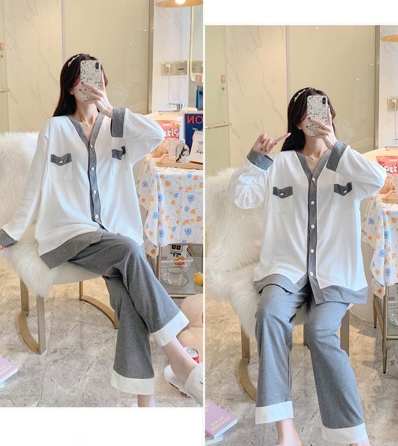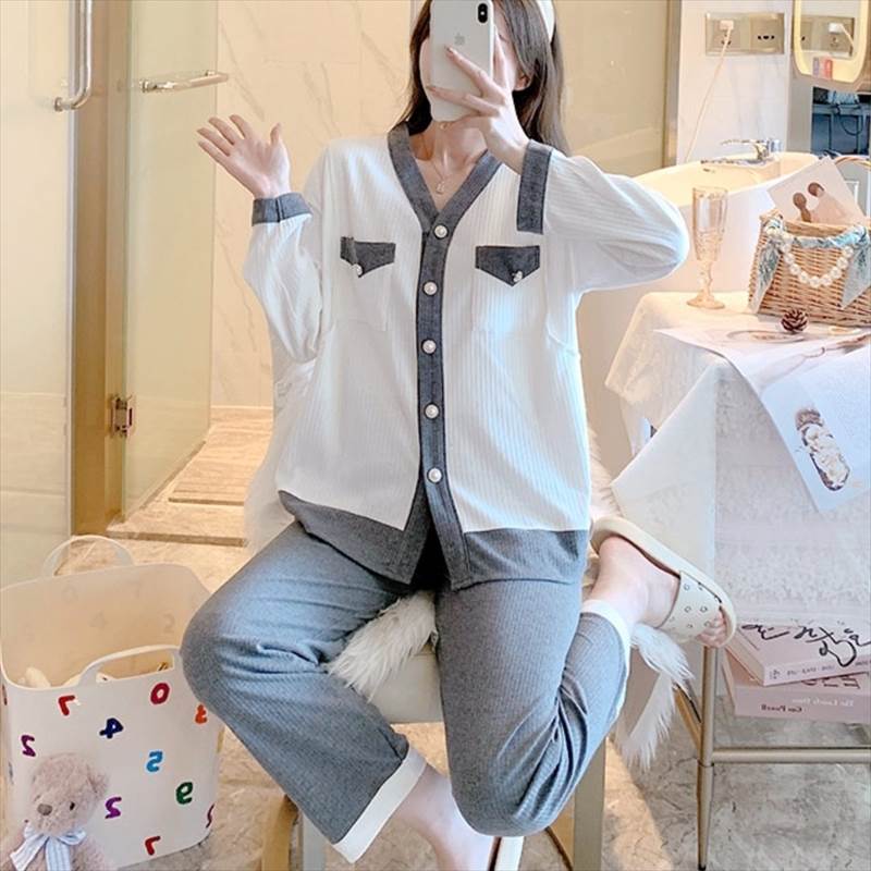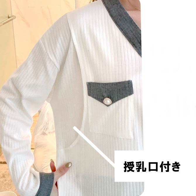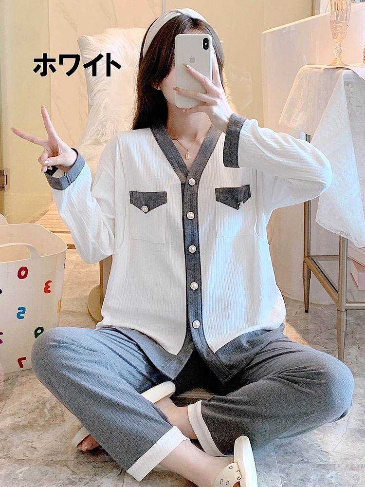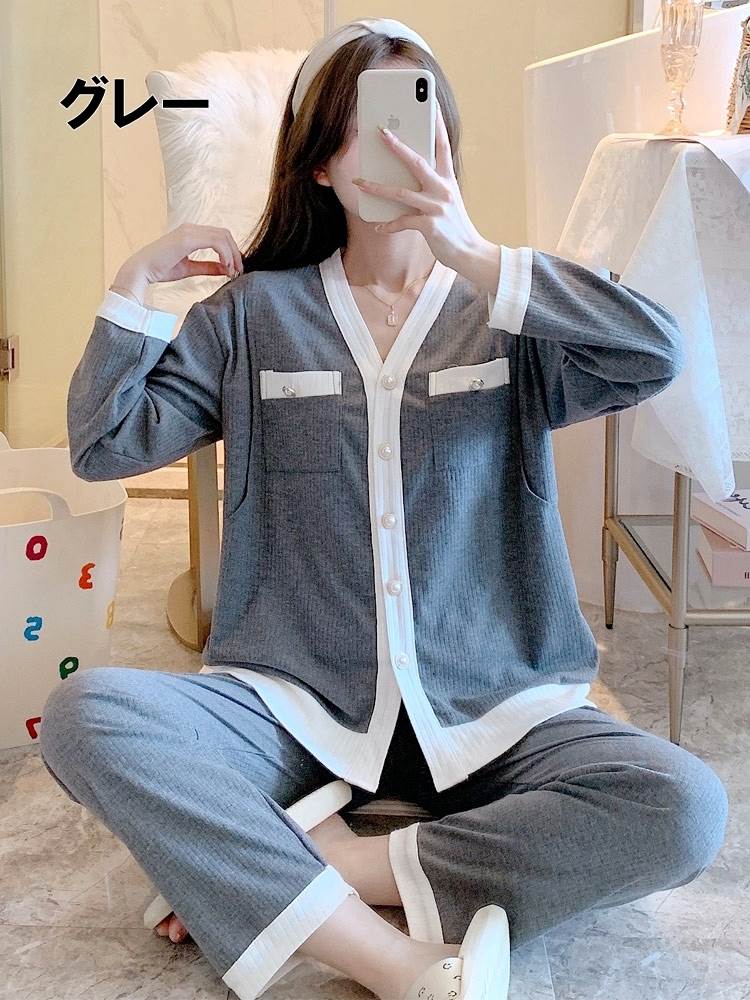 ルームウェア パジャマ レディース 上下セット マタニティ ママ 授乳口 パンツ パールボタン リブ 白 グレー 無地 バイカラー モノトーン 薄手 春 秋 部屋着 女の子 トリム 長袖 寝巻き
