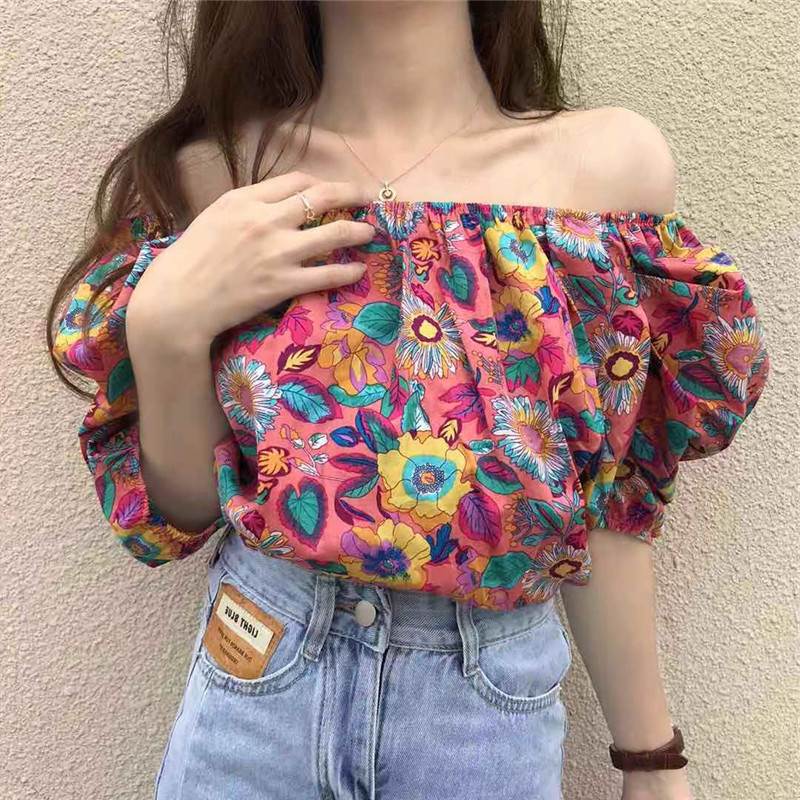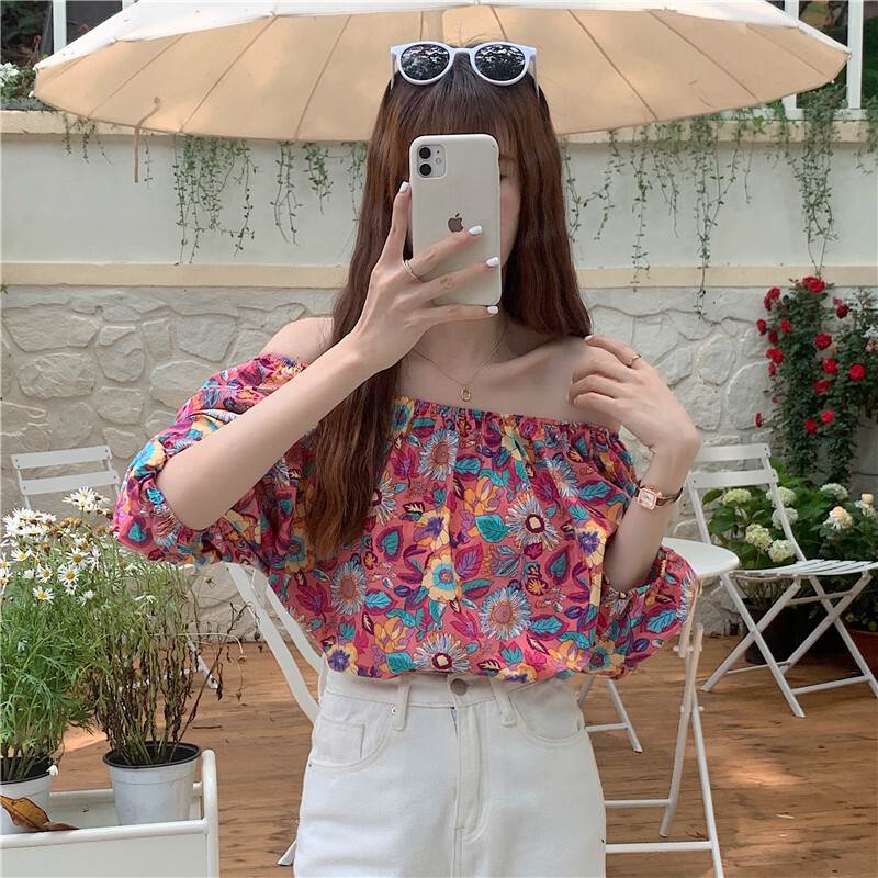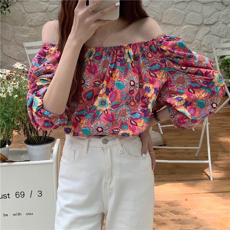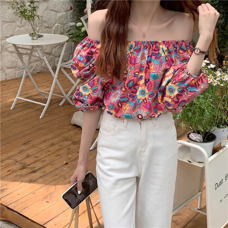 2色 トップス オフショル オフショルダー 花柄 肩出し お姉さん セクシー パフスリーブ 着回し 可愛い 半袖 ゆったりめ きれいめ プリティ ビビット モテる 着痩せ レディース スタイリッシュ