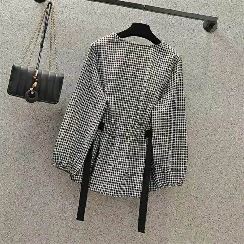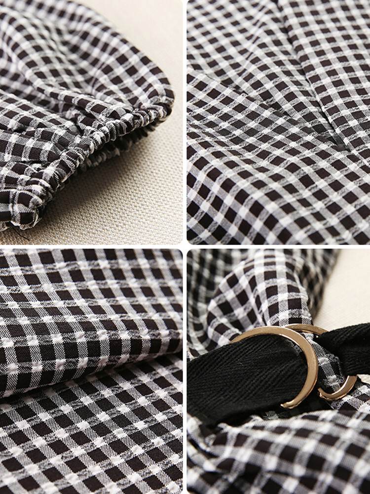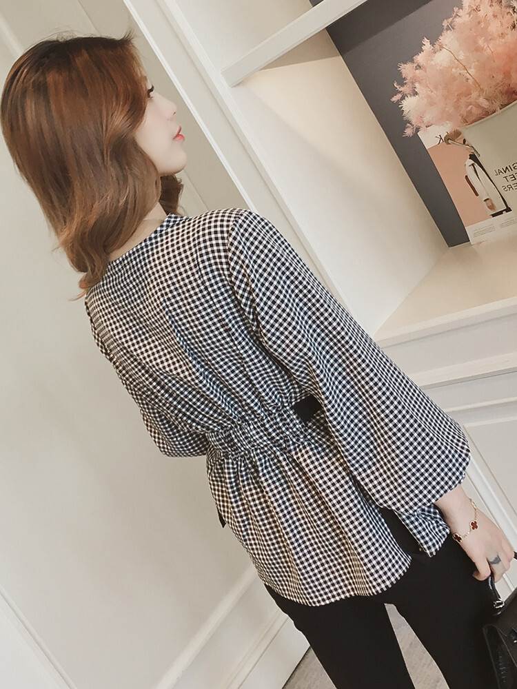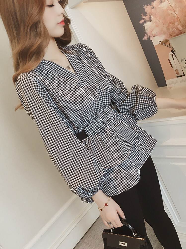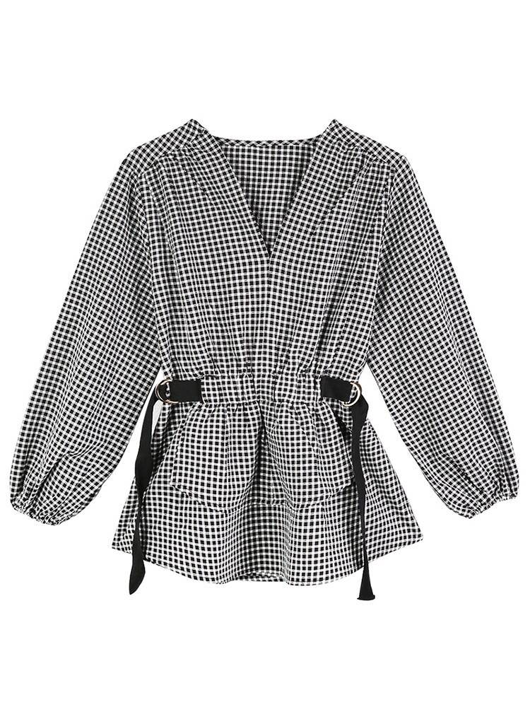 チェック柄 ブラウス シャツ ギンガムチェック 長袖 ウエストマーク 可愛い レトロ フリル ボリューム袖 Vネック ロング丈 トップス 春 秋 着回し ガーリー かっこいい カジュアル きれい 上品