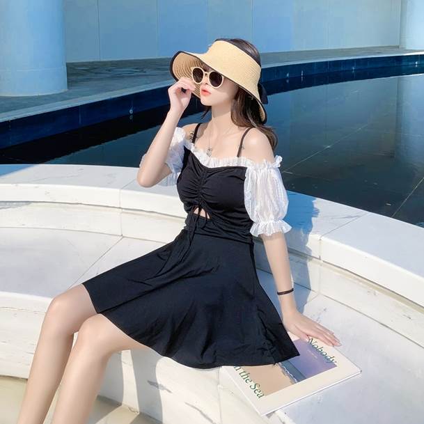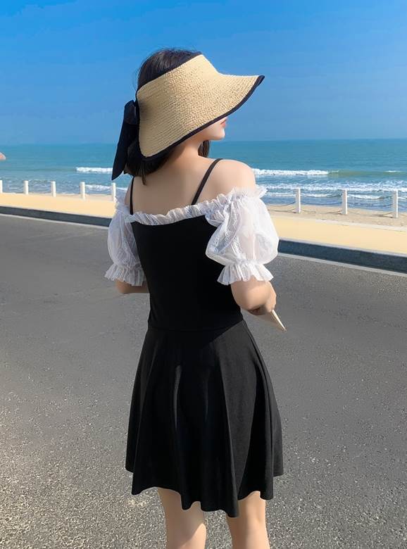 水着 ワンピース レディース スカート 袖あり レトロ ガーリー 可愛い 体型カバー 韓国 黒 ピンク ブルー モノトーン フリル バイカラー フェミニン 透け感 シアー シャー 袖付き
