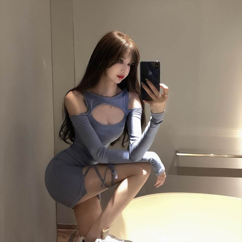 キャバ ドレス ニット ワンピ レディース ミニ タイト セクシー 大人可愛い 胸元開き 谷間 オフショル風 肩出し リボン アインメトリー おしゃれ キャバ嬢 長袖 ワンピース 超ミニ きれい 細身