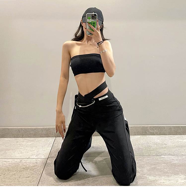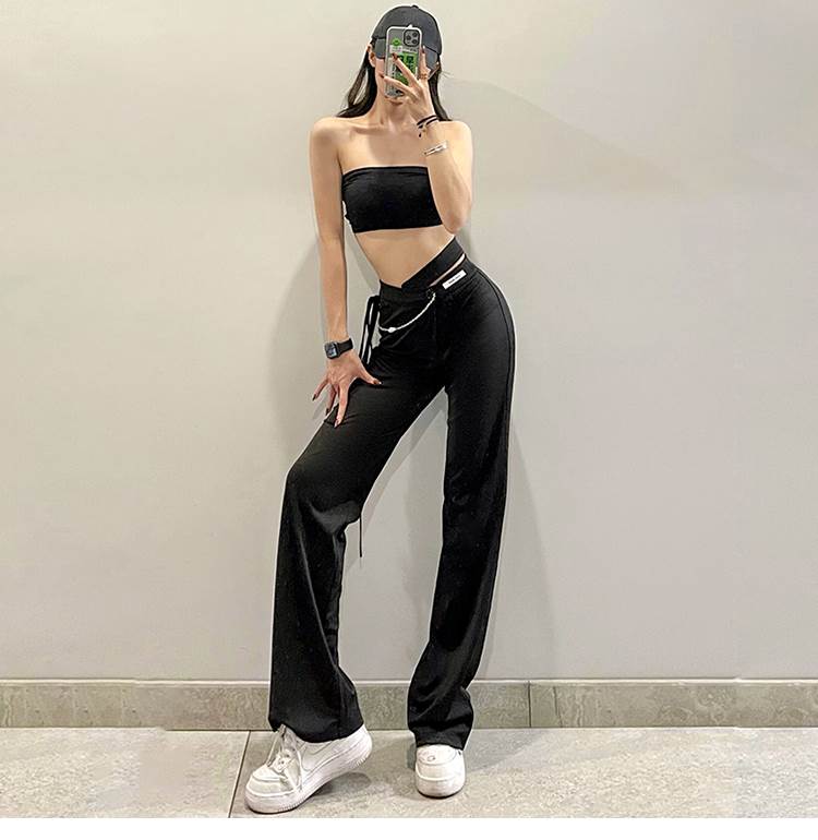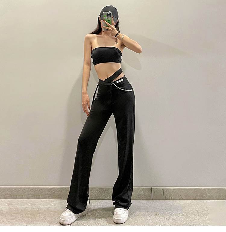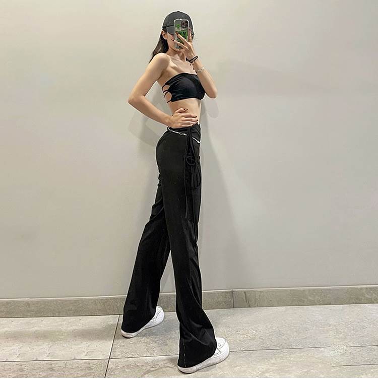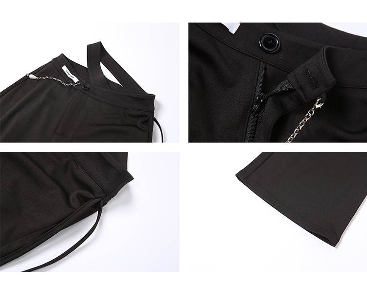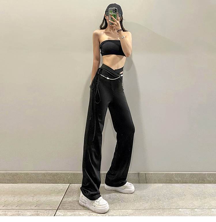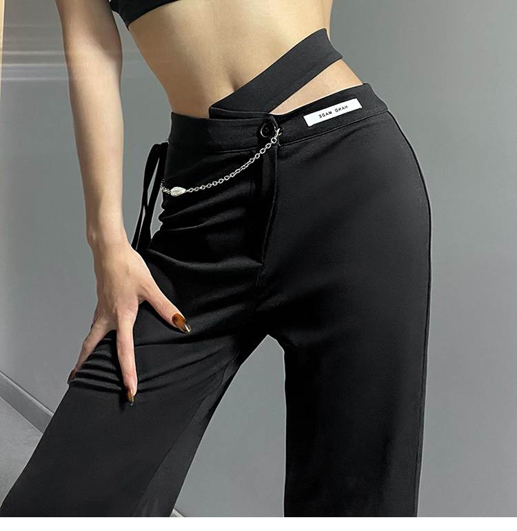 黒 パンツ レディース ボトムス ズボン シンプル カジュアル おしゃれ お洒落 かっこいい 個性的 アシンメトリー チェーン ハイウエスト ストレートパンツ こなれ感 ラフ メンズラ ブラックコーデ