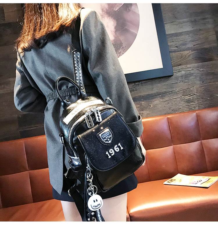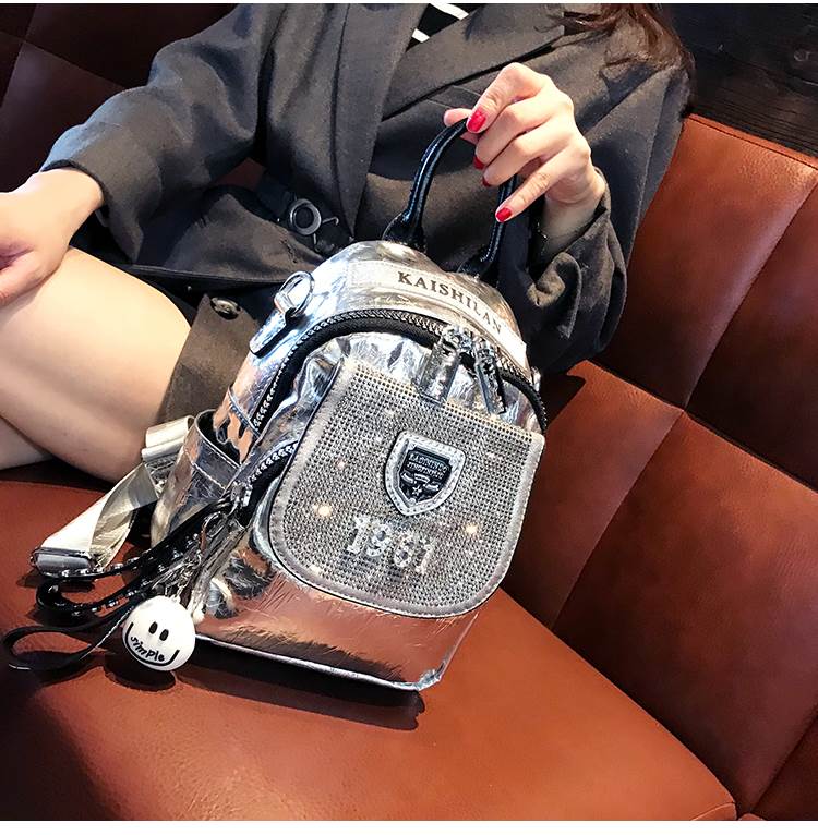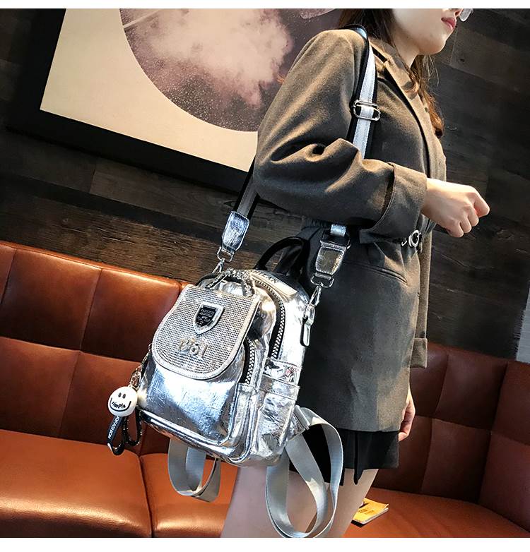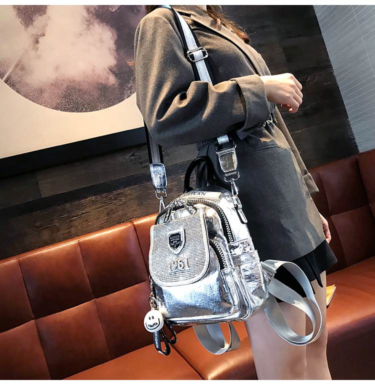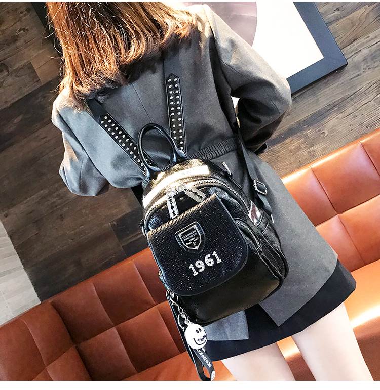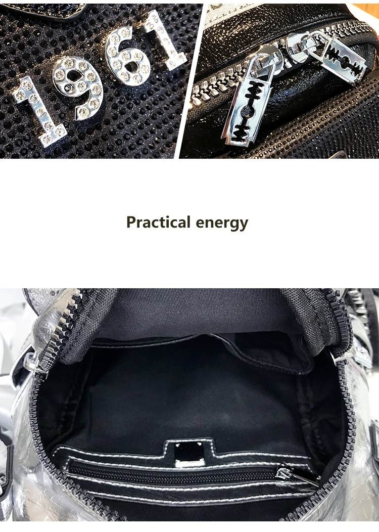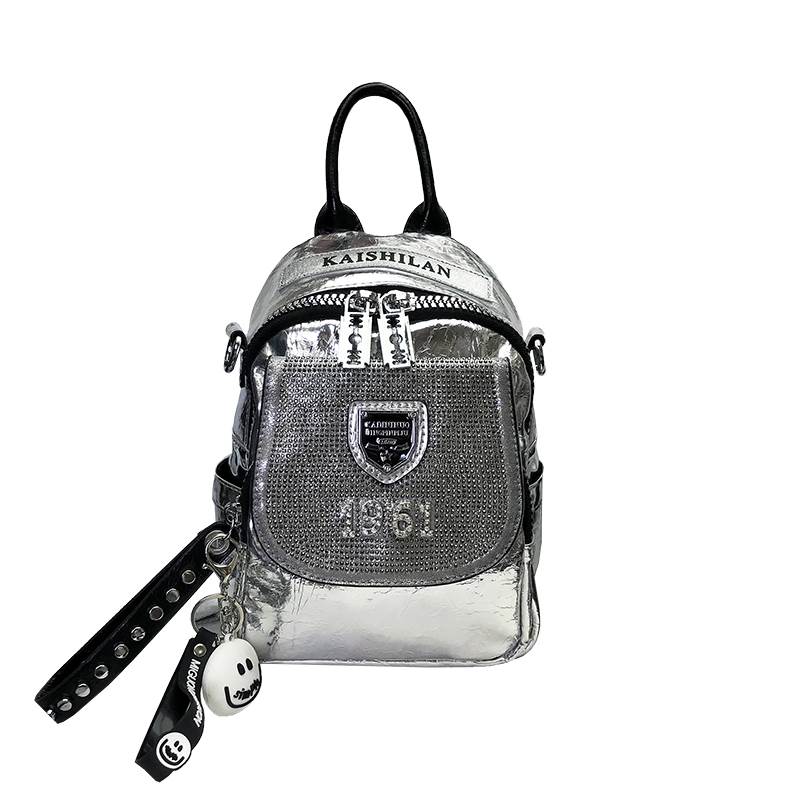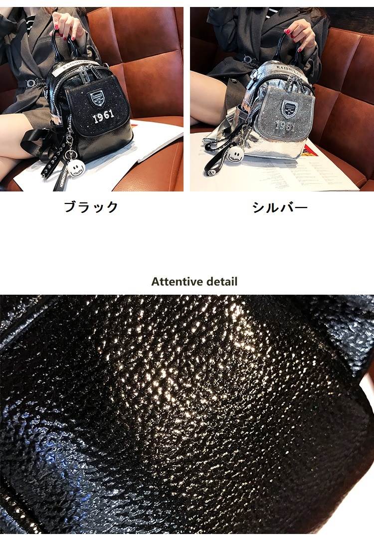 2色 リュック リュックサック ハイセンス 山登り 登山 煌びやか チャーム インパクト ストリート ラインストーン ロゴ 手持ち スマイル 派手 バッグ レディース 学生 ブラック シルバ ジッパー