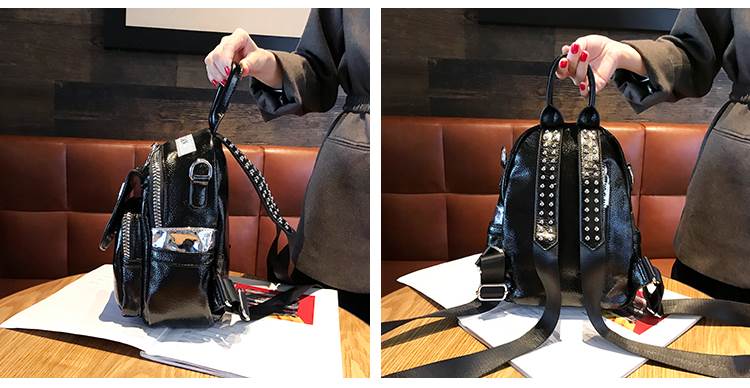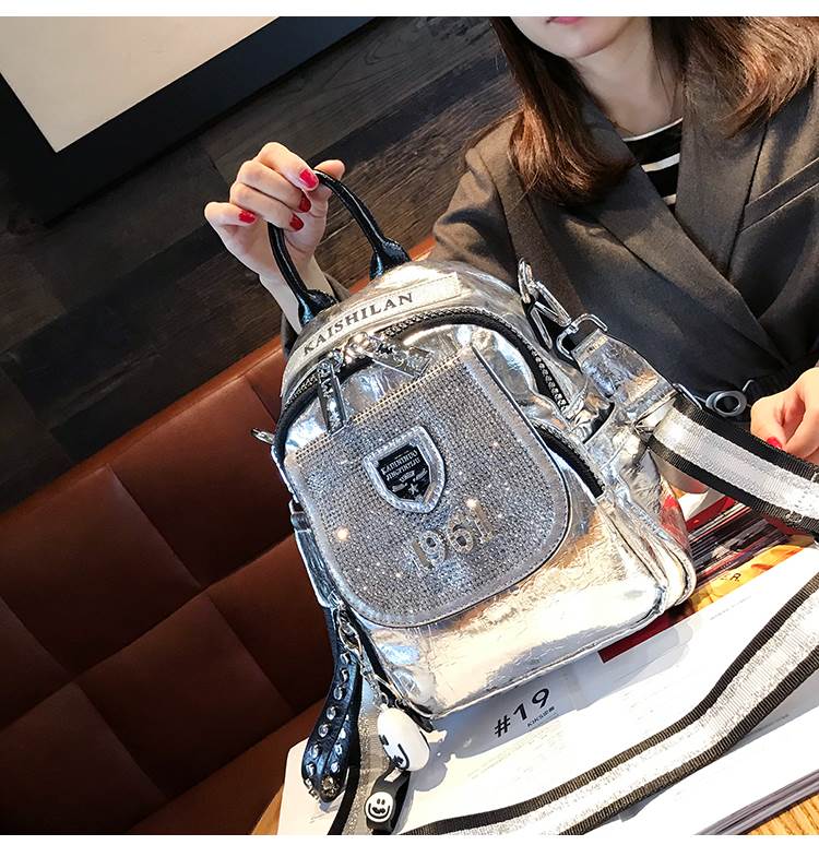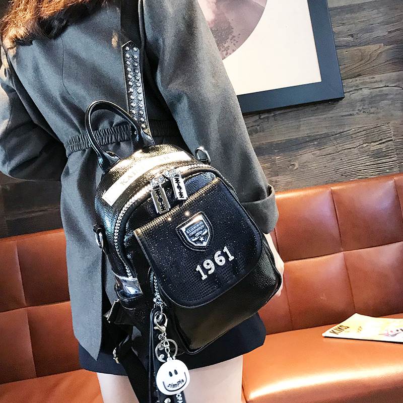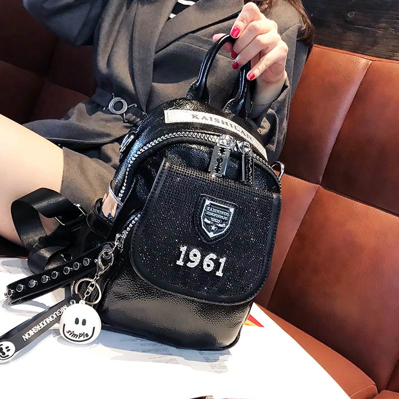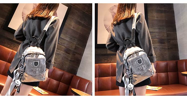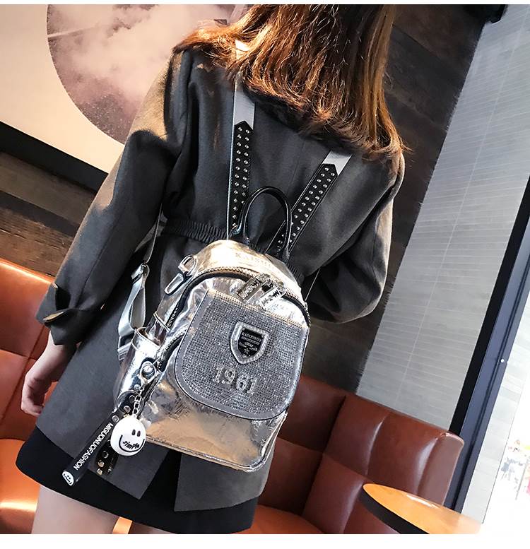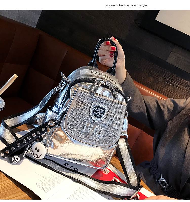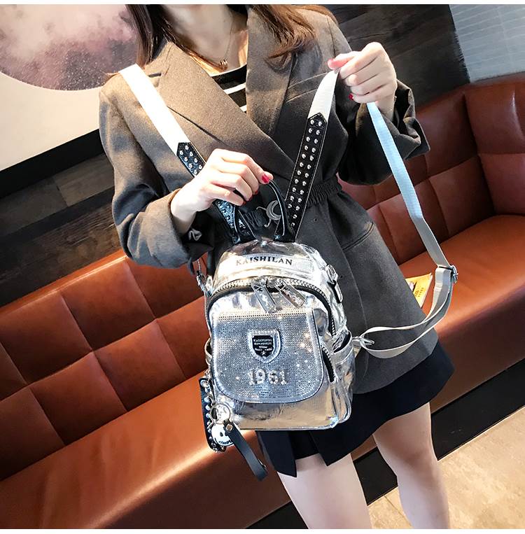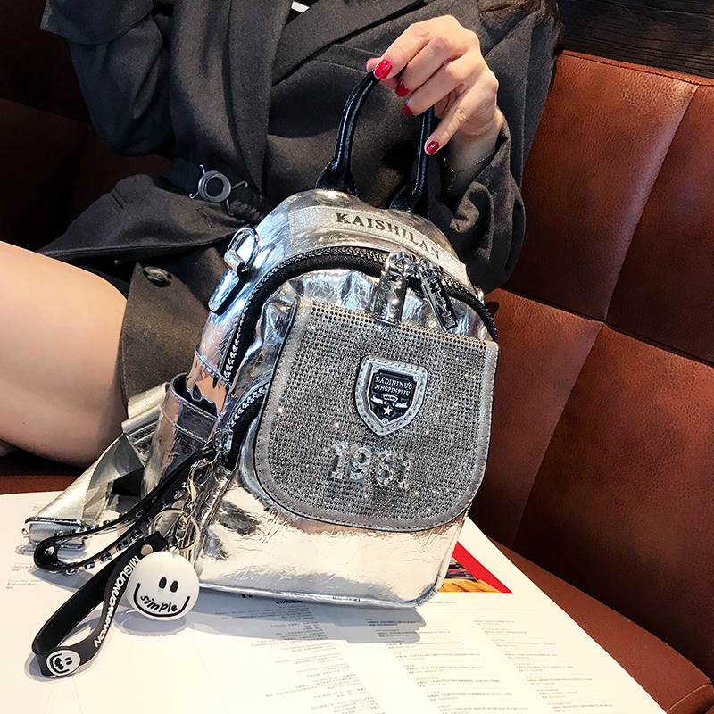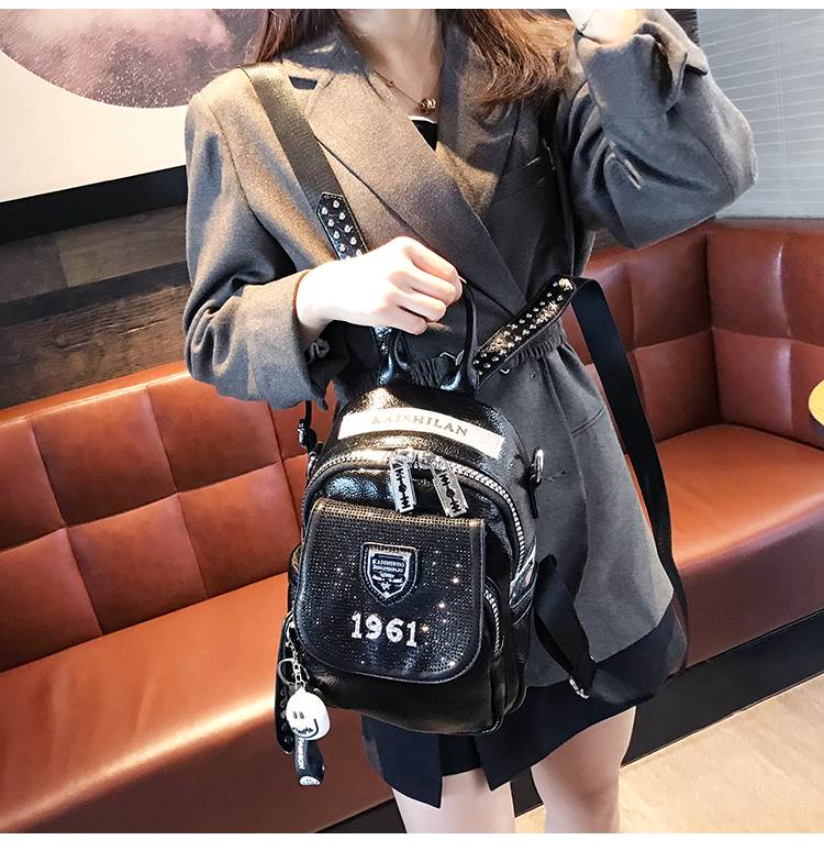 2色 リュック リュックサック ハイセンス 山登り 登山 煌びやか チャーム インパクト ストリート ラインストーン ロゴ 手持ち スマイル 派手 バッグ レディース 学生 ブラック シルバ ジッパー