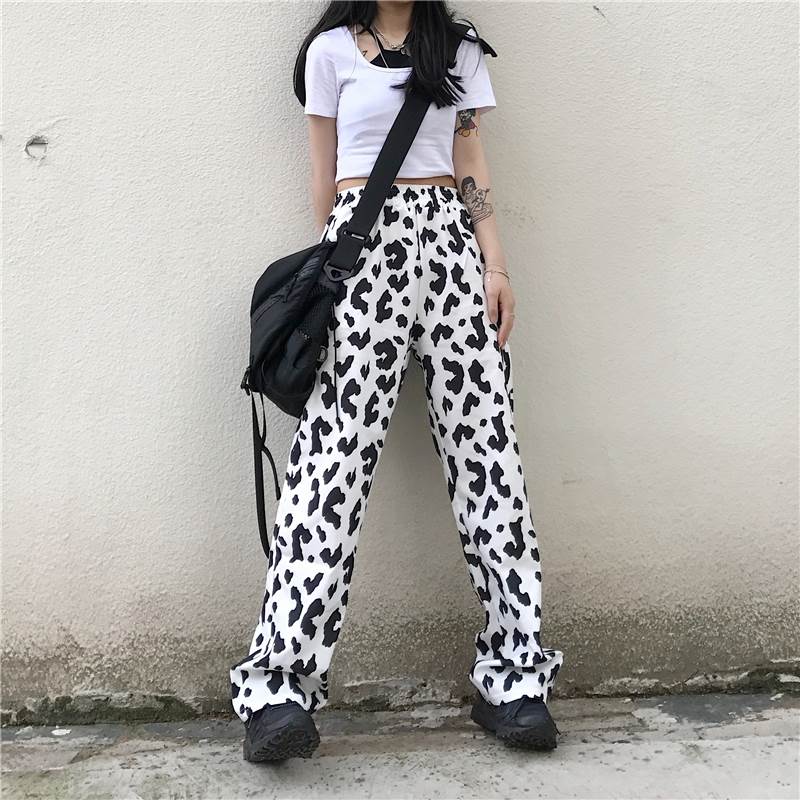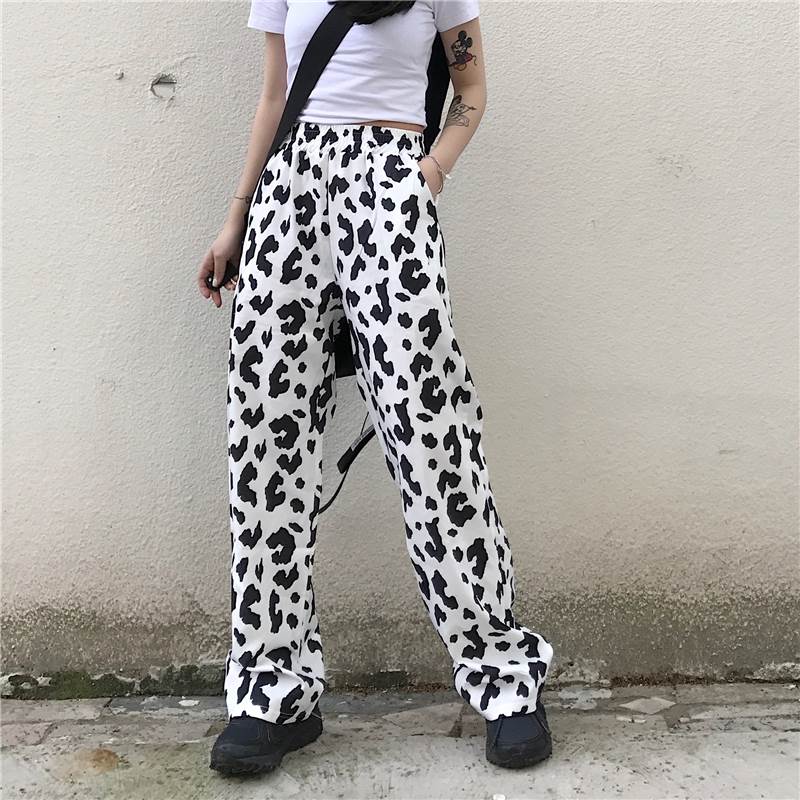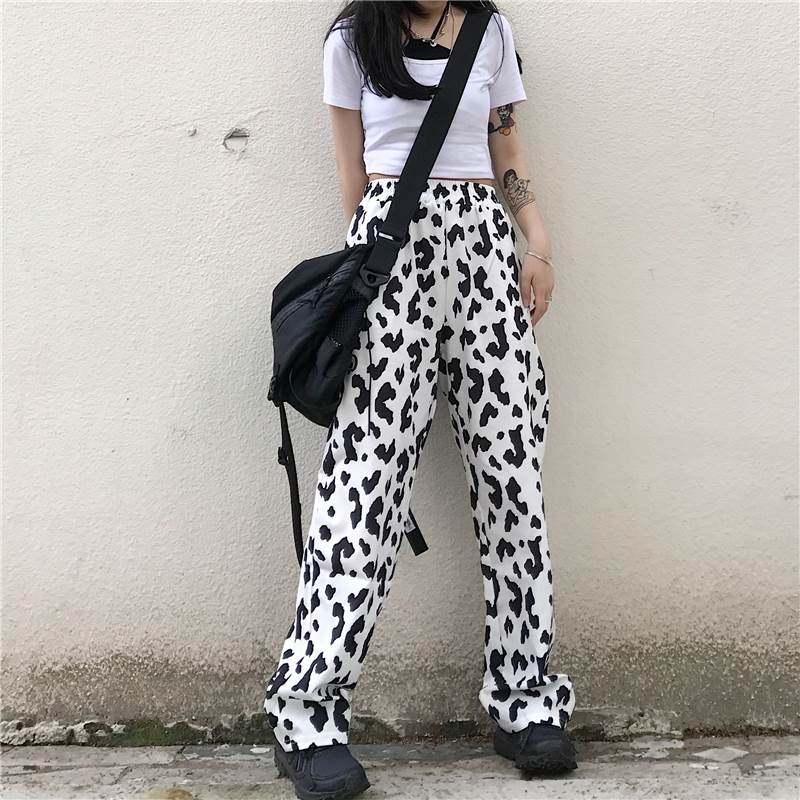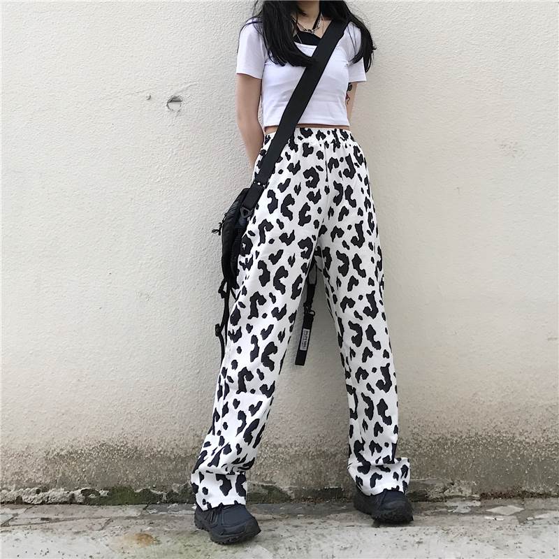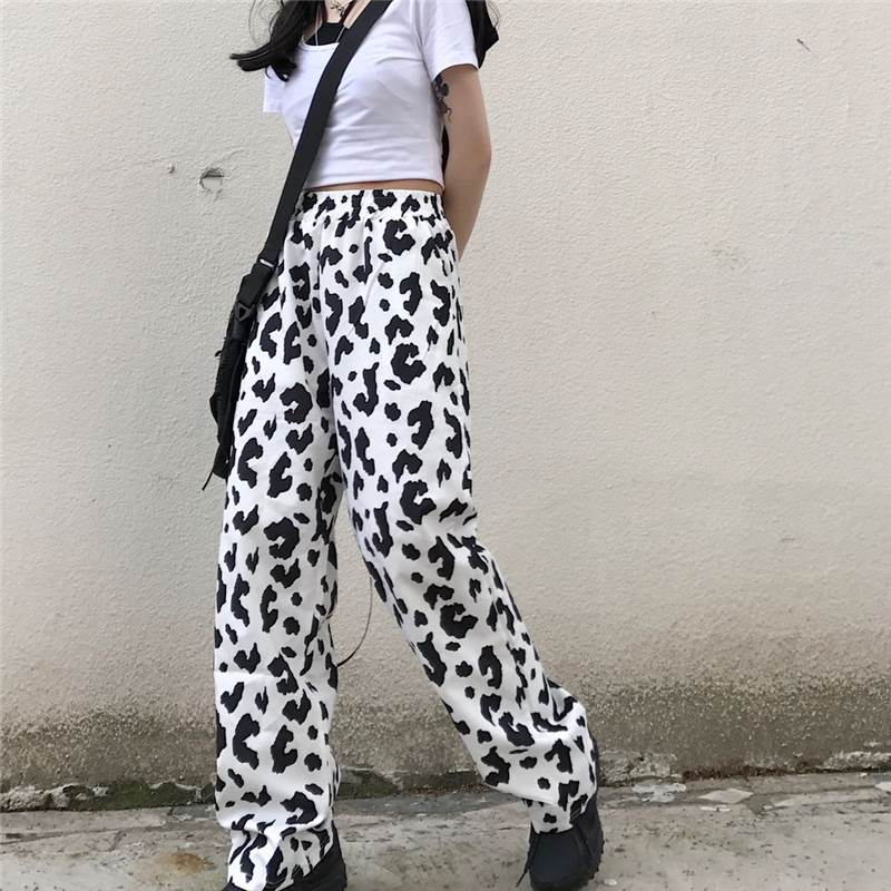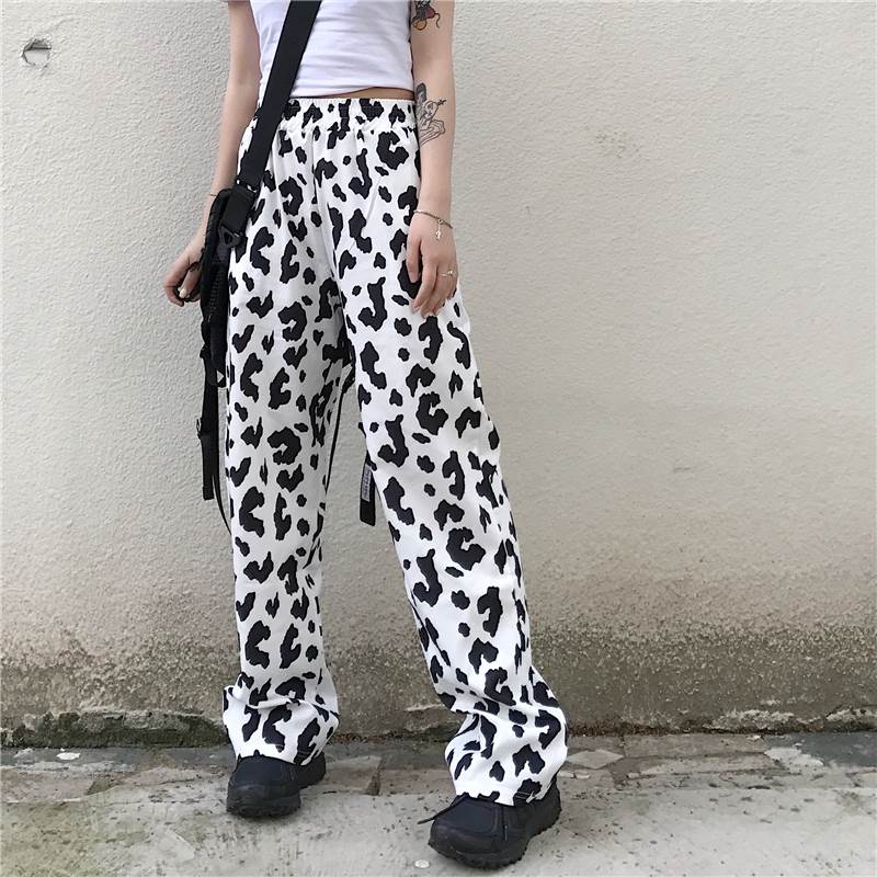 パンツ レディース ボトムス ワイド ズボン 牛柄 モノトーン ウシ 個性的 ユニーク フルレングス ハイウエスト 牛 アニマル 黒 白 春 夏 秋 大きいサイズ カジュアル ストリート モード 大人