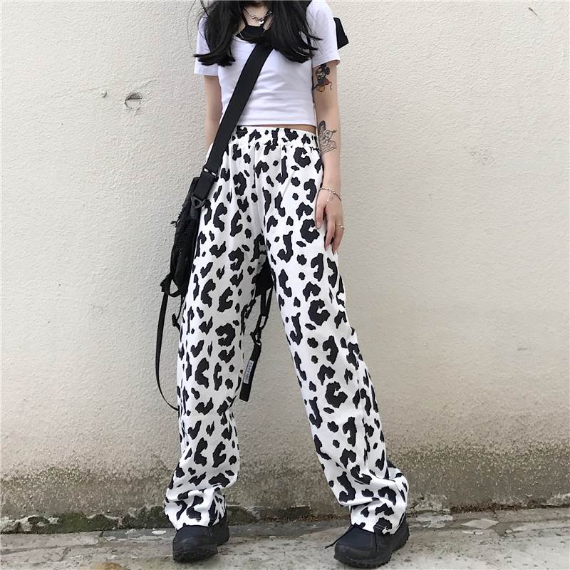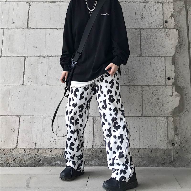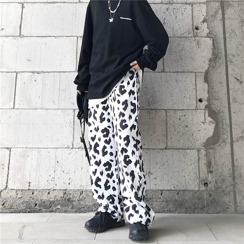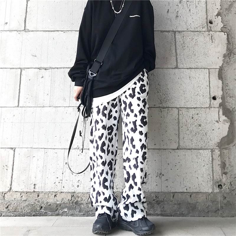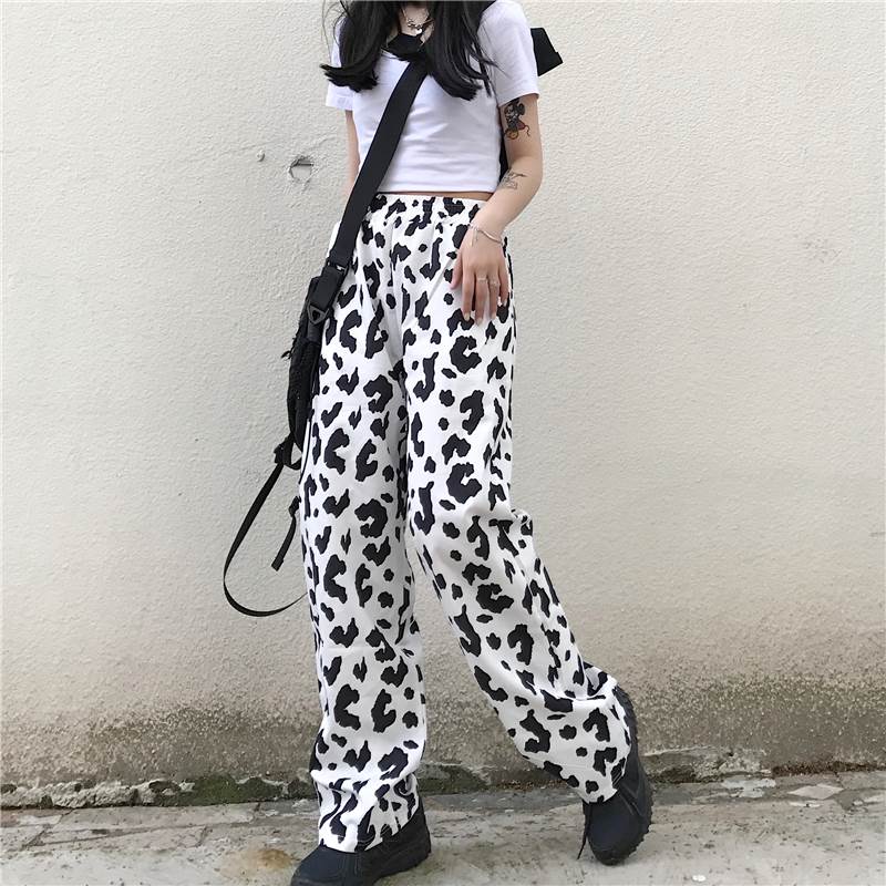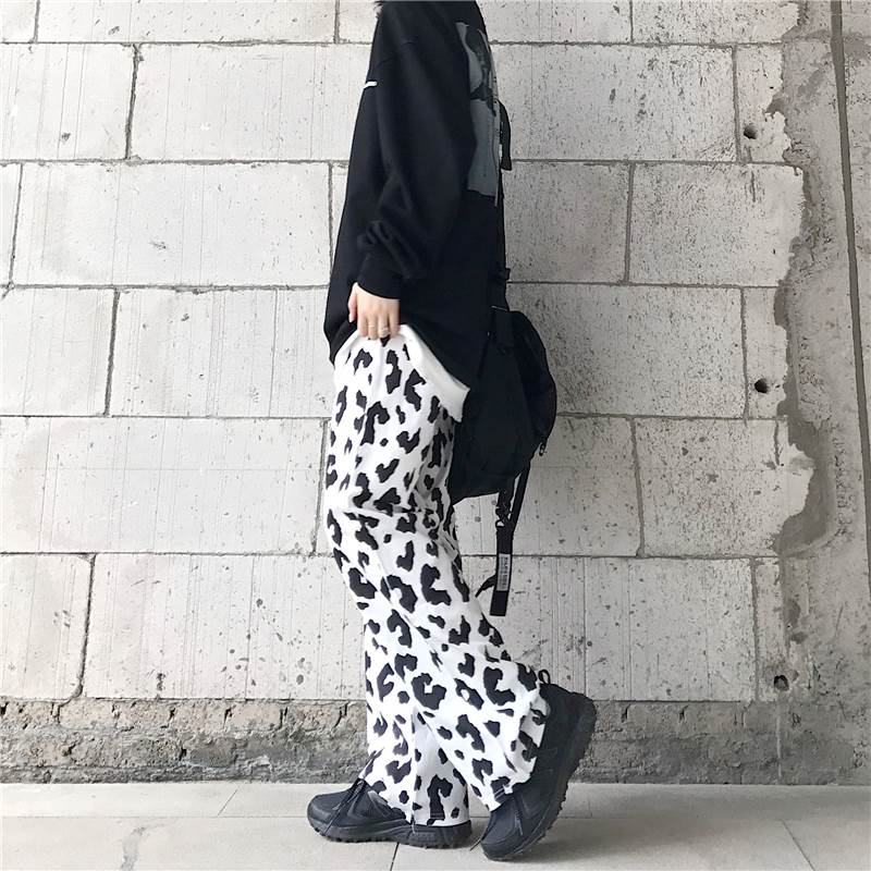パンツ レディース ボトムス ワイド ズボン 牛柄 モノトーン ウシ 個性的 ユニーク フルレングス ハイウエスト 牛 アニマル 黒 白 春 夏 秋 大きいサイズ カジュアル ストリート モード 大人