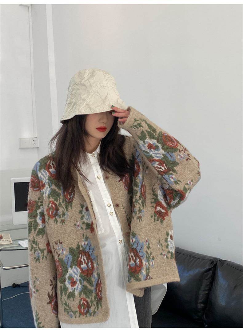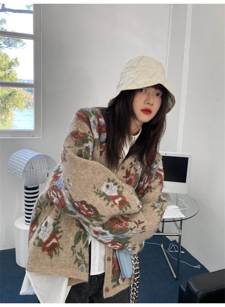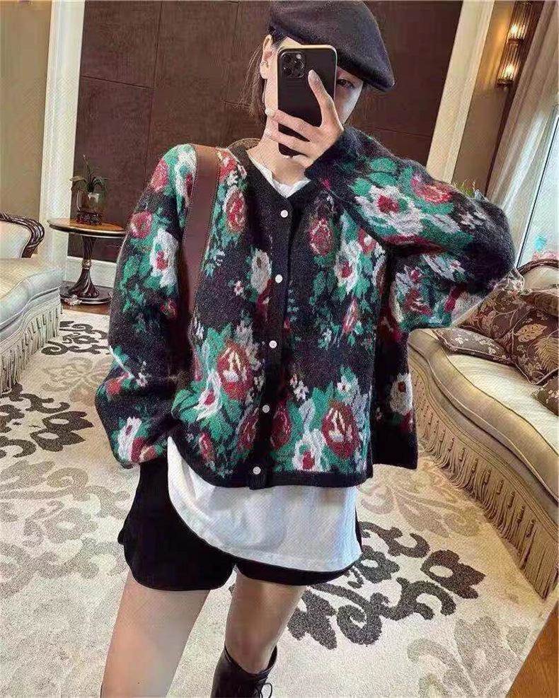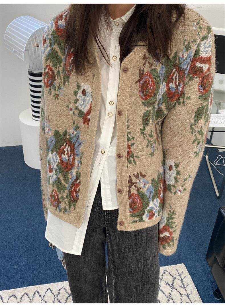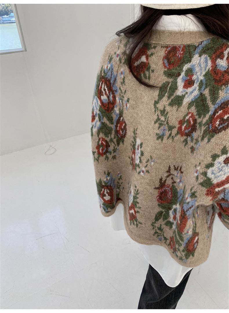 2色 花柄 ニット トップス カーディガン 羽織り アウター 大花柄 ゆったり ルーズ レトロ 着回し シック カジュアル モテる 着痩せ レディース ワンサイズ フリーサイズ 春 冬 サマー オ 秋